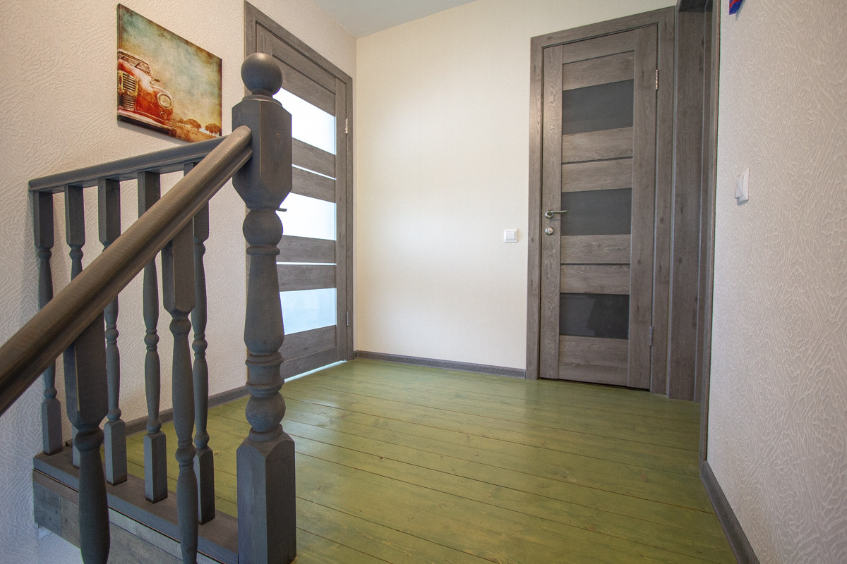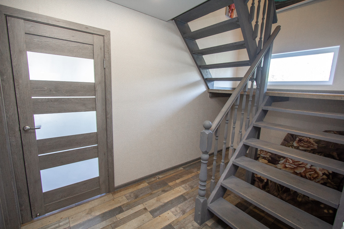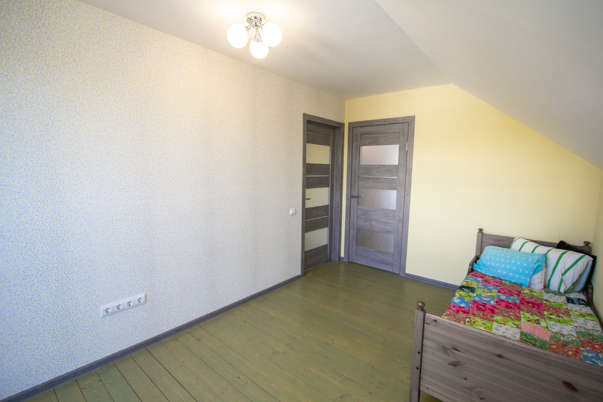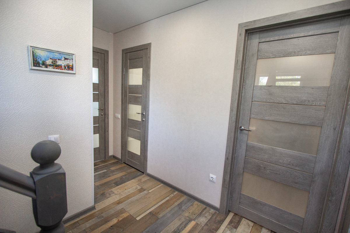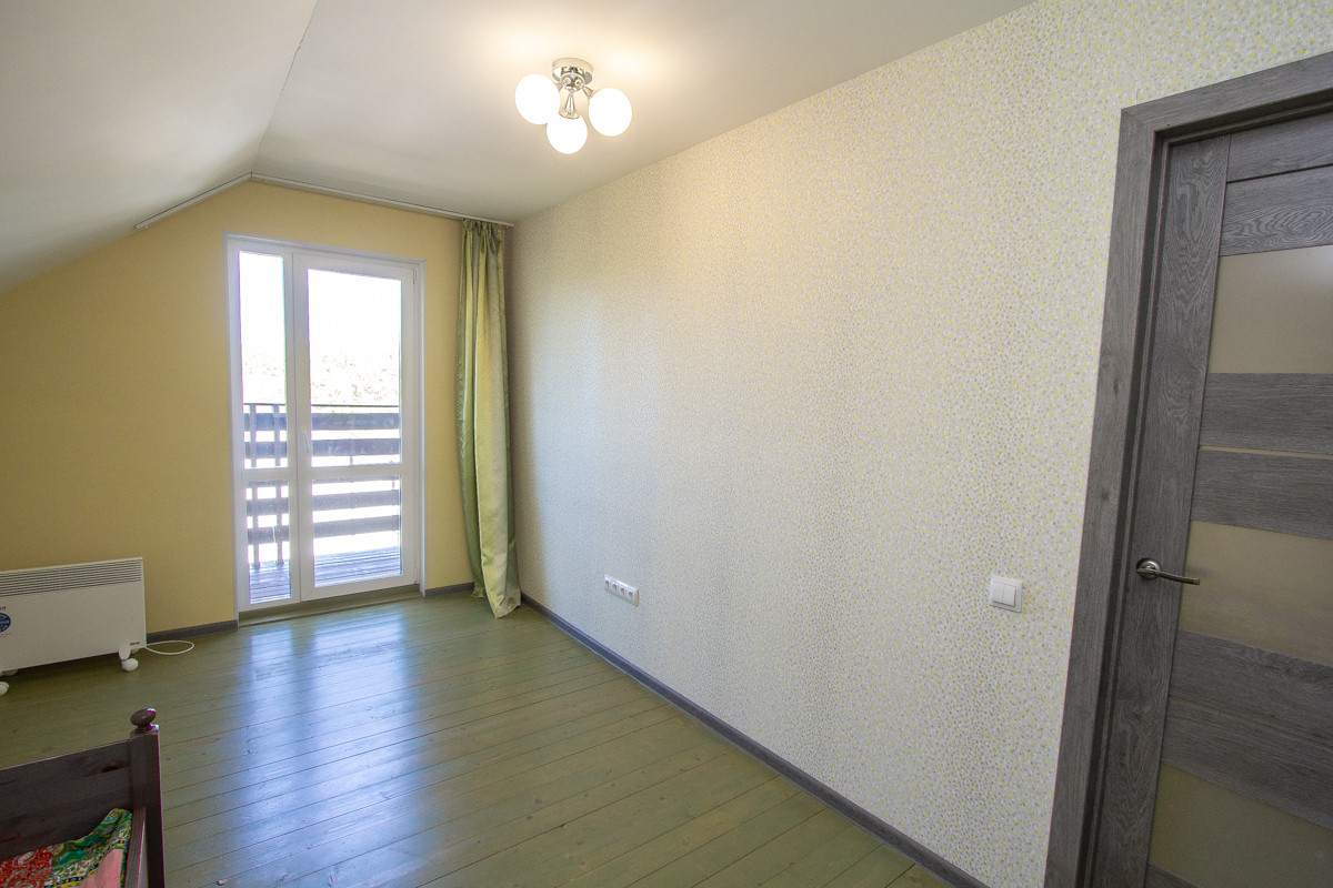 Отделка коттеджа чистовая. На первом этаже потолки натяжные. На втором этаже потолок из гипсокартона. На полу в основном ламинат немецкий 33 класс (коммерческого использования), на втором этаже половая доска покрашенная. Санузел отделан кафелем, обои (дорогие, моющиеся). В доме дверь входная специальная уличная с терморазрывом.