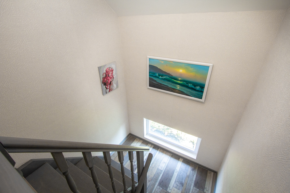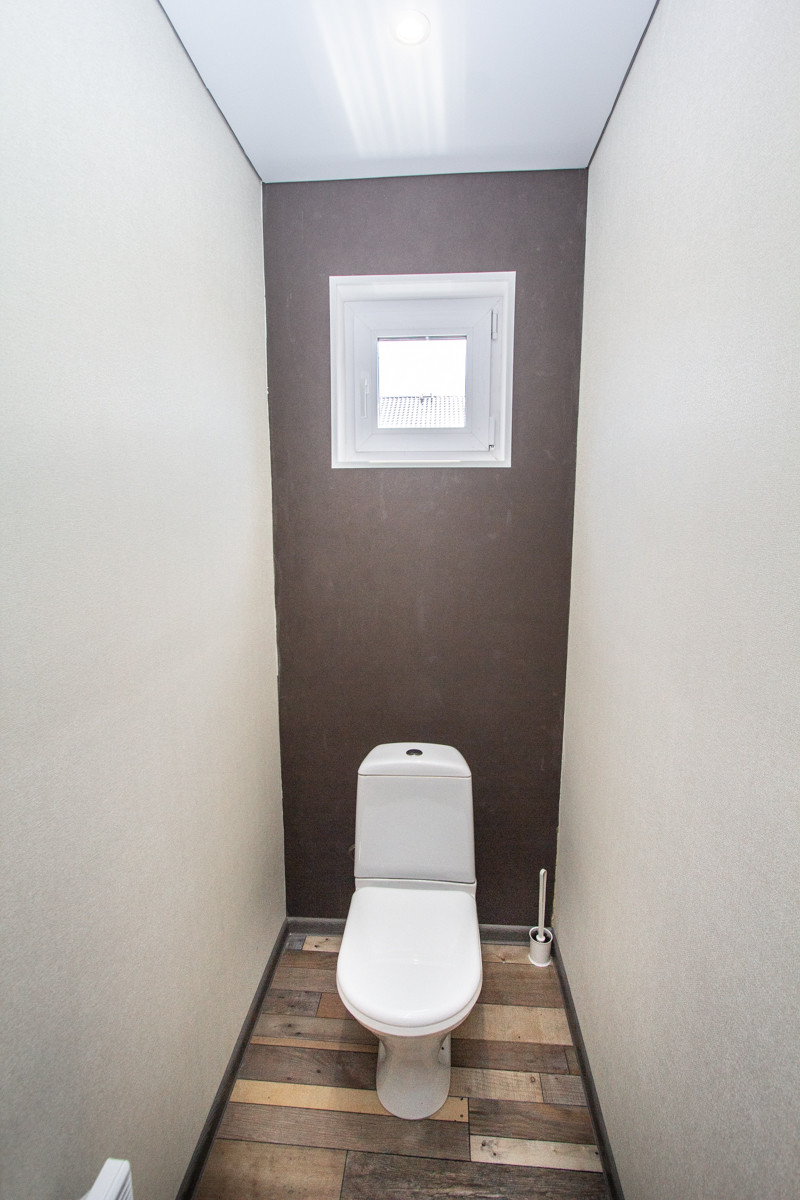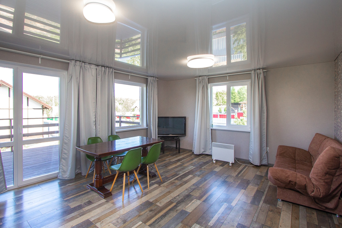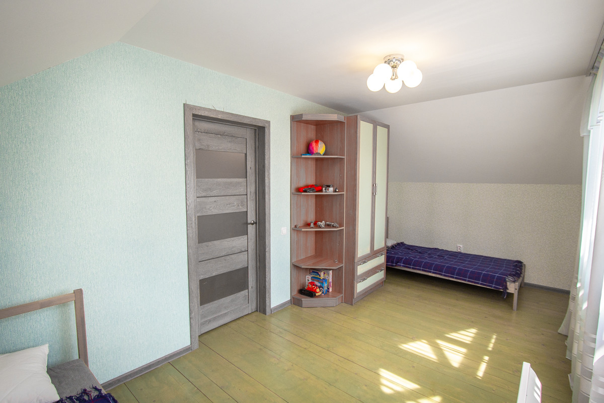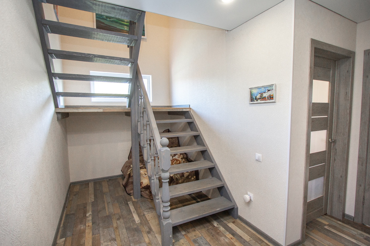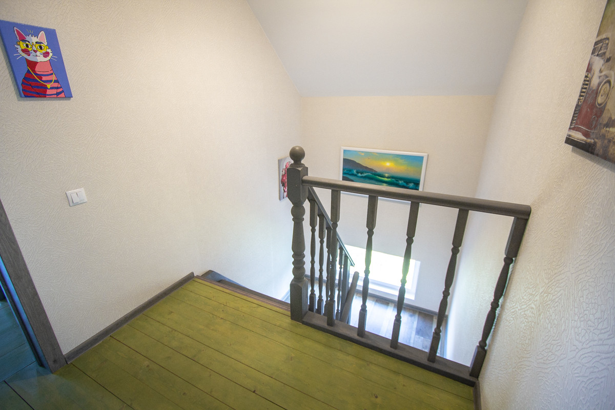 Отделка коттеджа чистовая. На первом этаже потолки натяжные. На втором этаже потолок из гипсокартона. На полу в основном ламинат немецкий 33 класс (коммерческого использования), на втором этаже половая доска покрашенная. Санузел отделан кафелем, обои (дорогие, моющиеся). В доме дверь входная специальная уличная с терморазрывом.