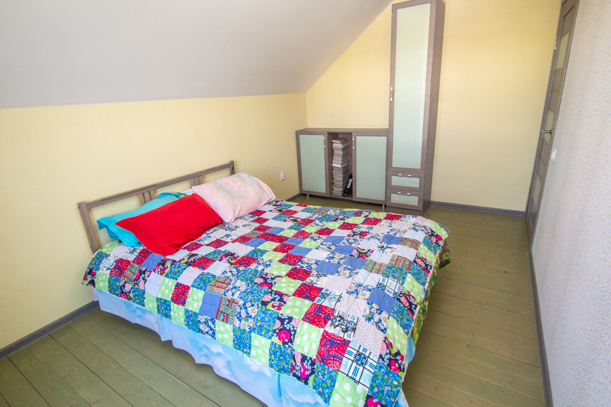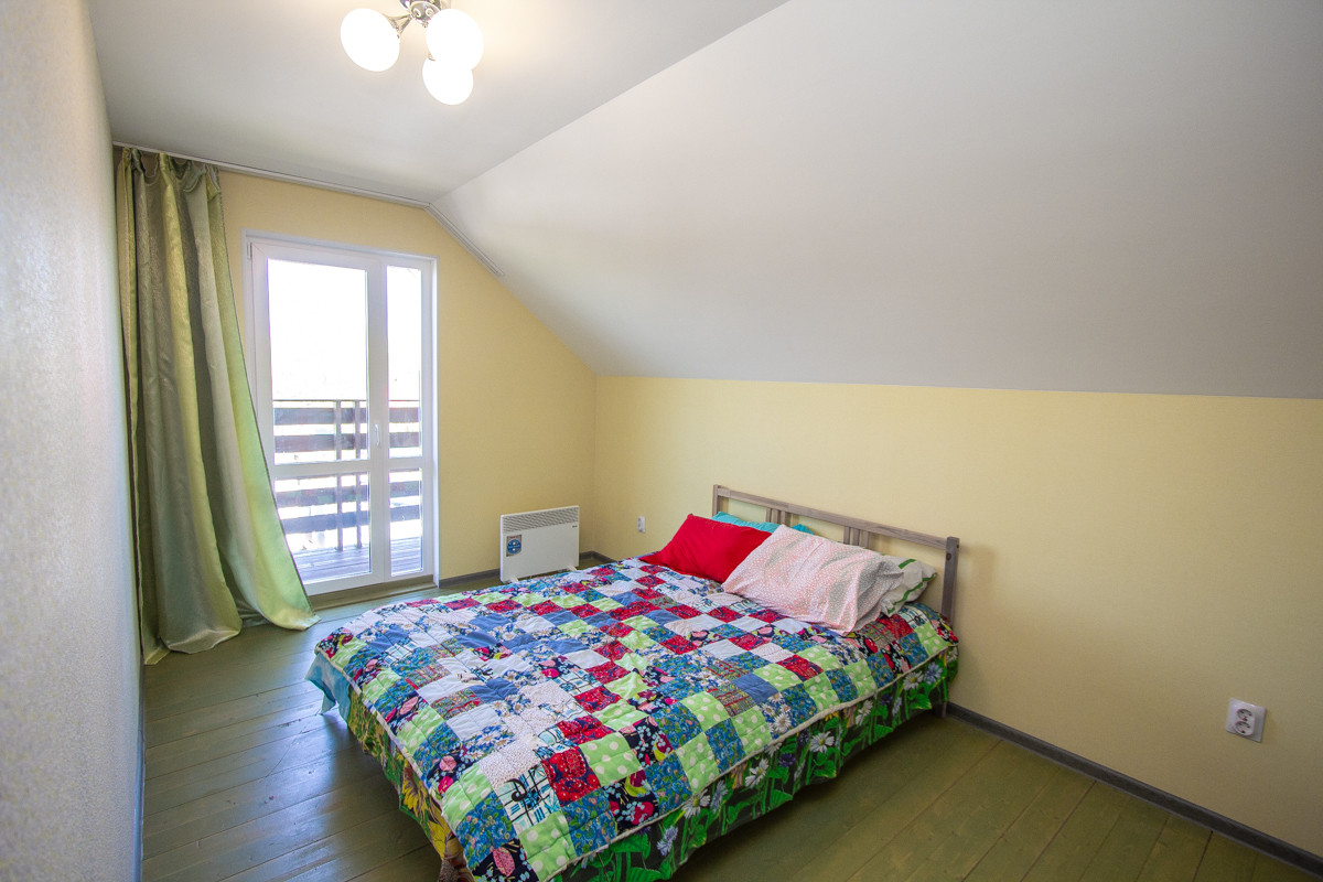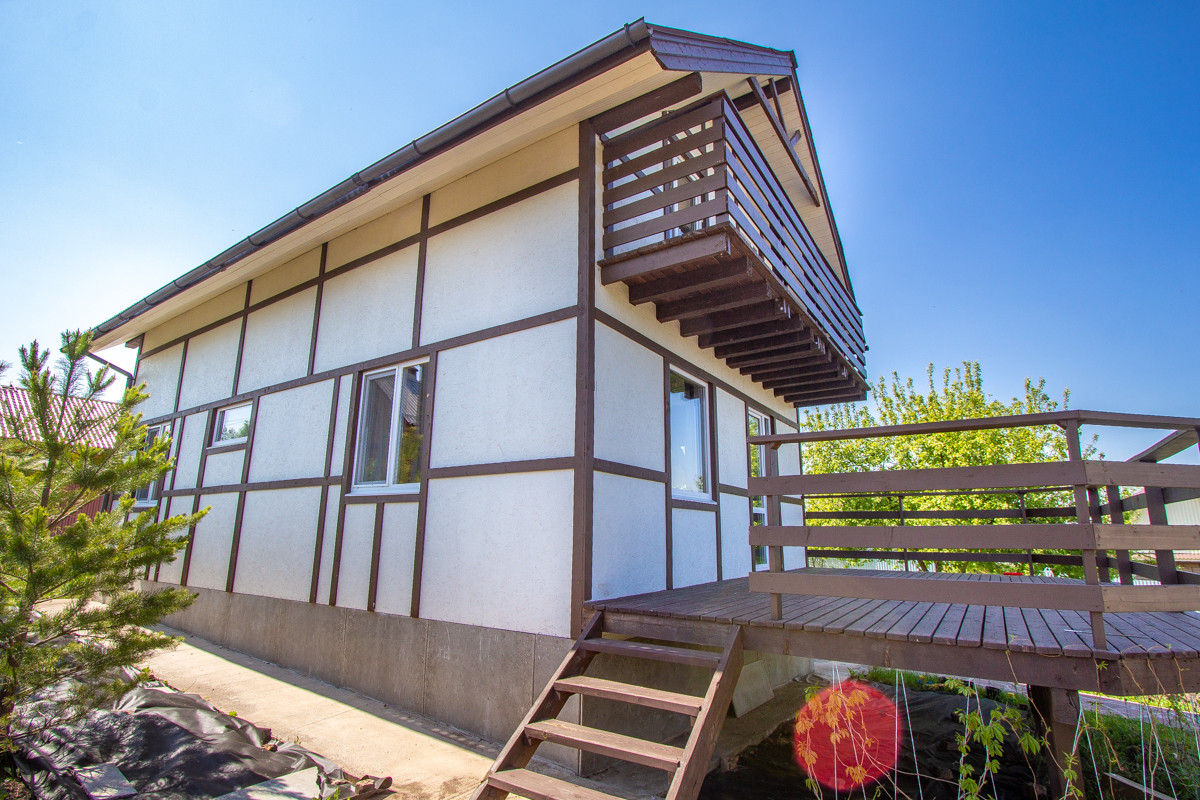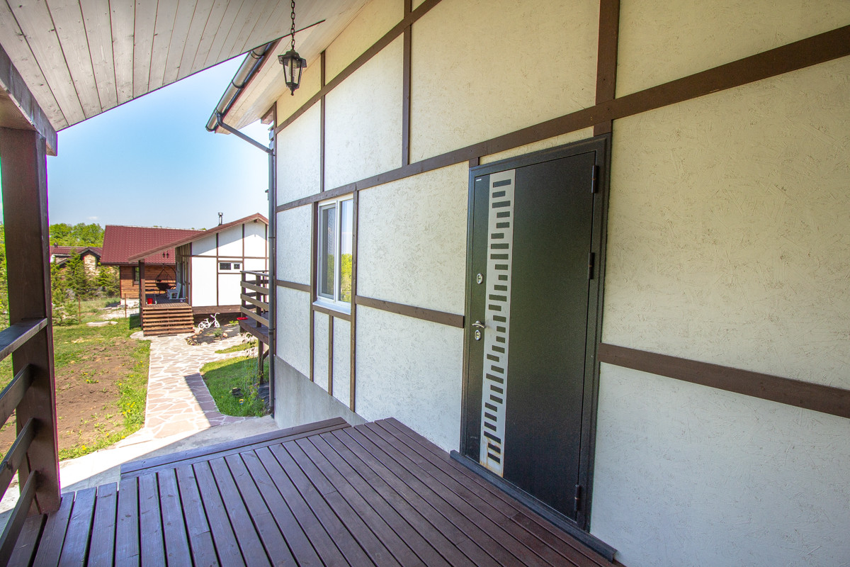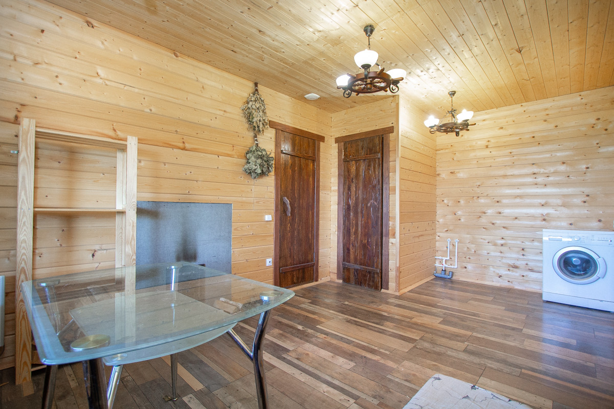 1) Коттедж: построен очень качественно, добротно, с соблюдением всех технологических процессов: фундамент забивные сваи, потом обвязка брус 200*200. Утепление полов снизу 200 мм. Стены Брус + технологичное наполнение утеплителем 200 мм (150мм и 50 мм перекрестное), обшиты полностью гипсокартоном 12.5 мм, на него поклеены обои. Дом и баня снаружи обшиты ОСБ плитой, который покрашен краской Tikkurila Винха и сделана раскладка типа вахверк. Дом и банный комплекс в одном стиле. Утепление крыши в доме 250 по чердаку, 200 по скатам. Крыша покрыта Ондулином: не стучит от дождя, снег лежит и не скатывается лавиной. Окна в доме профиль 70 мм, двухкамерные (3 стекла) с энергосбережением, профиль proplex.