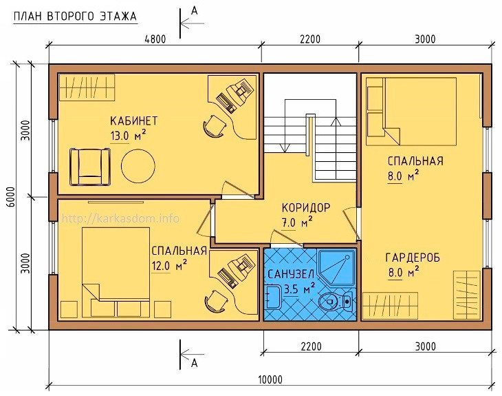 - 2 этаж – 57,5 кв.м. Лестница на 2й этаж приводит к небольшому холлу 7 кв.м., на 2м этаже 3 РАЗДЕЛЬНЫЕ спальни: спальня 12 кв.м. и 13 кв.м. имеют выход на большой балкон 6 кв.м., кладовка 3,5 кв.м. (со всеми коммуникациями для санузла) и спальня 16 кв.м.