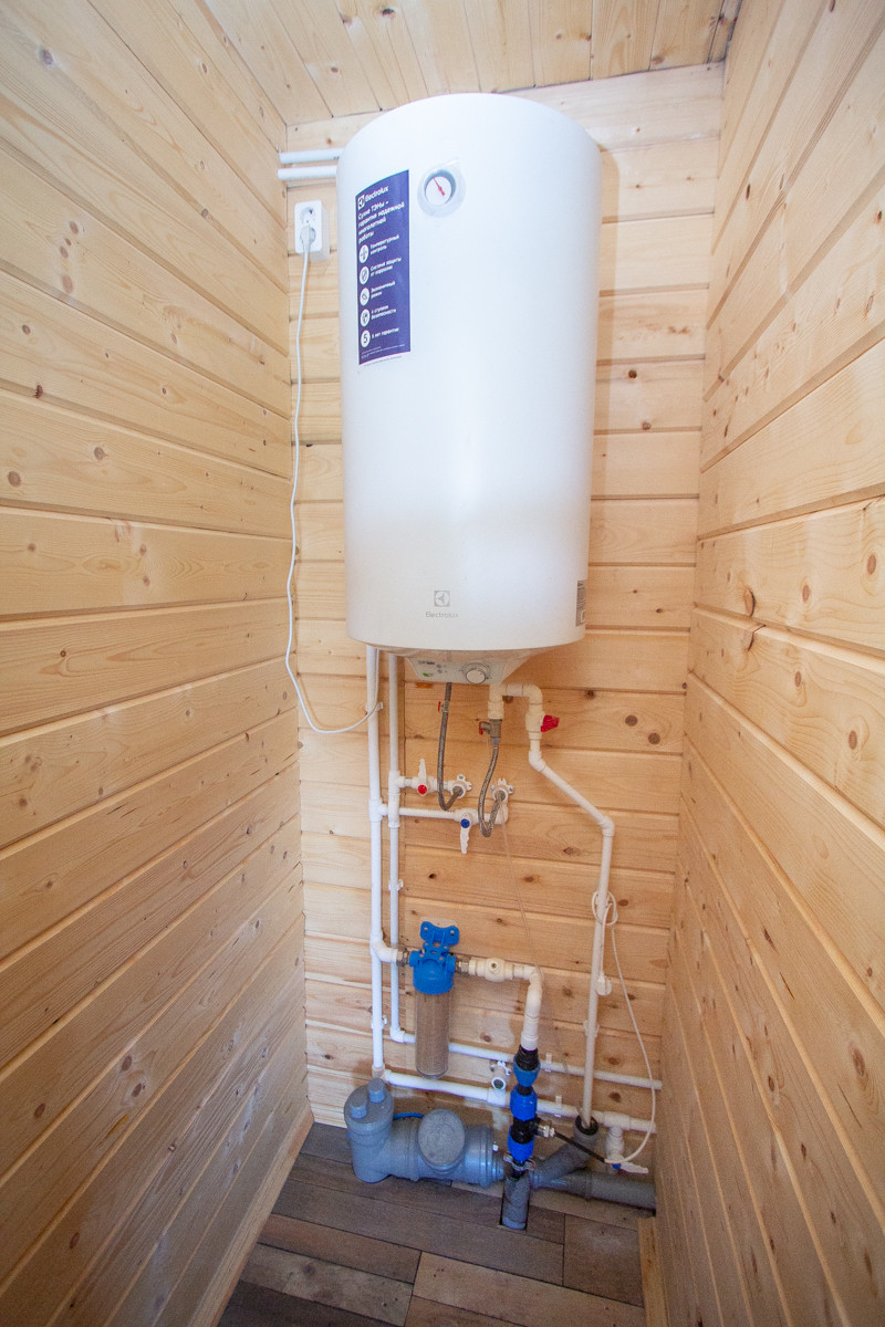 Система труб подачи воды сделана так, что можно слить воду из бани полностью (из бойлера в том числе) и оставить баню без отопления. Так же на вводной трубе в дом и в баню сделаны греющие кабели, на случай если «подморозит»