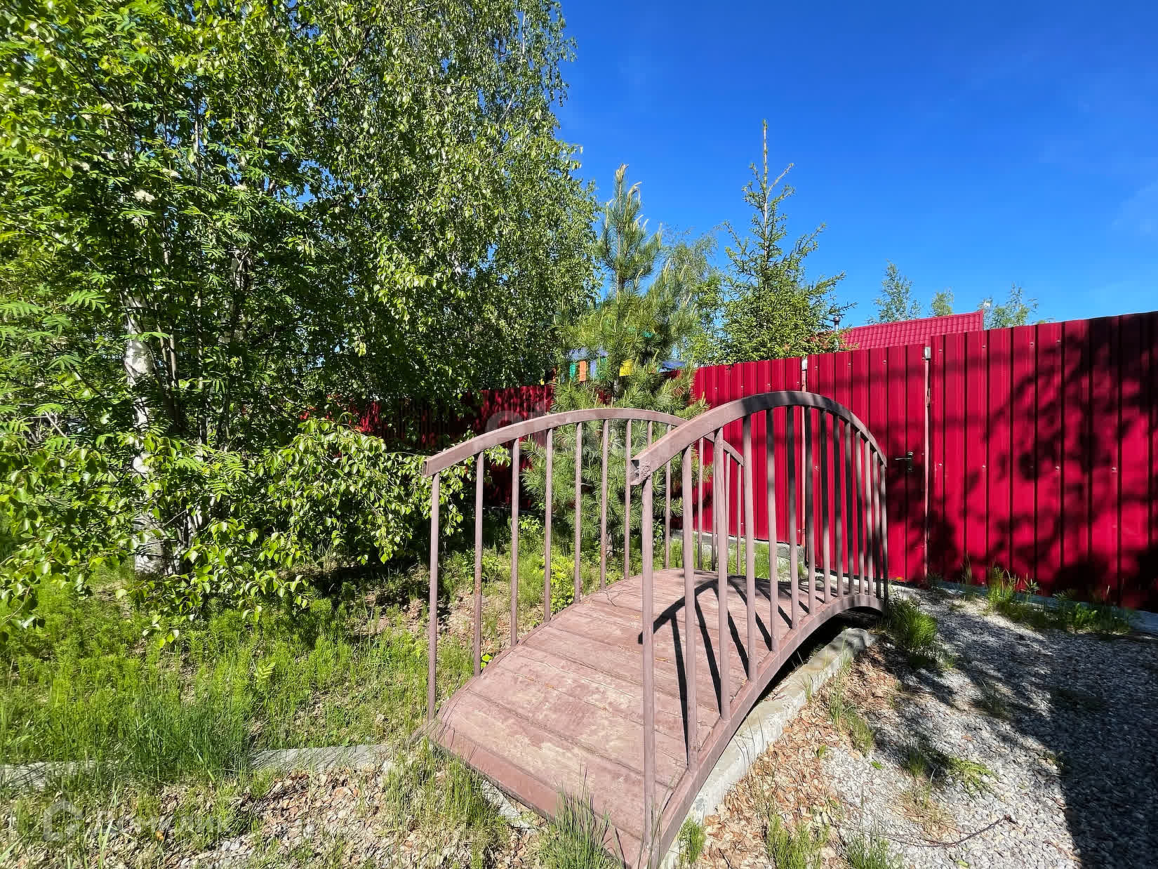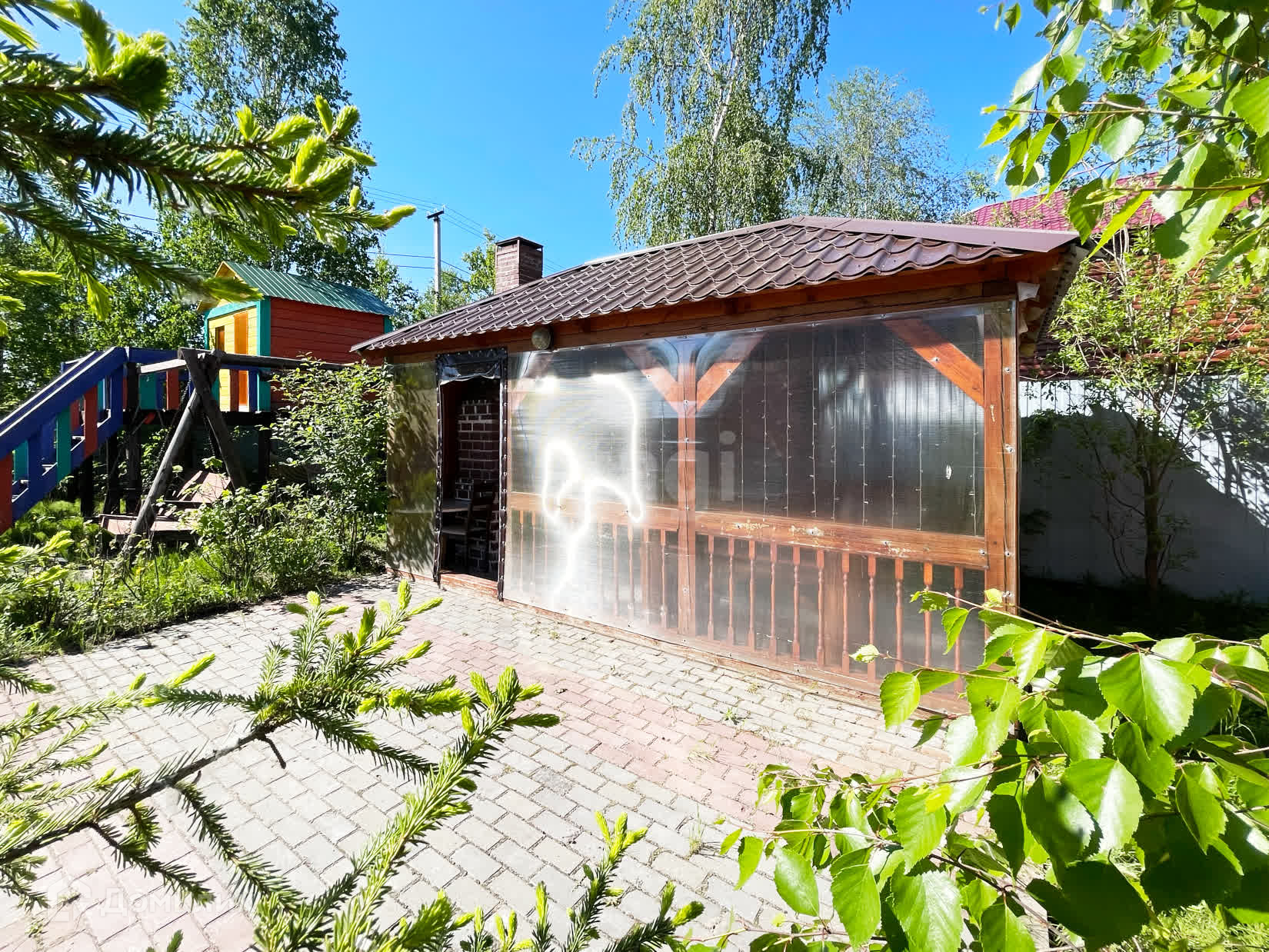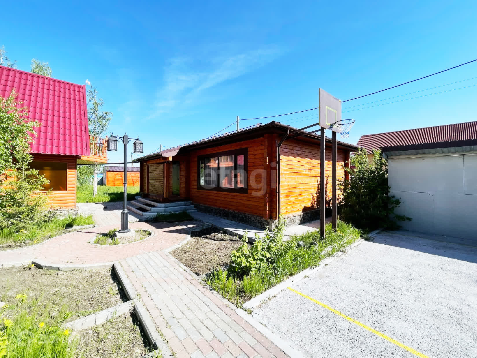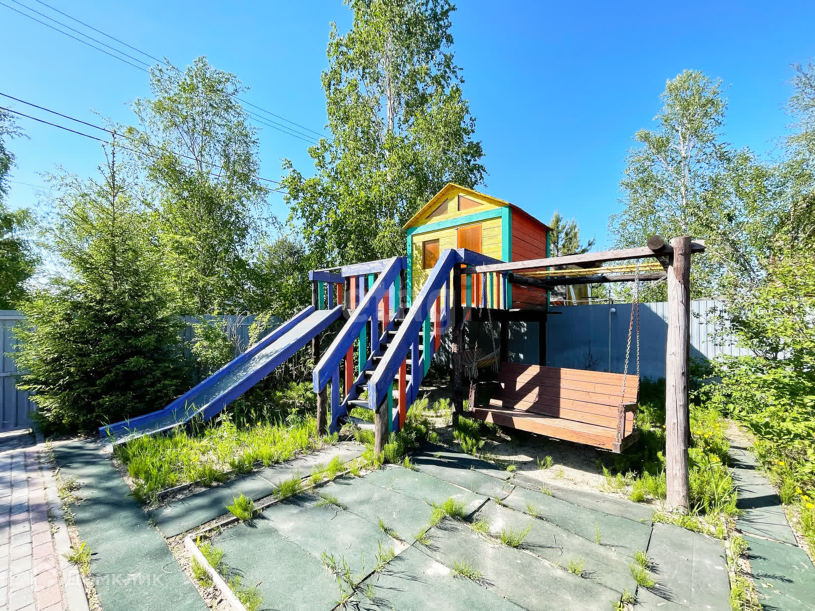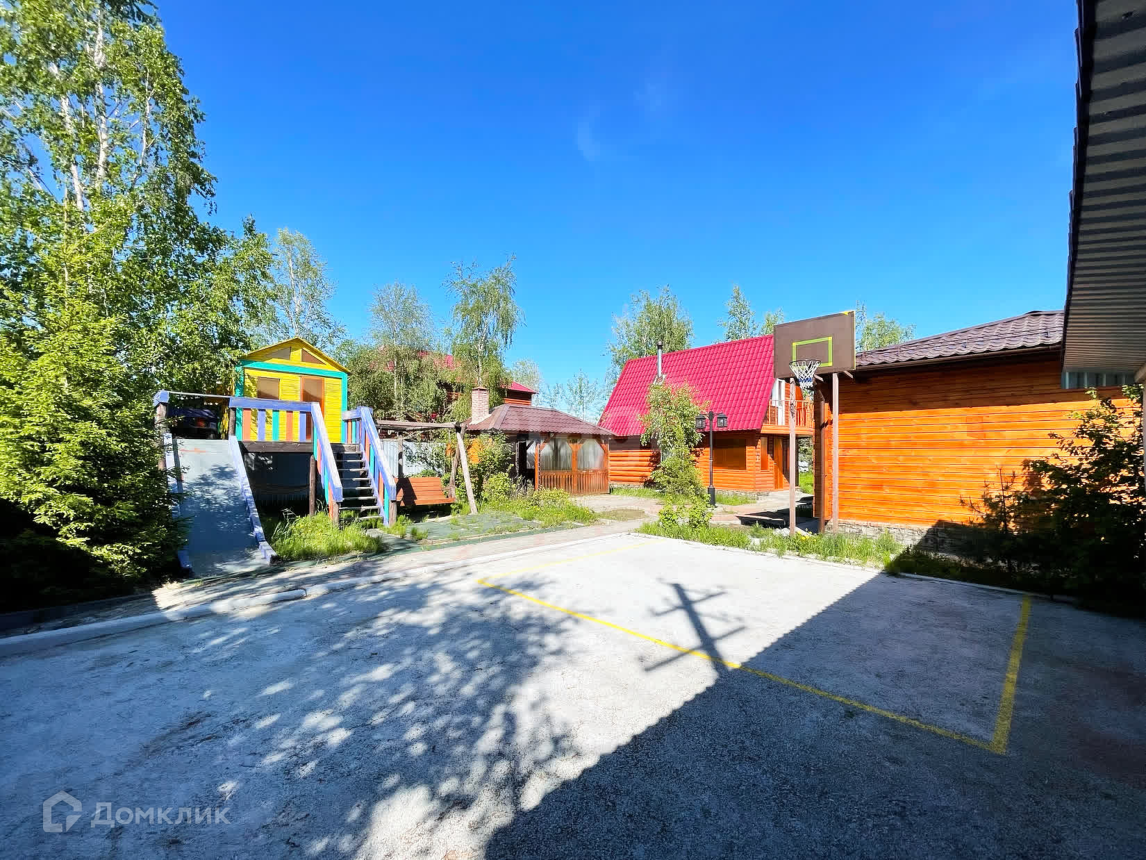 Детский городок: домик, качели, гамак, горка, баскетбольная площадка.