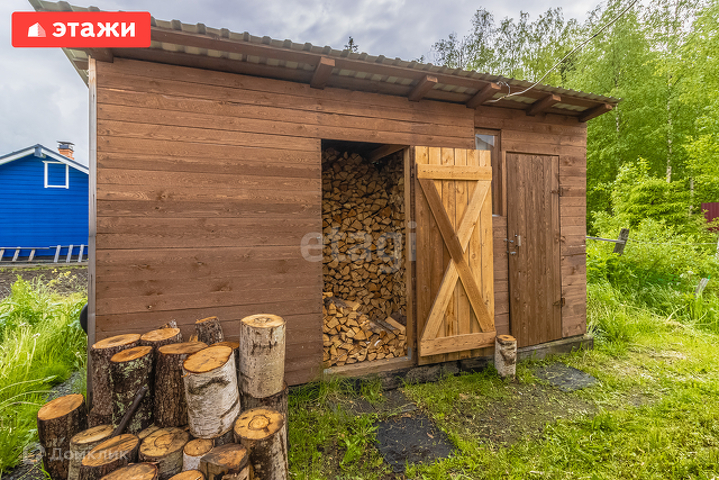 Хоз.блок 5 на 3.7 м. отделан вагонкой. Рядом второй хоз.блок (заполнен дровами) и туалет.