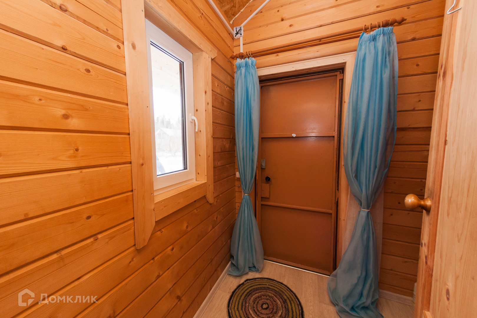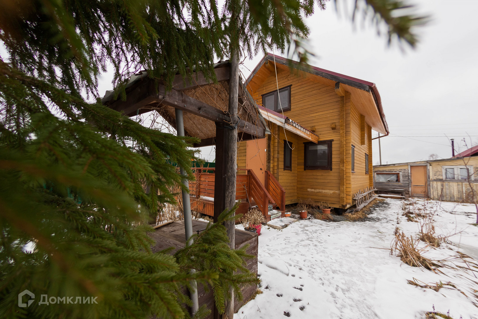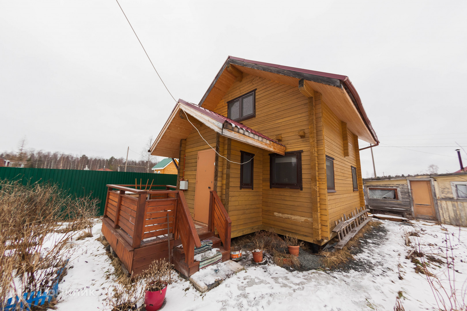 Дом построен из профилированного бруса, установлен на фундамент из винтовых свай. Крыльцо выполнено из террасной доски. Крыша из металлочерепицы.