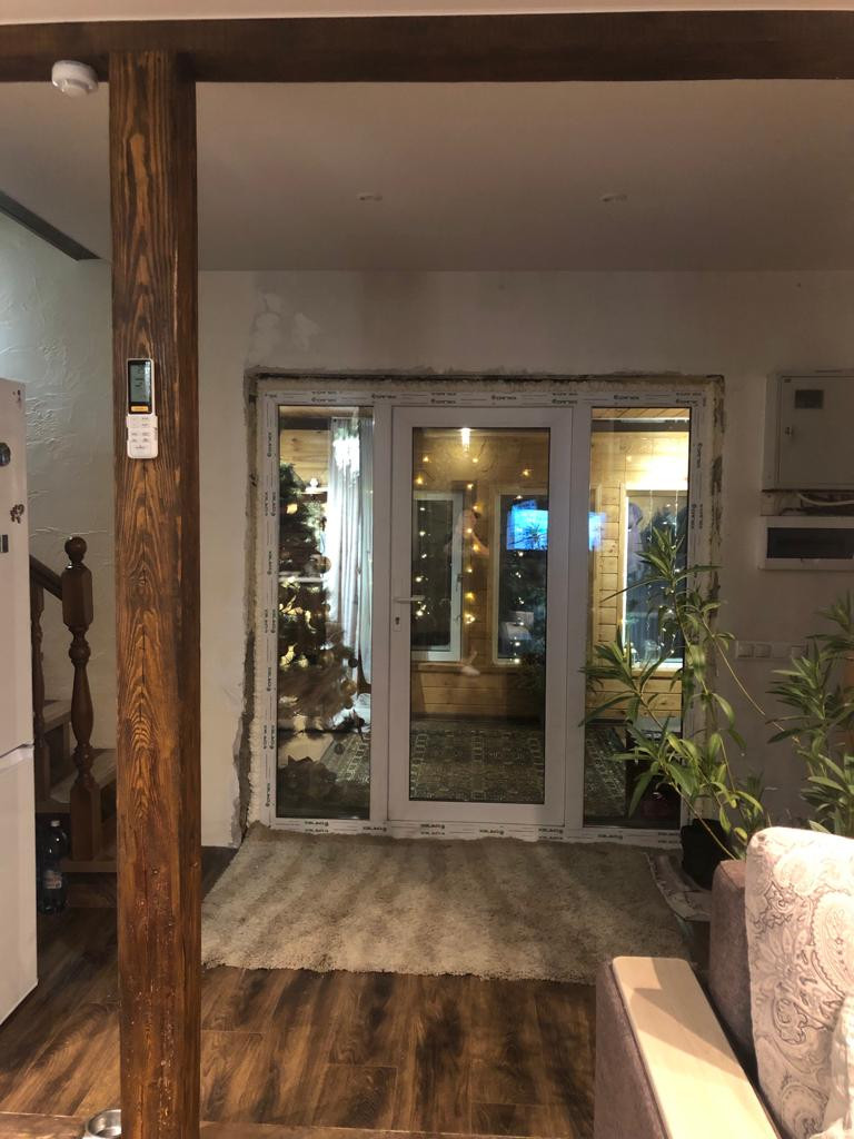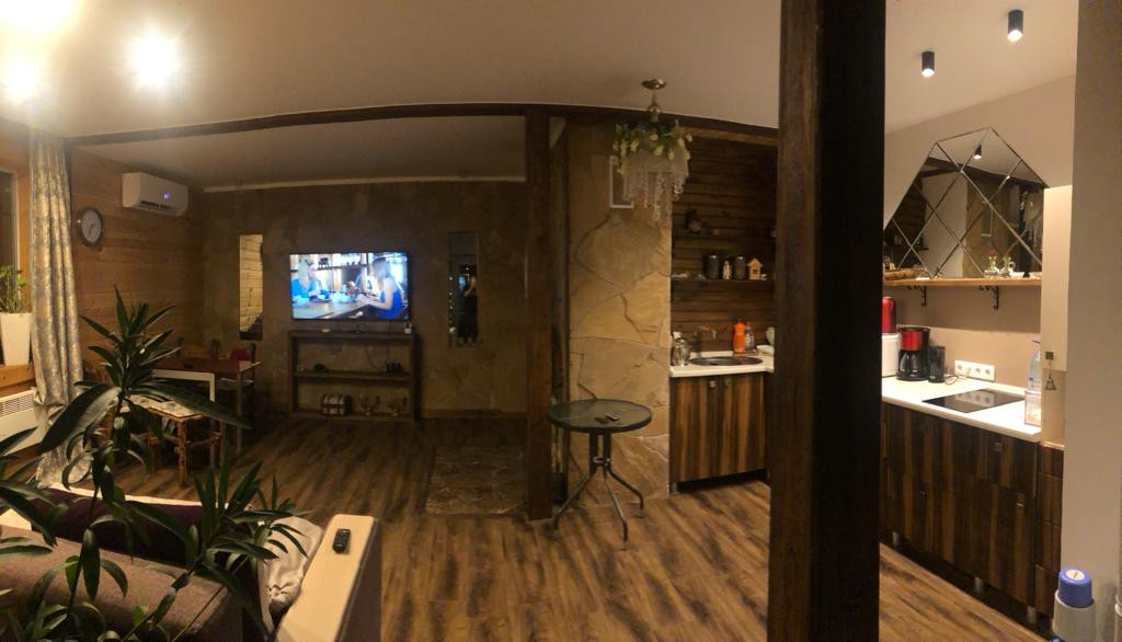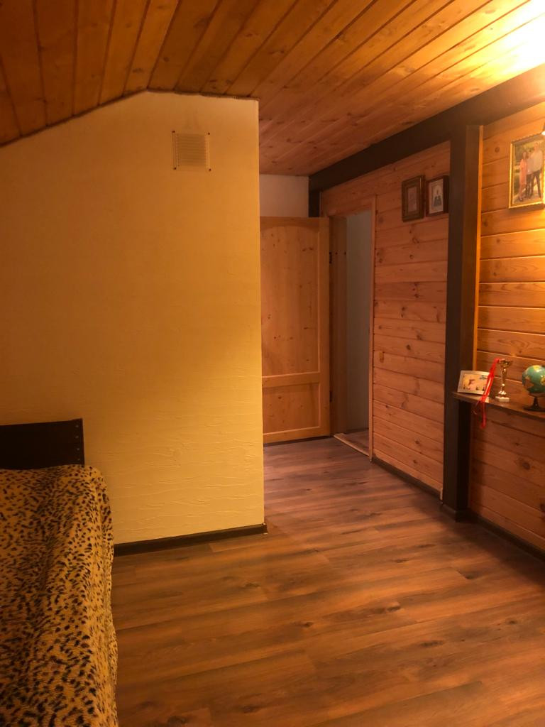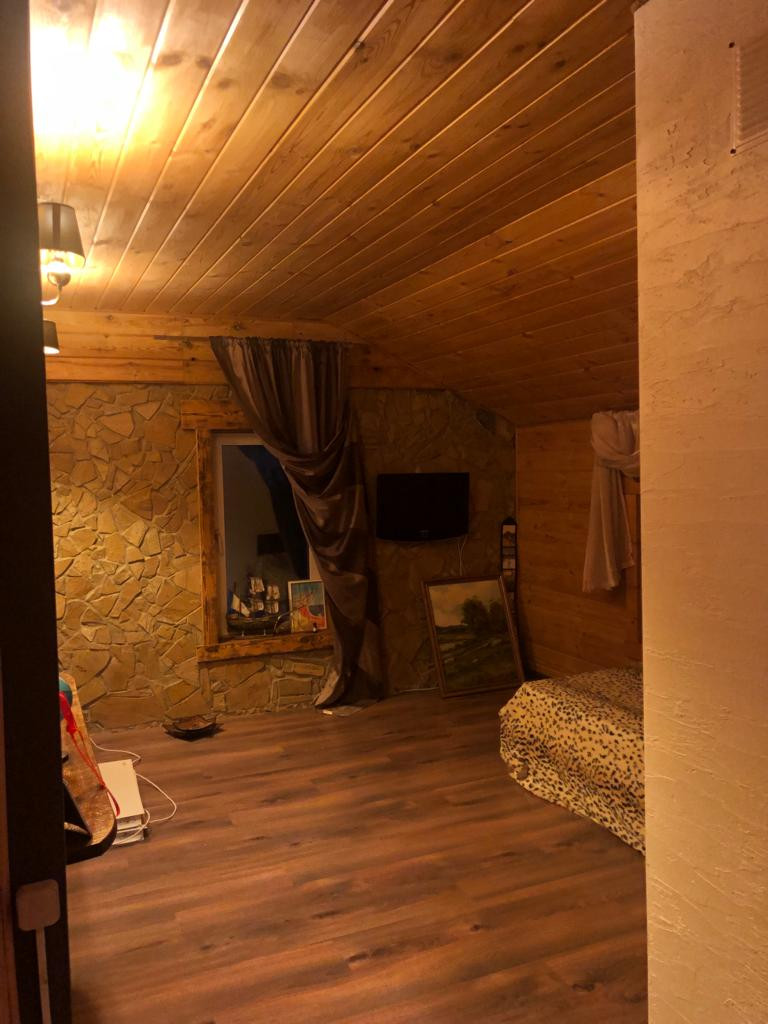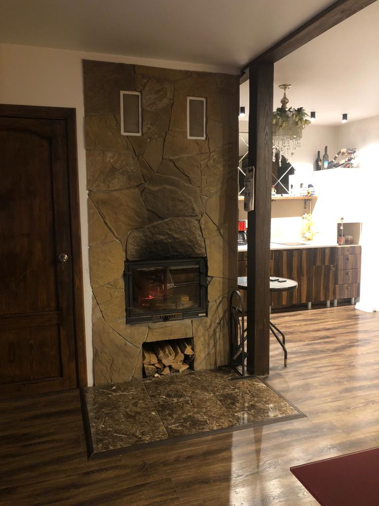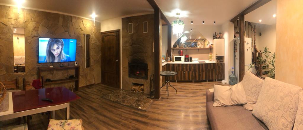 Дом из пеноблока с утеплением толщина 40 см, обшит имитация бруса;есть канализация; камин со стеклянной дверцей; электрическая плита; кухня; стены отделаны декоративной штукатуркой, натур камнем( плетняком) и деревом; потолок натяжной, пол ламинат; отопление-сплит система, обогреватели, камин-дрова, пеллеты.