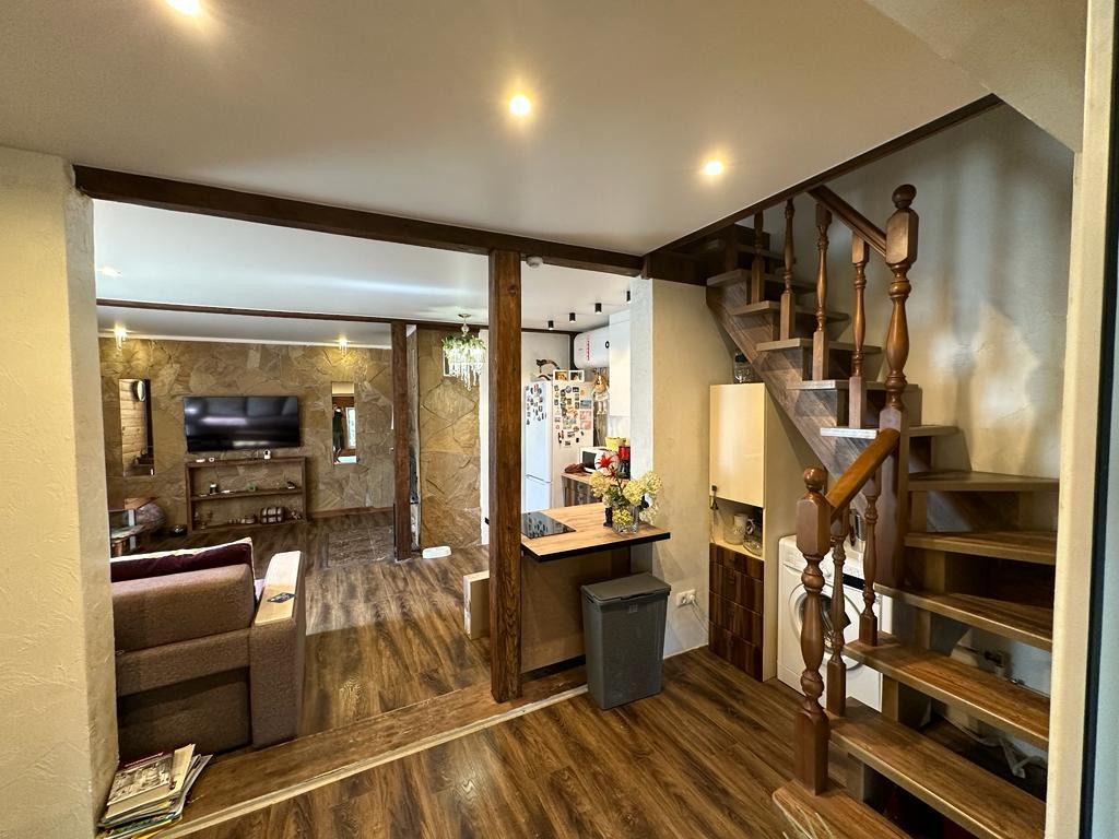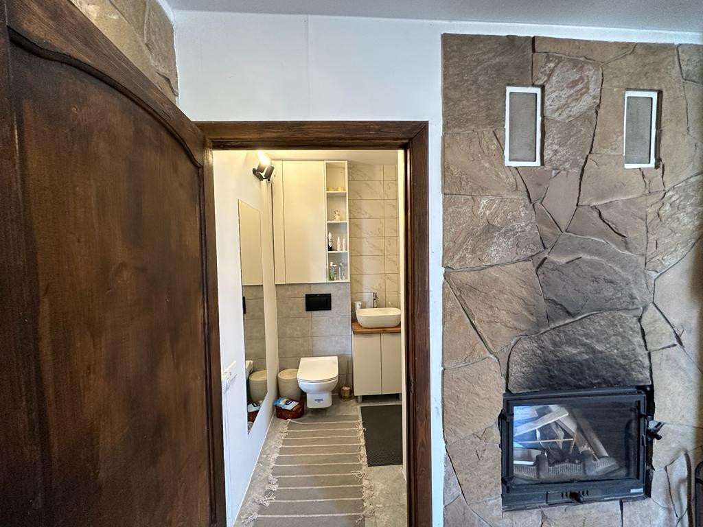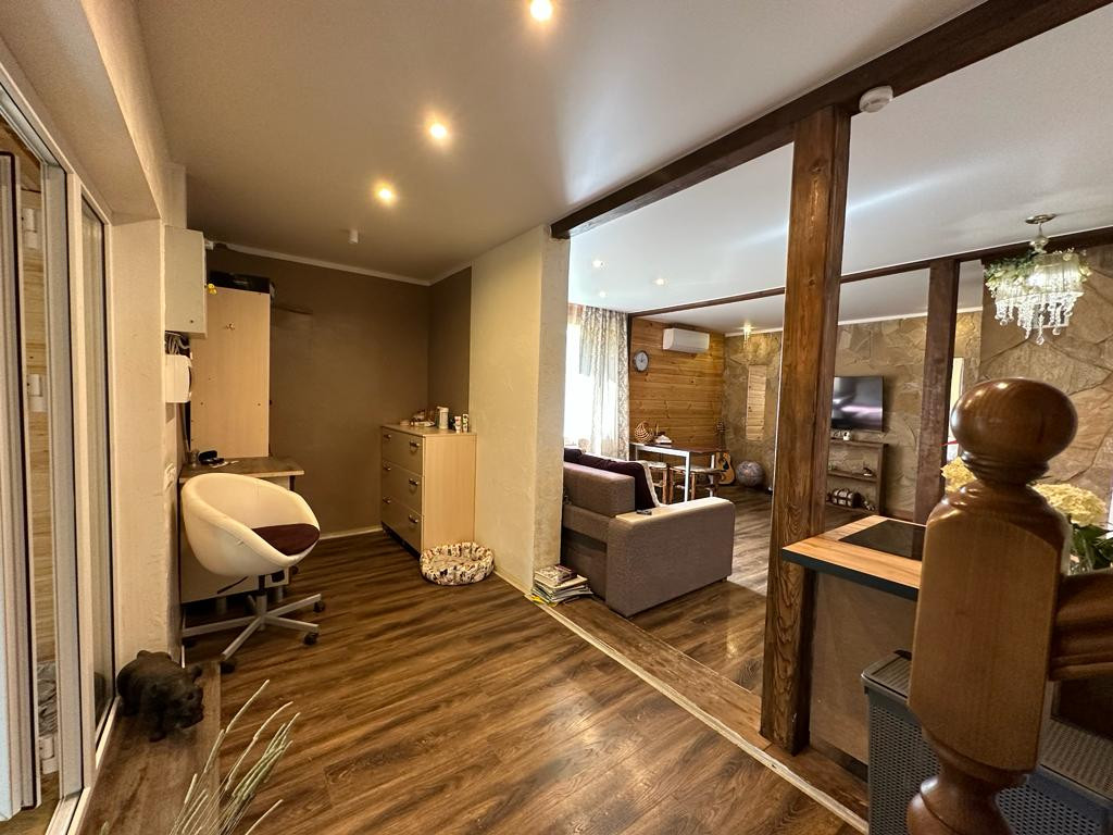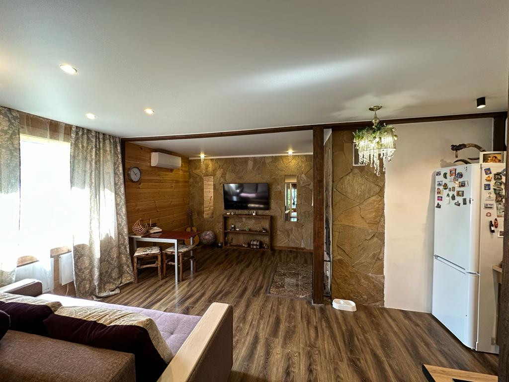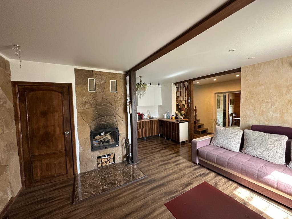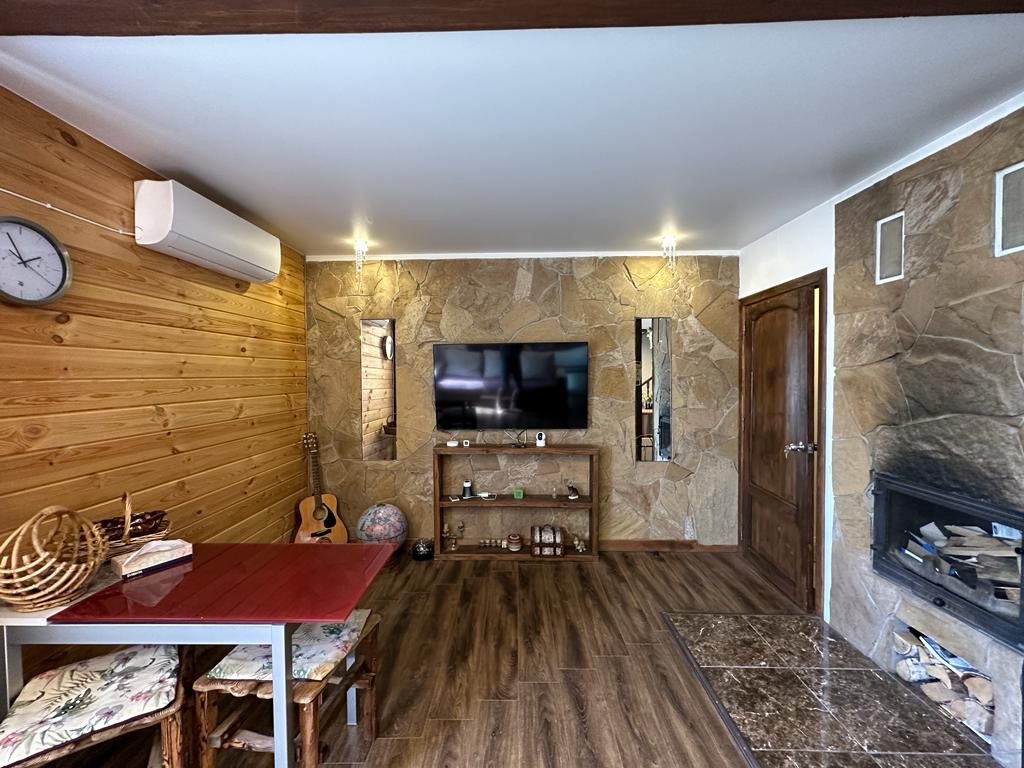 Дом из пеноблока с утеплением толщина 40 см, обшит имитация бруса;есть канализация; камин со стеклянной дверцей; электрическая плита; кухня; стерильная машинка; холодильник. Стены отделаны декоративной штукатуркой, натур камнем( плетняком) и деревом; потолок натяжной, пол ламинат; отопление-сплит система, обогреватели, камин-дрова, пеллеты.