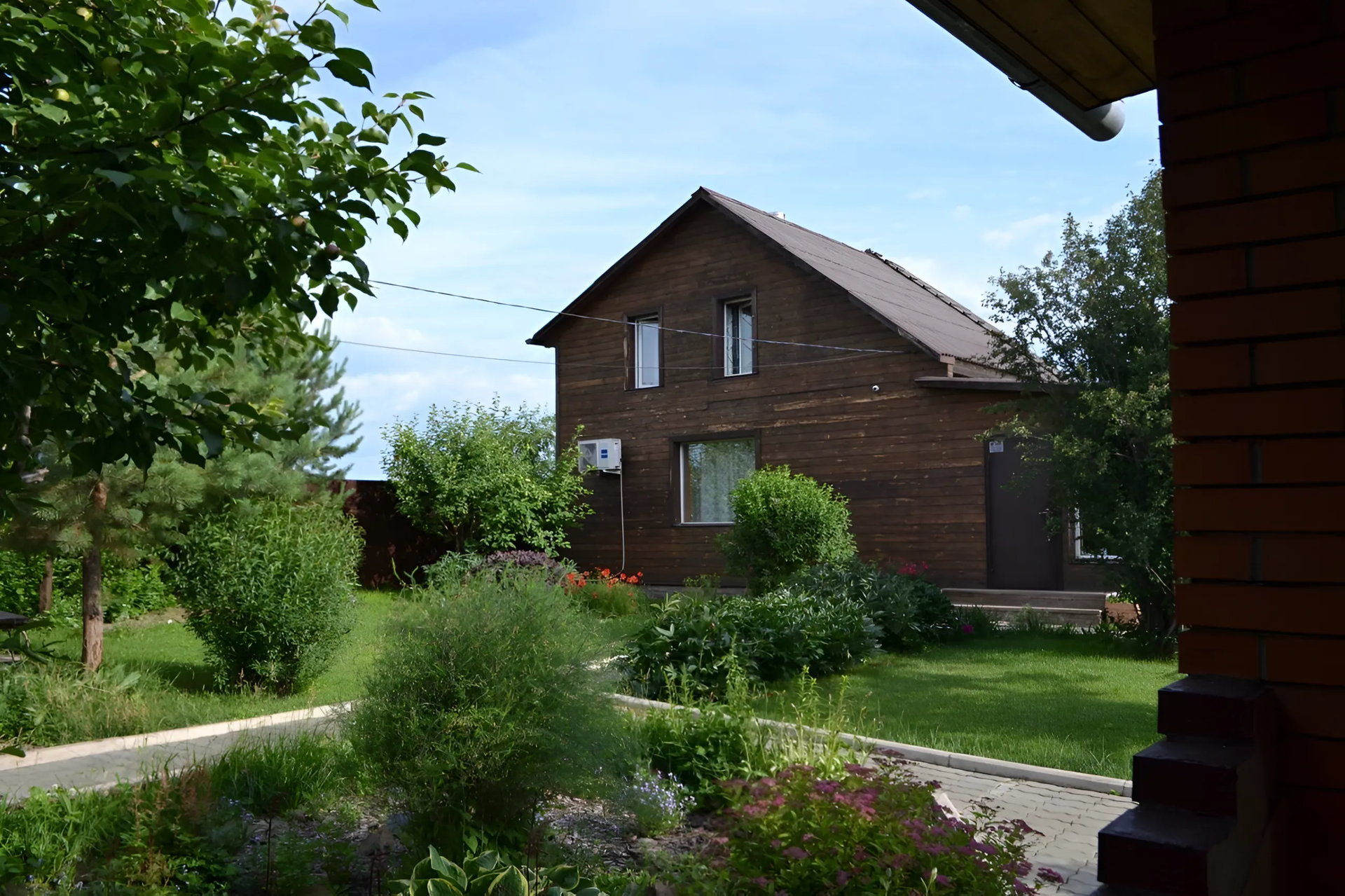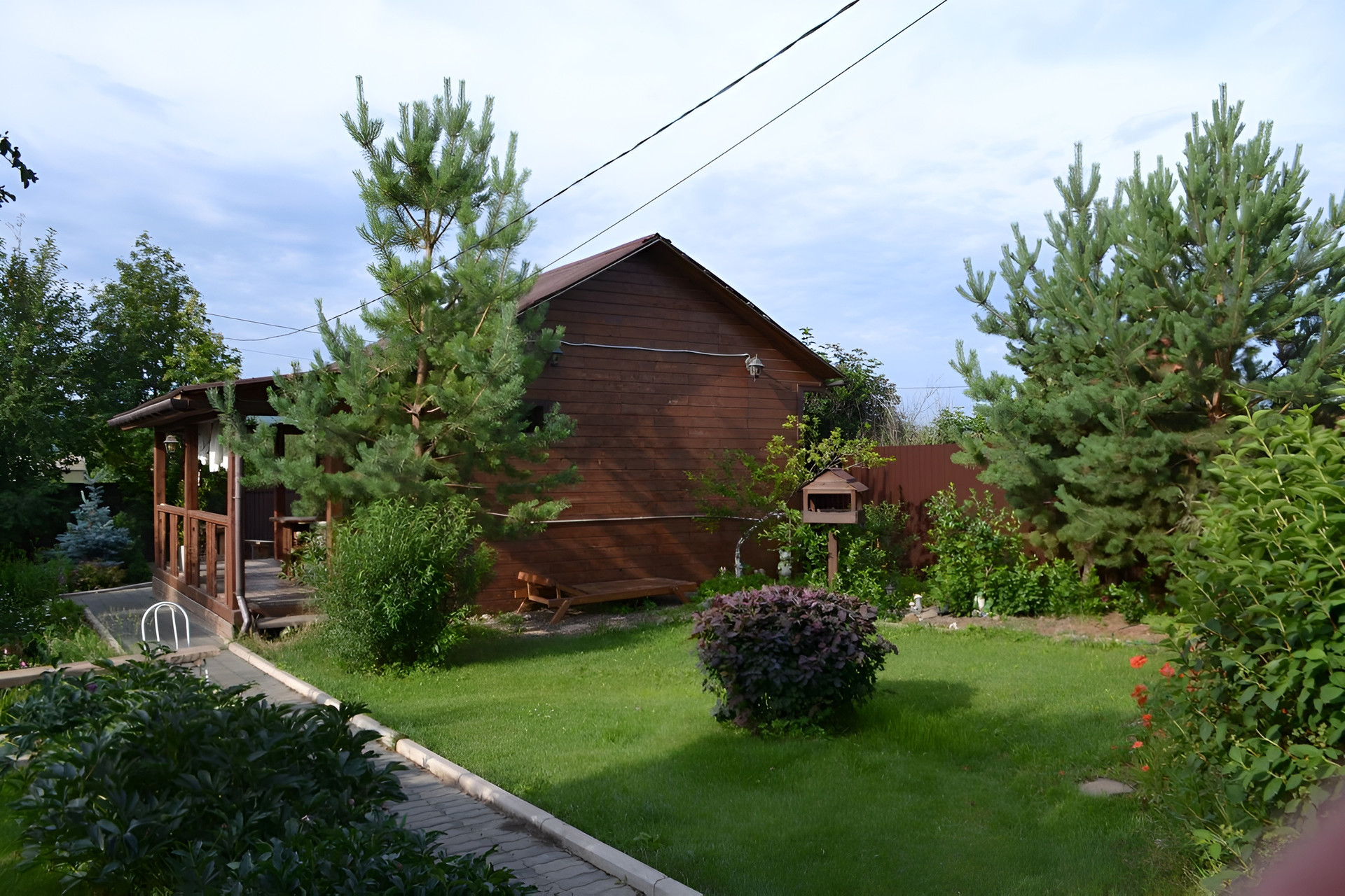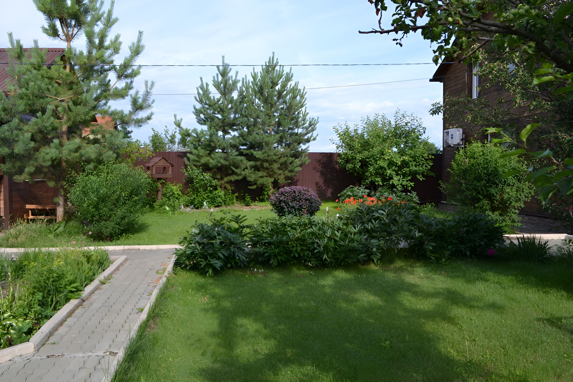 Участок - автомат ворота, брусчатка, зона отдыха, сарай, подготовлена площадка под бассейн в виде деревянного настила - зона вокруг бассейна выложена плиткой, газон, цветы, деревья-ранет, яблоня, груша, слива, смородина, ирга, жимолость, сосны, голубые ели, а также малина и мята.