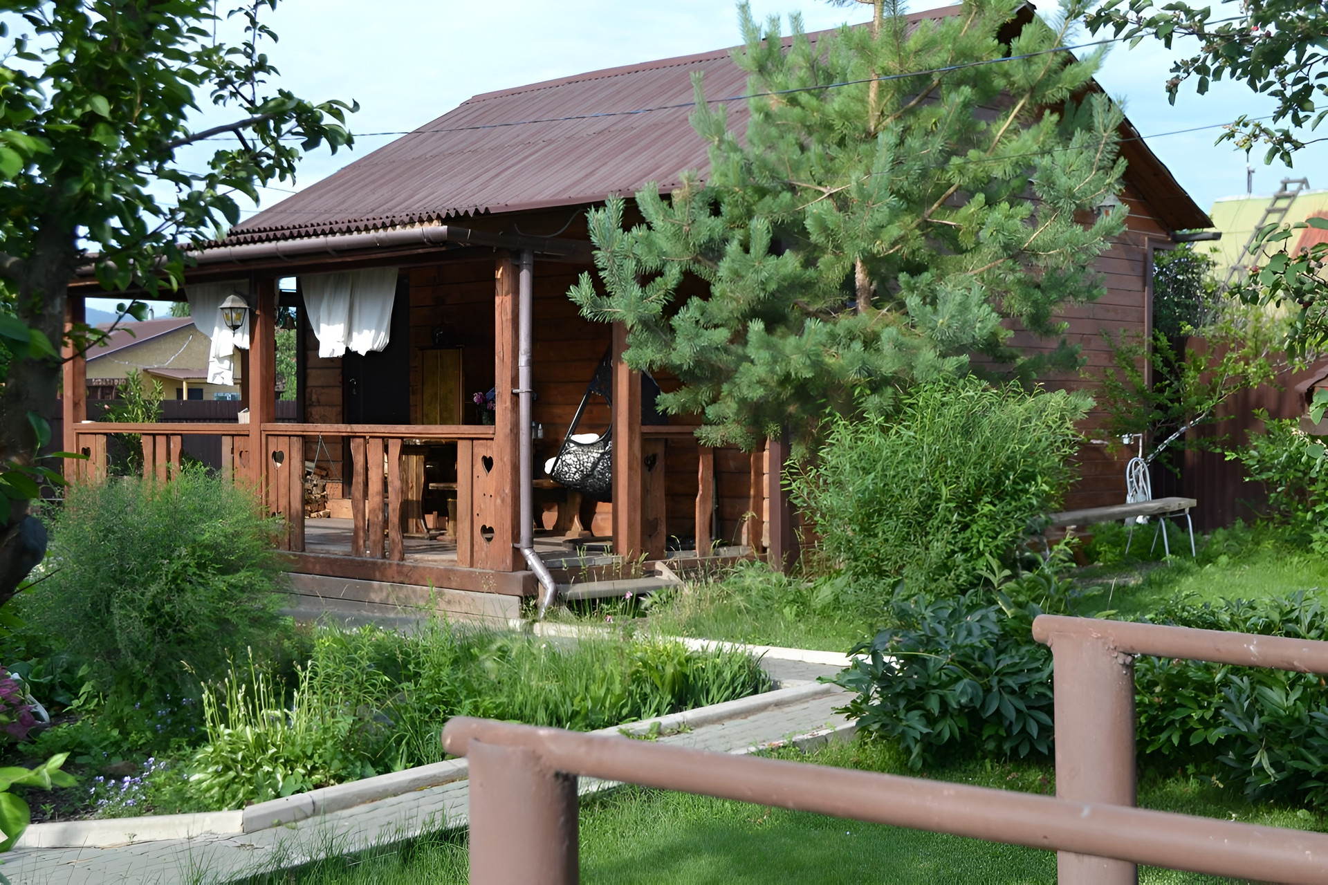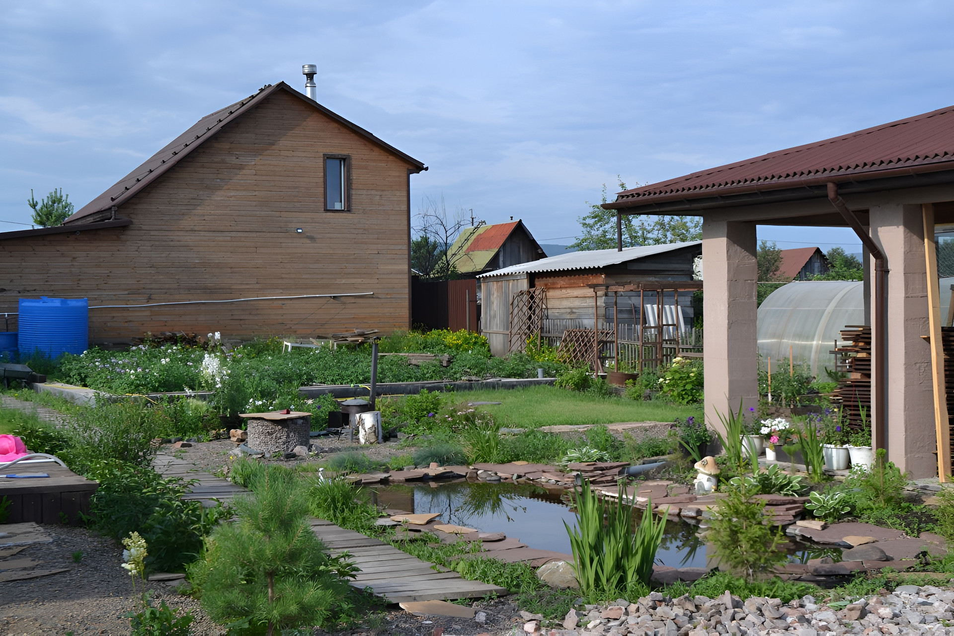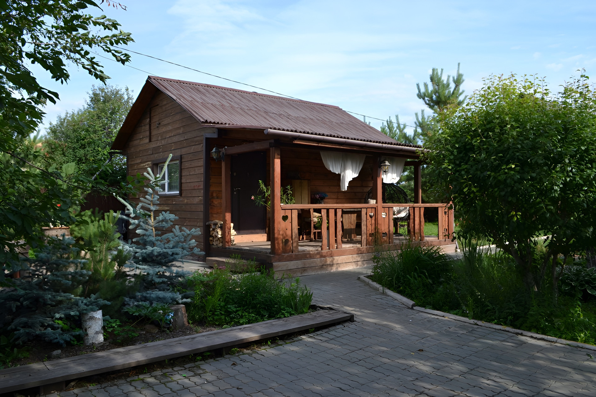 Участок - автомат ворота, брусчатка, зона отдыха, сарай, подготовлена площадка под бассейн в виде деревянного настила - зона вокруг бассейна выложена плиткой, газон, цветы, деревья-ранет, яблоня, груша, слива, смородина, ирга, жимолость, сосны, голубые ели, а также малина и мята.