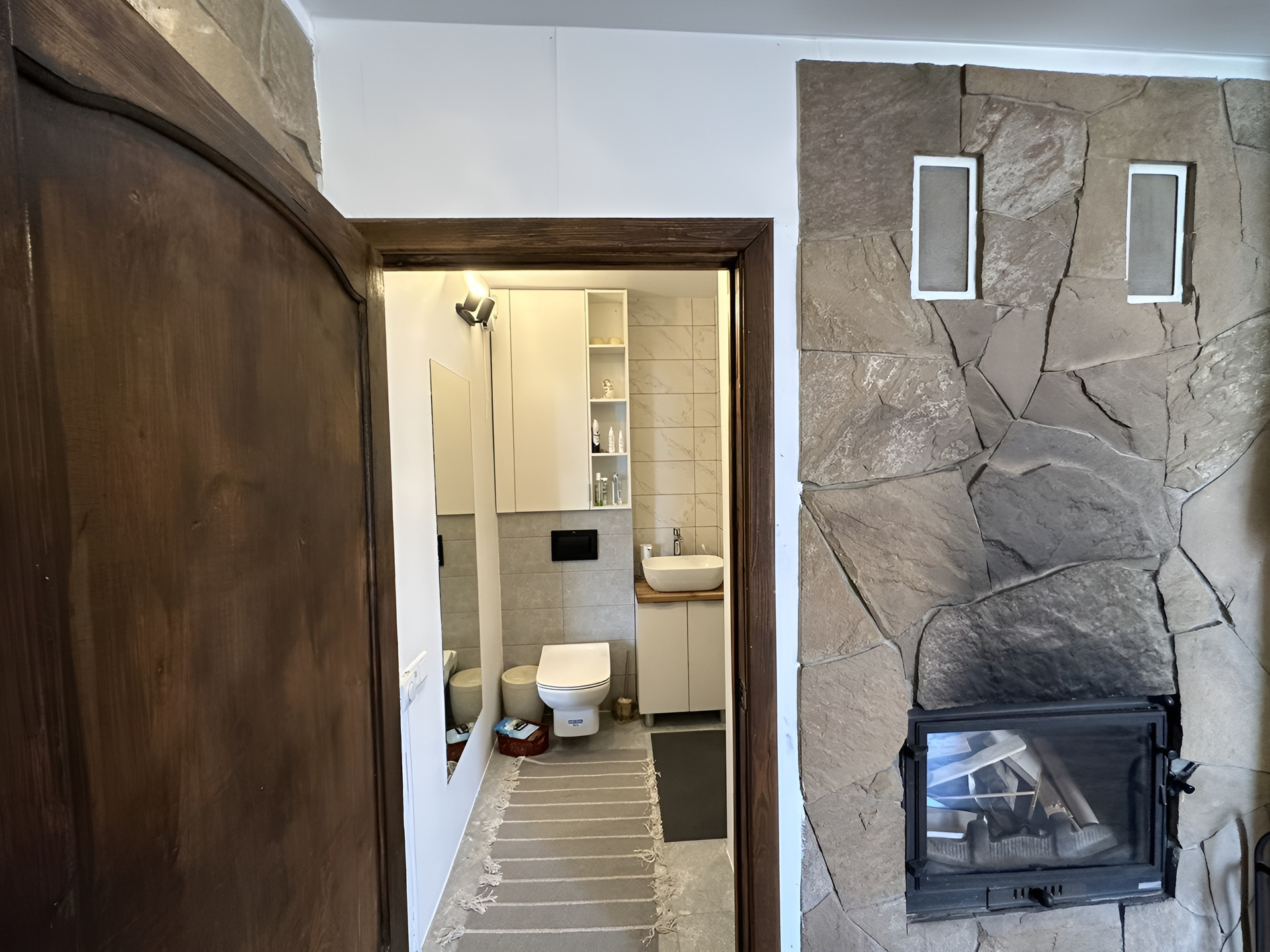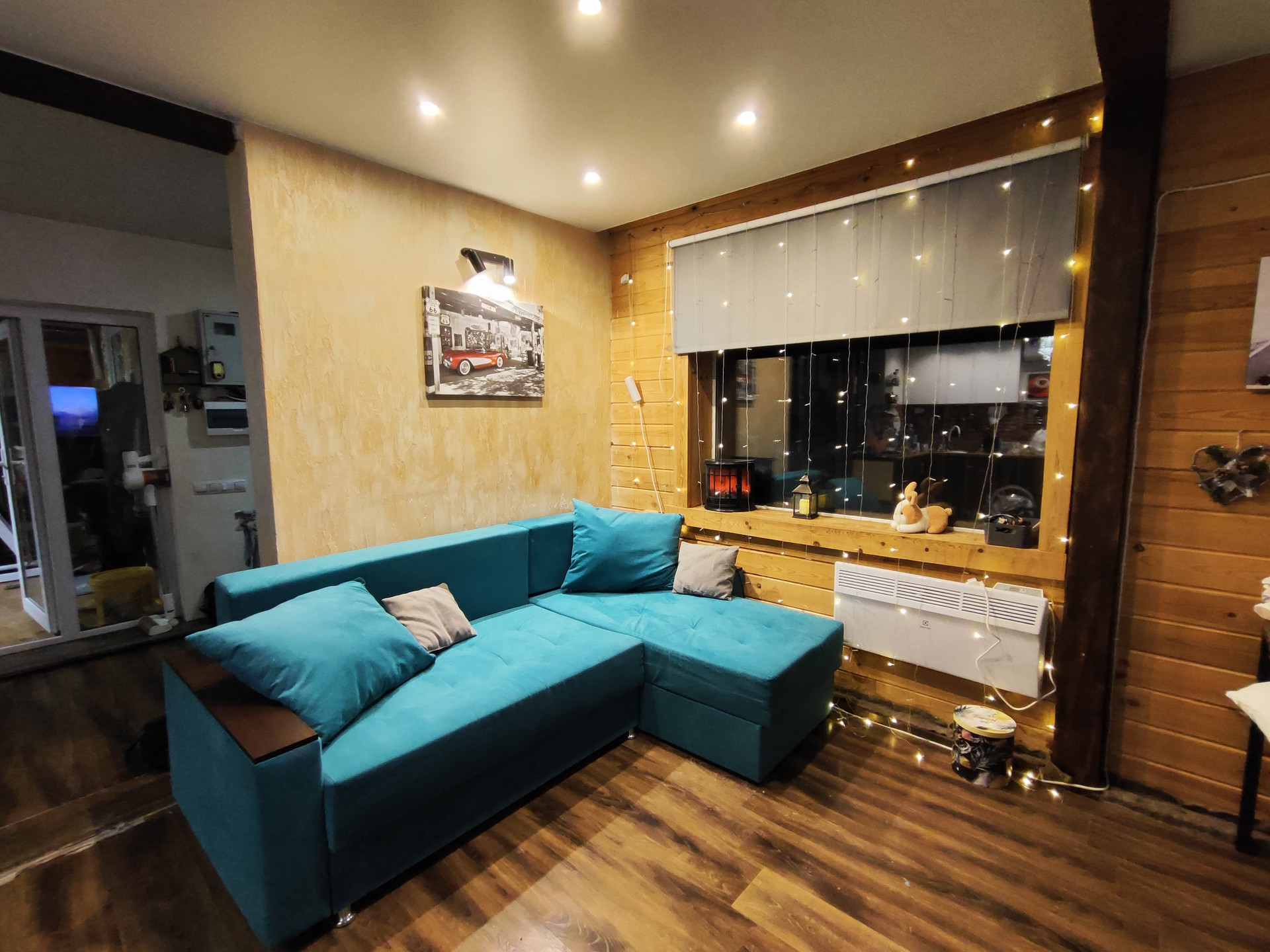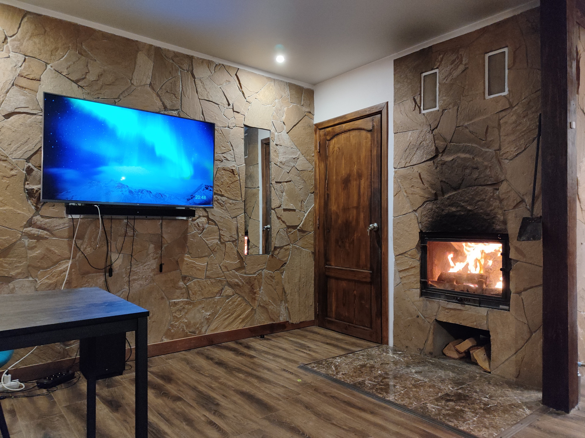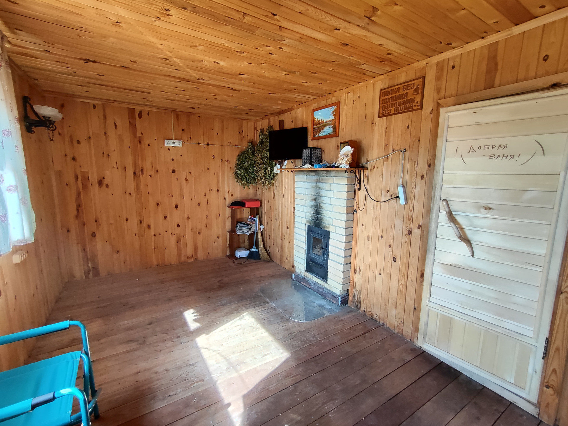 Дом из пеноблока с утеплением толщина 40 см, обшит имитация бруса; есть канализация; камин со стеклянной дверцей; электрическая плита; кухня. Стены отделаны декоративной штукатуркой, натур камнем (плитняком) и деревом; потолок натяжной, на полу ламинат; обогреватели, камин-дрова, паллеты.