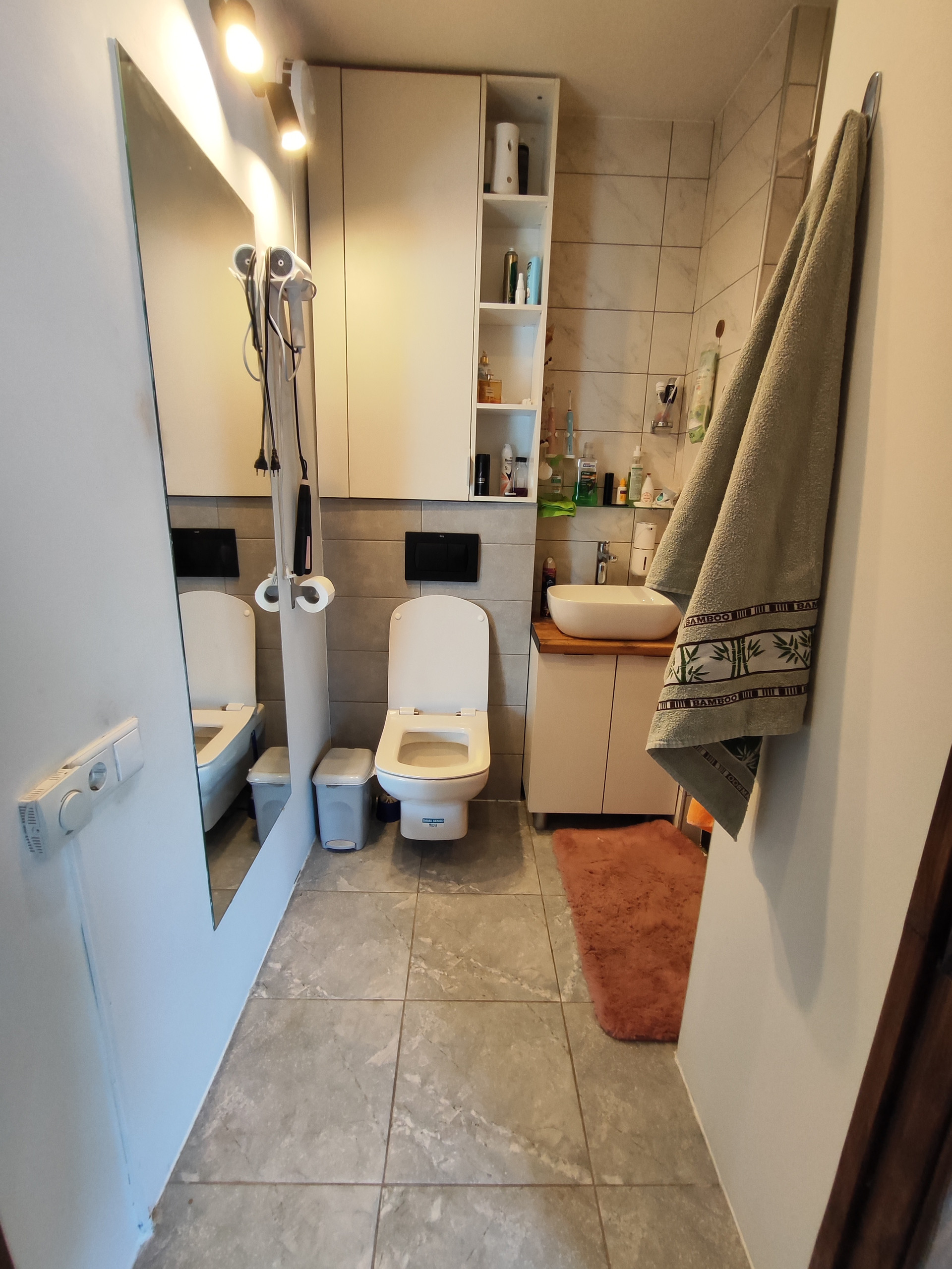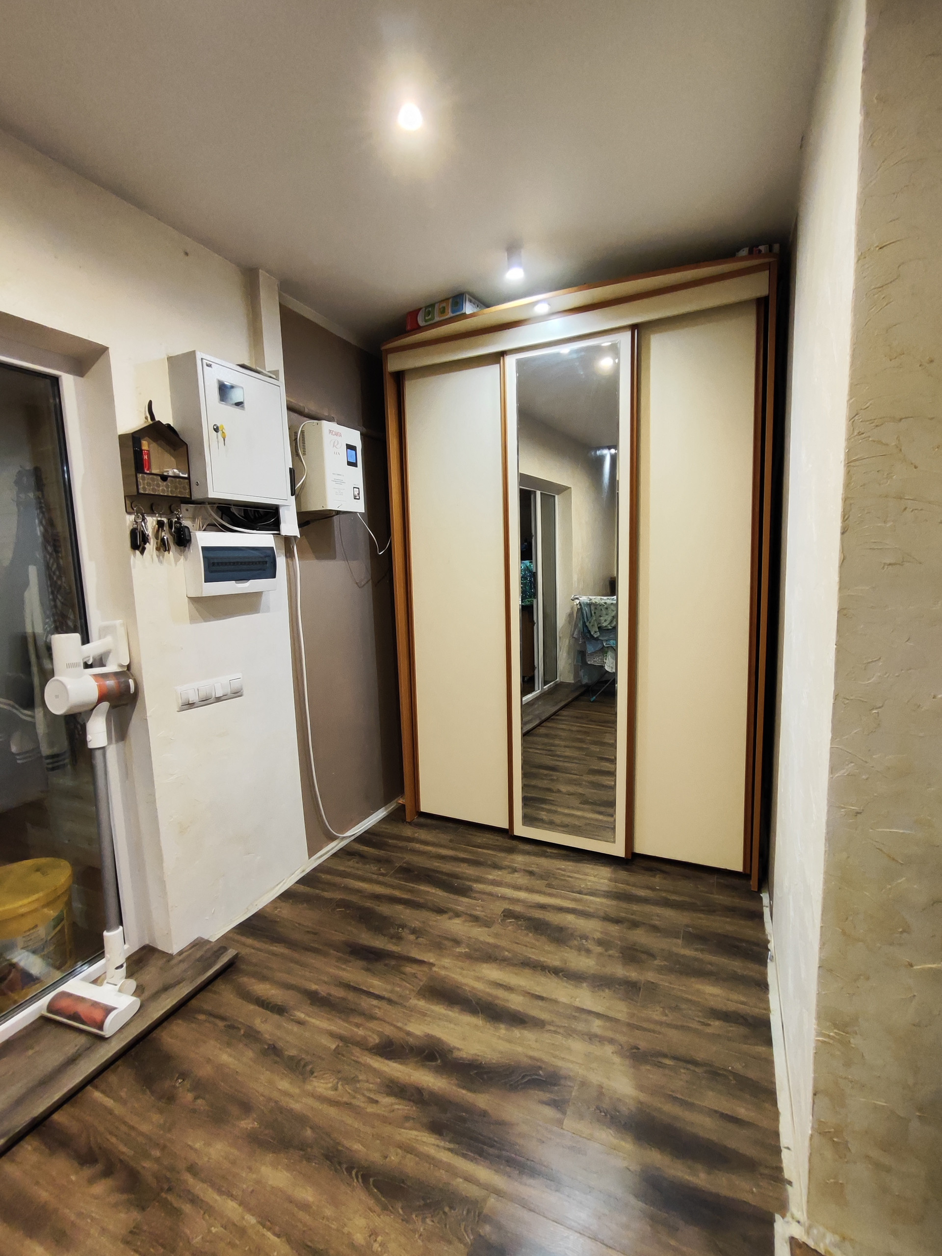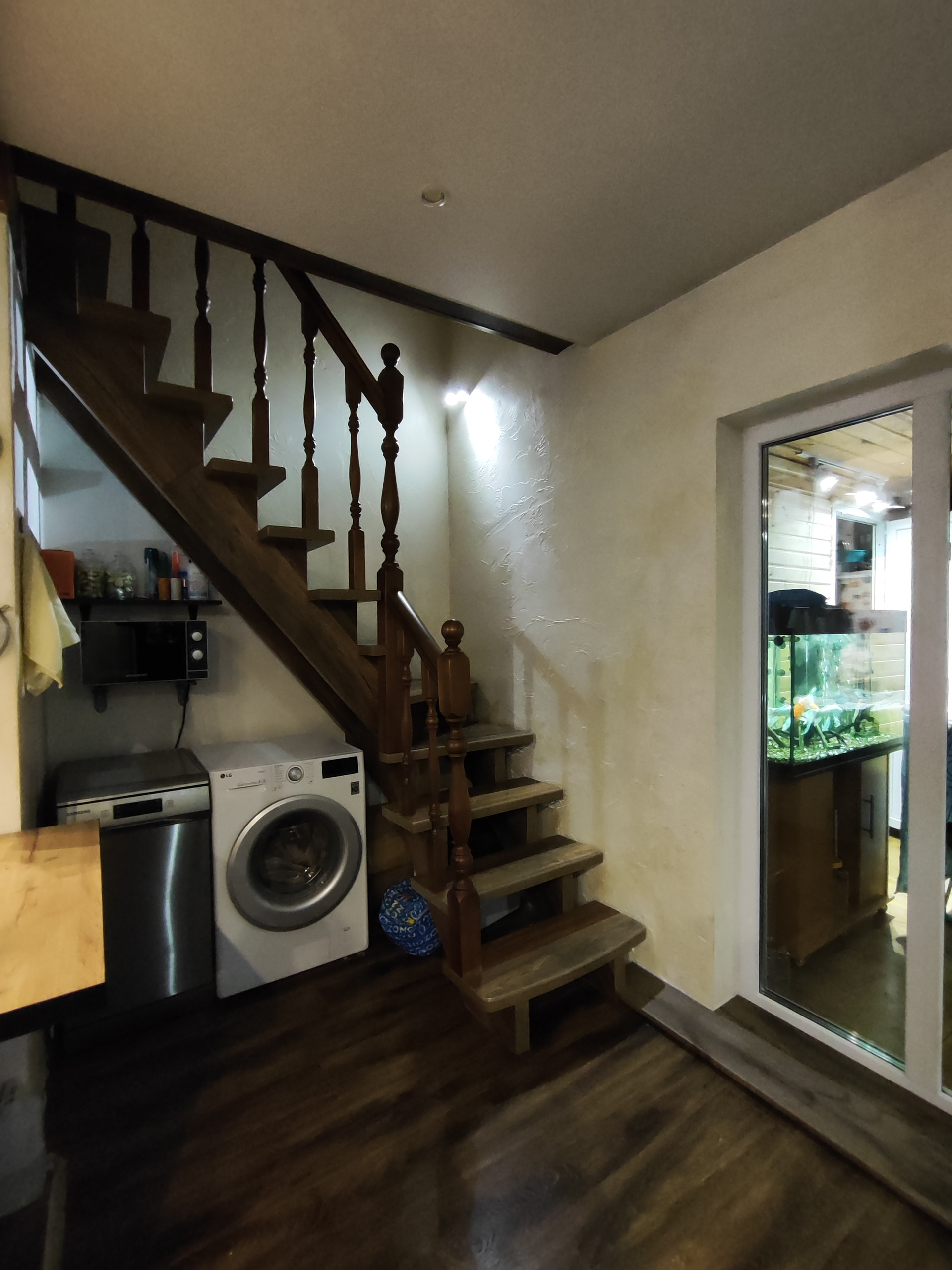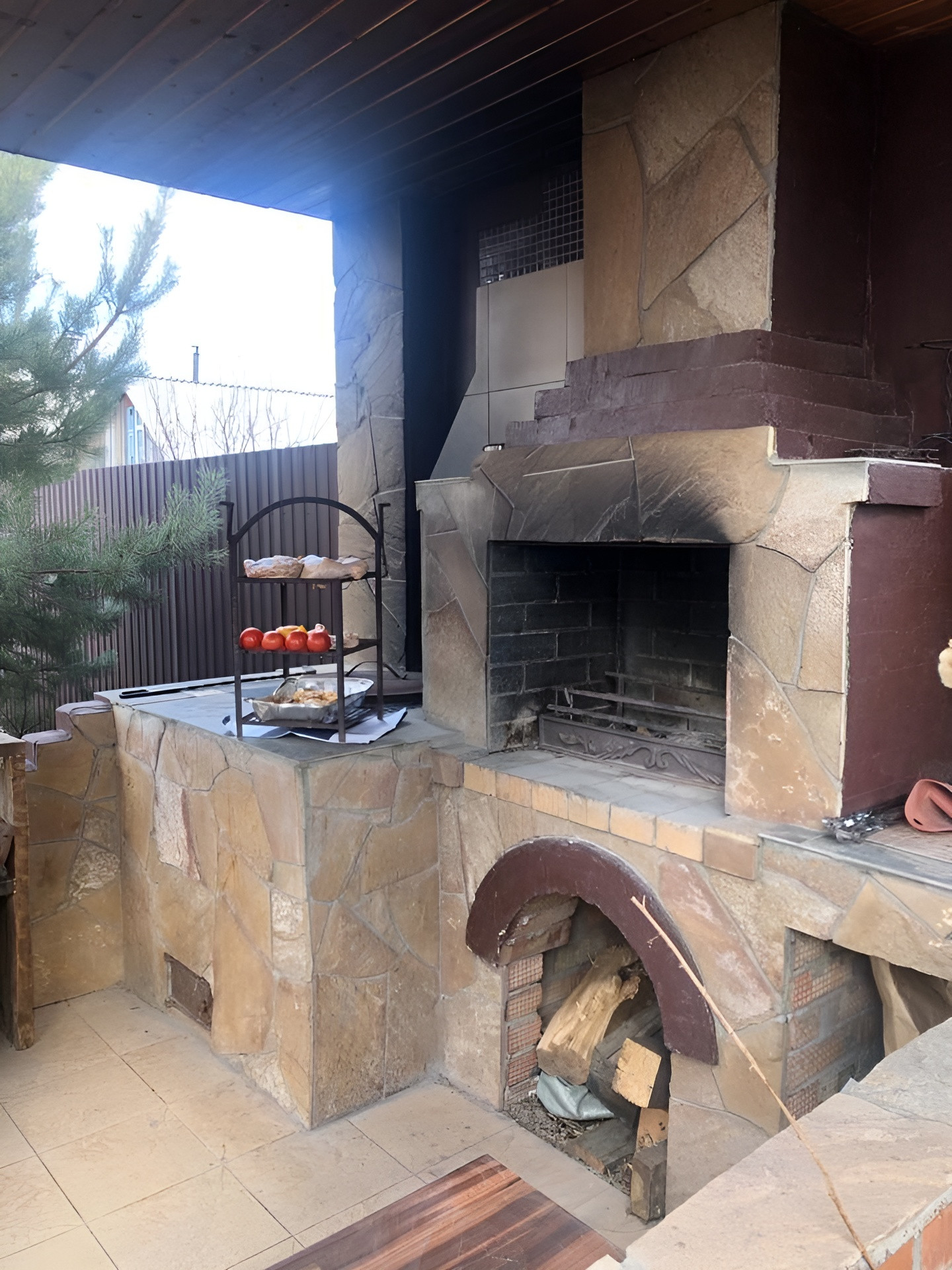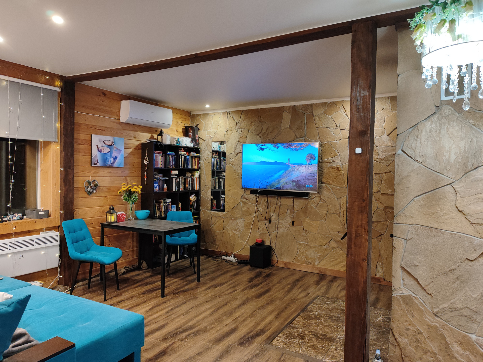 Дом из пеноблока с утеплением толщина 40 см, обшит имитация бруса; есть канализация; камин со стеклянной дверцей; электрическая плита; кухня. Стены отделаны декоративной штукатуркой, натур камнем (плитняком) и деревом; потолок натяжной, на полу ламинат; обогреватели, камин-дрова, паллеты.