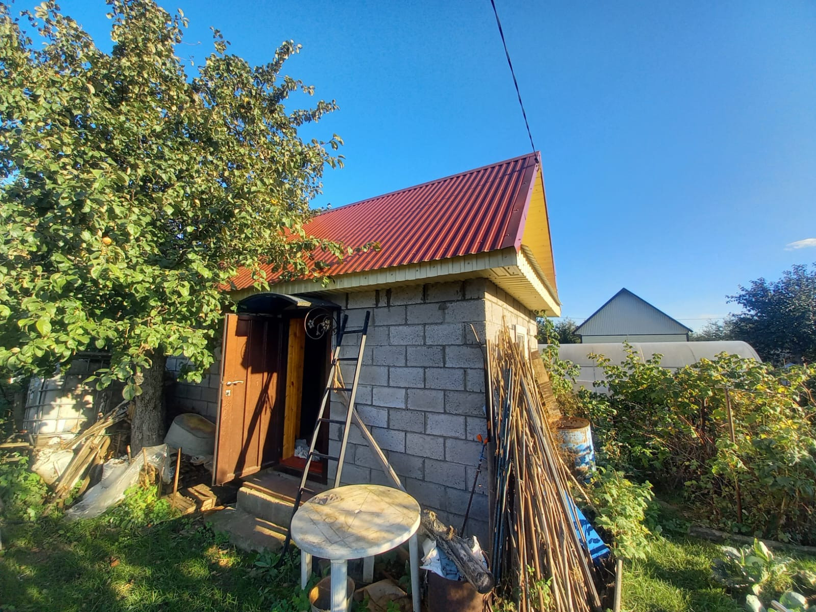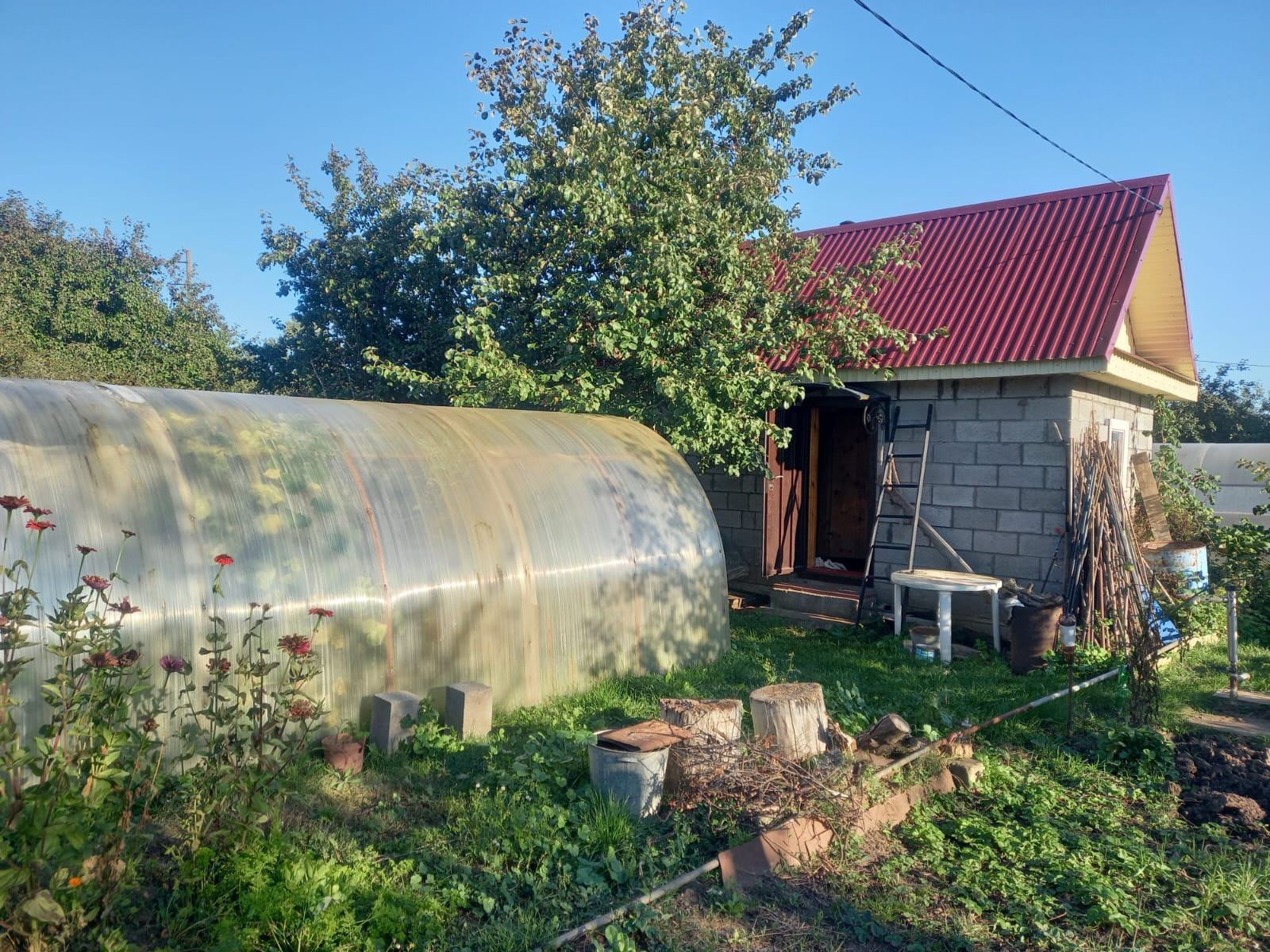 Теплица из поликарбоната 3*6 м. Туалет и хозблок деревянные, есть мангал.