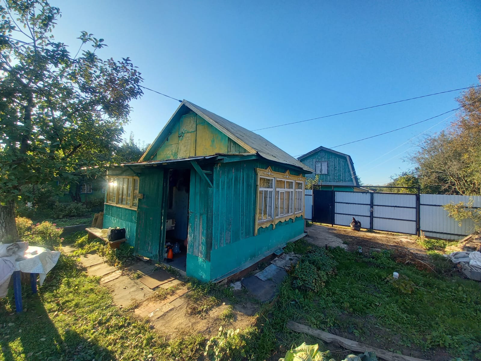 Забор с воротами из профнастила, имеется заезд для автомобиля, площадка бетонированная, электричество проведено, счётчик в доме.