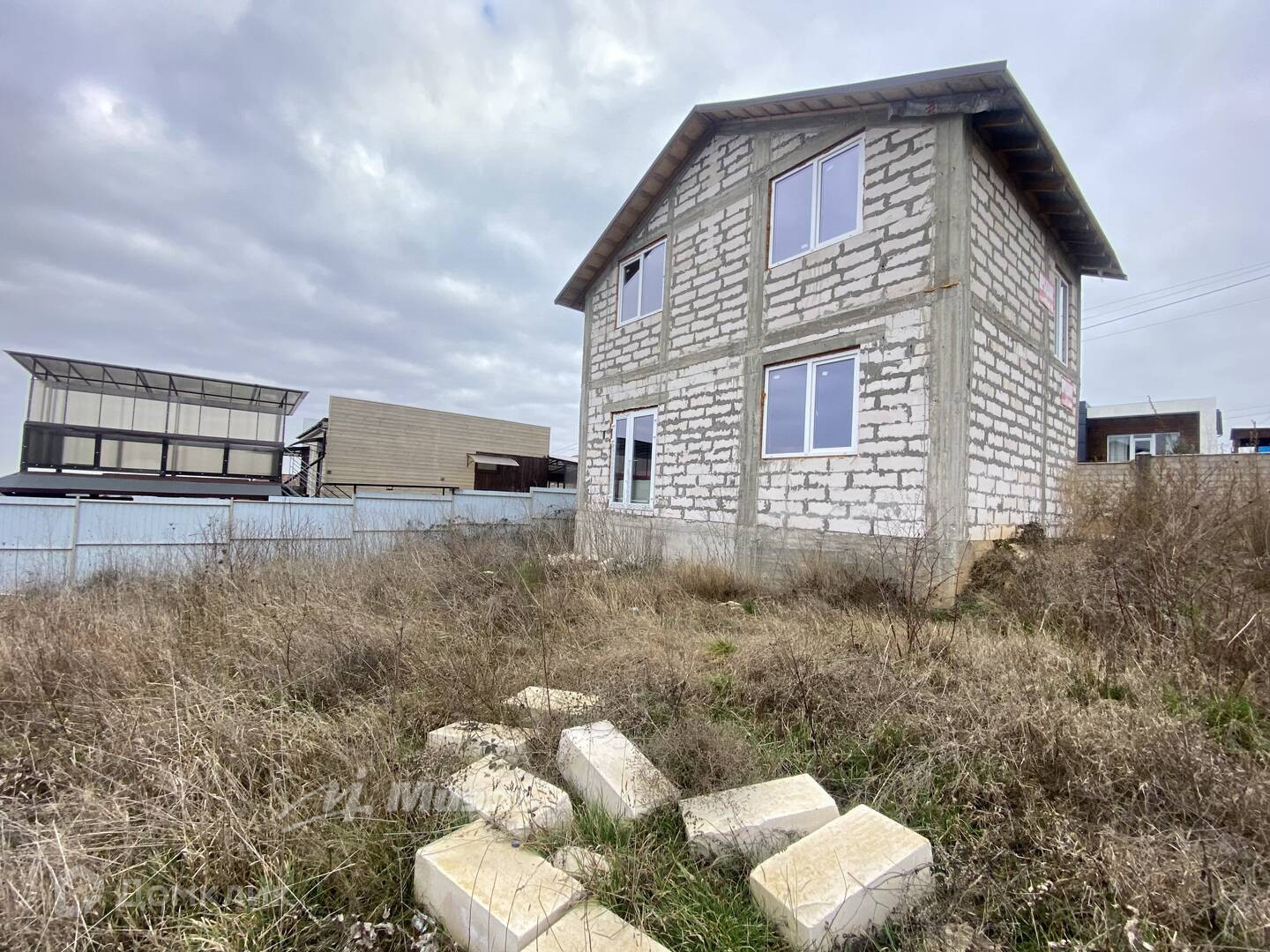 Построен из газобетона на ленточном фундаменте.