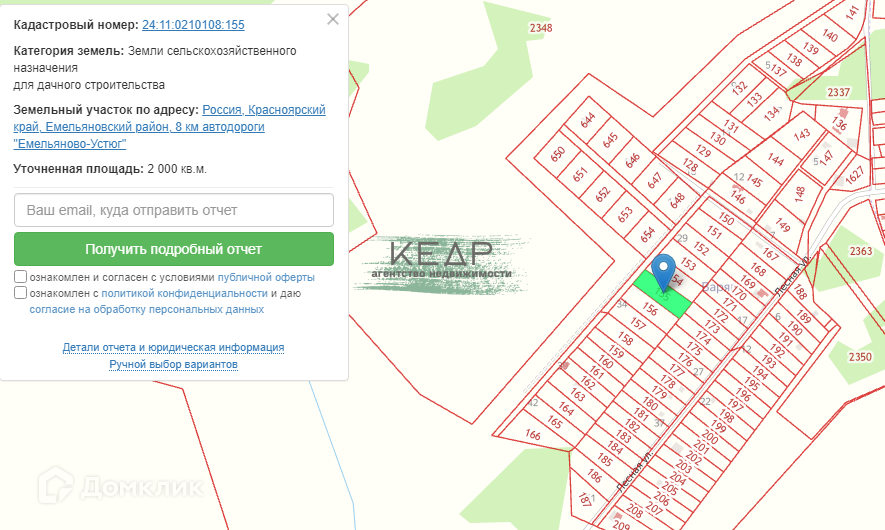 Подойдёт как для дачи так и для постоянного проживания. Ровный, с минимальным уклоном, правильной прямоугольной формы. Доступ круглогодичный, дороги чистят регулярно. От поселка Емельяново до коттеджного поселка 8 км хорошей асфальтовой дороги. Есть свет.