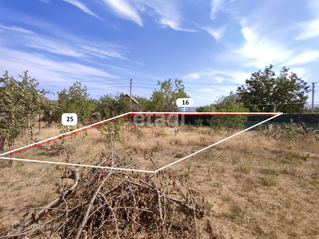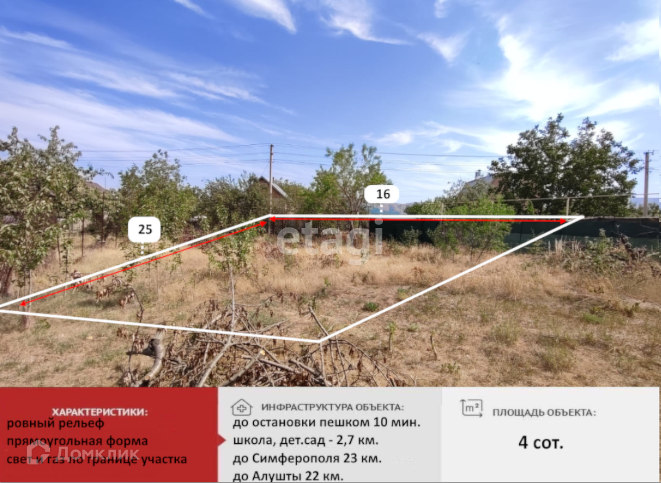 Земельный участок, площадью 4 сотки, прямоугольной формы и ровным рельефом.