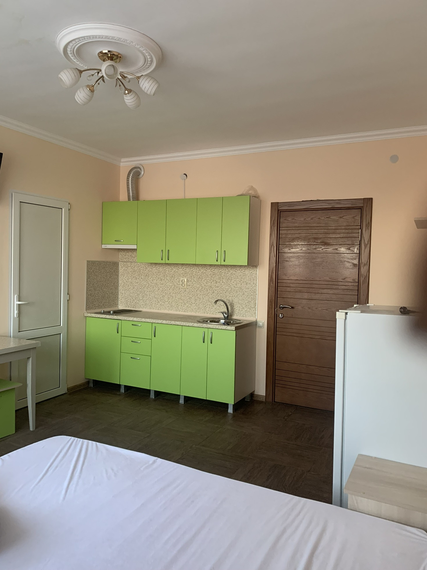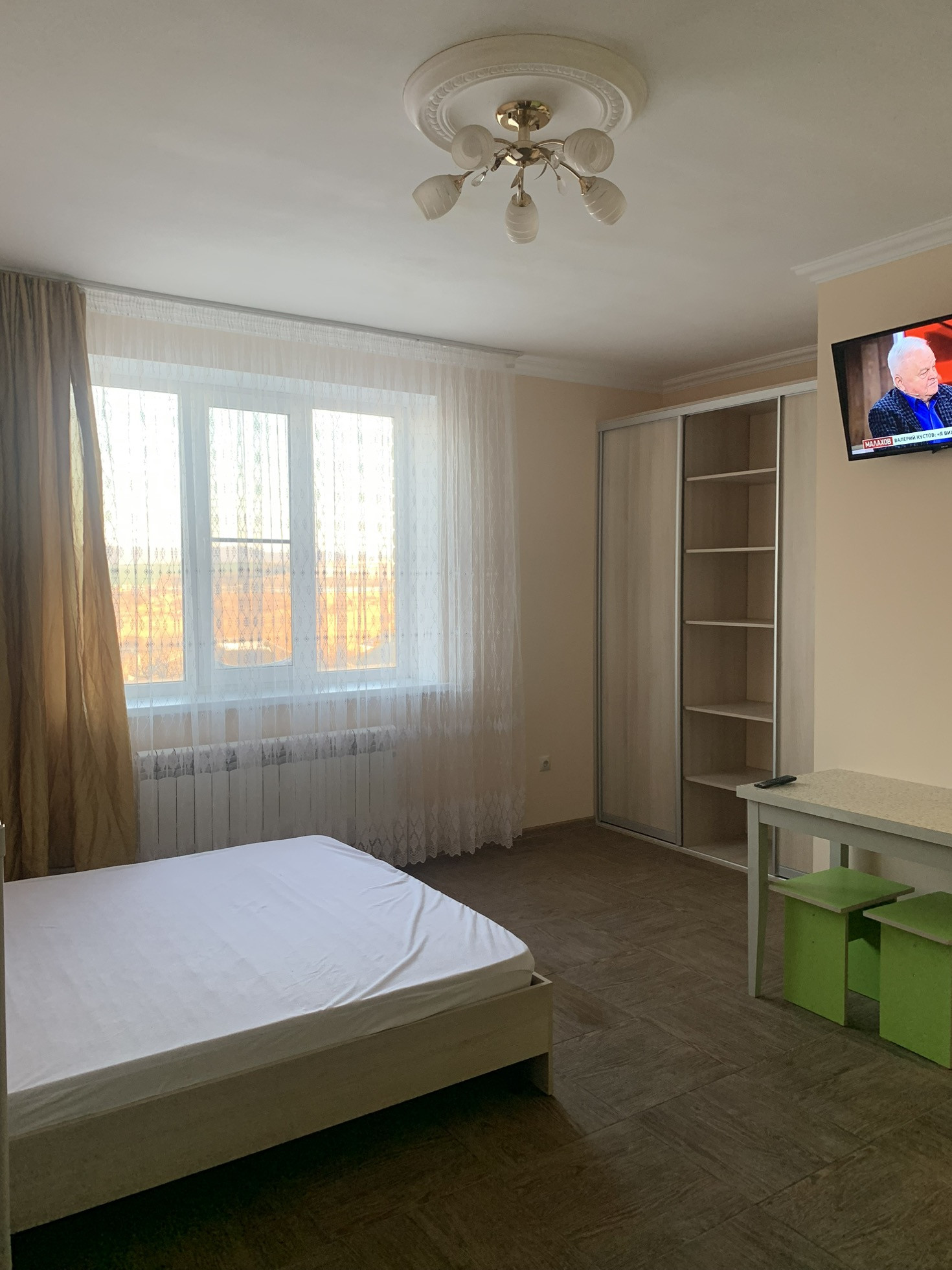 В студии имеется все необходимое для комфортного проживания - двуспальная кровать, прикроватные тумбы, большой вместительный шкаф, TV, холодильник, эл плита, вытяжка.