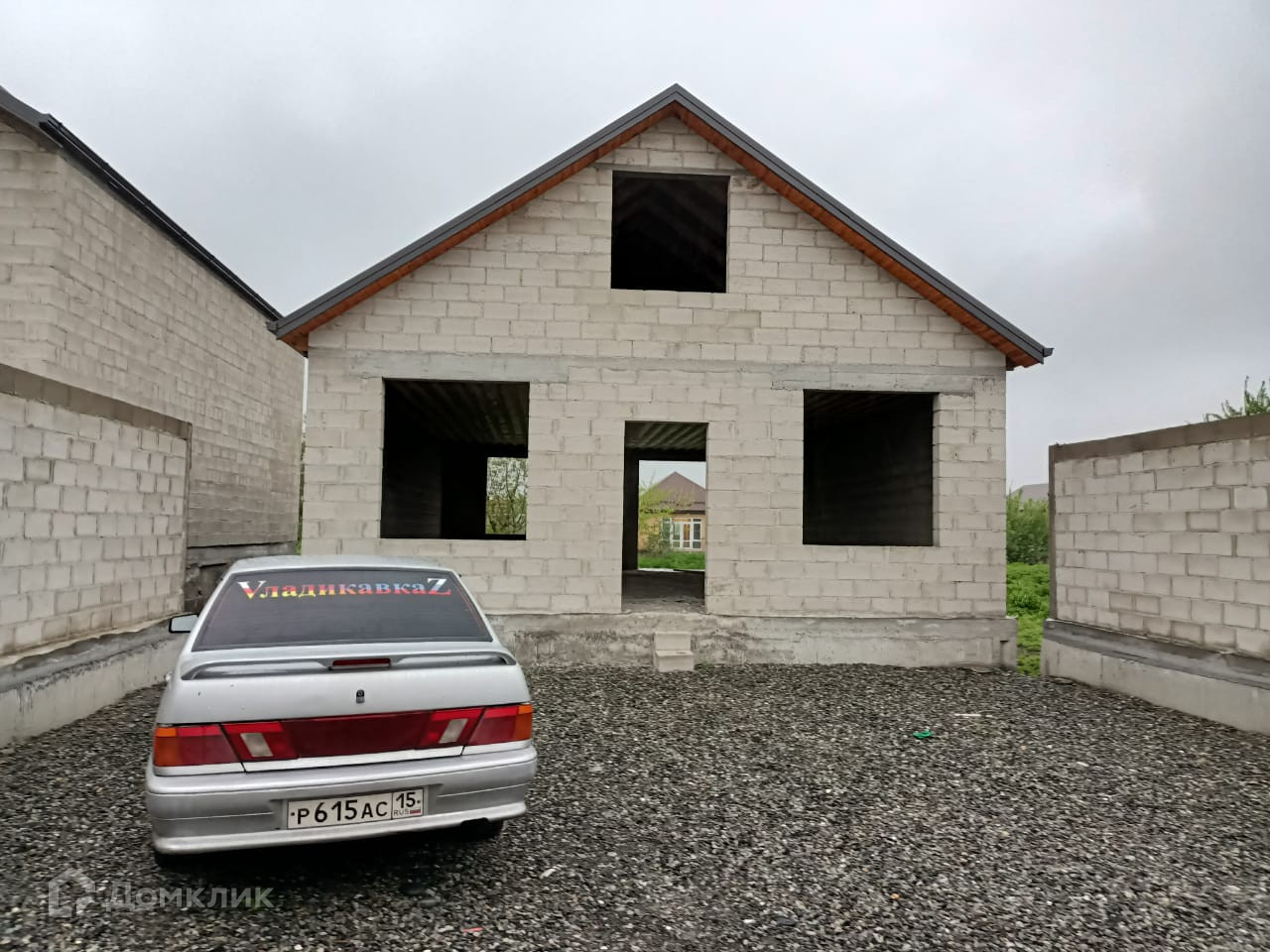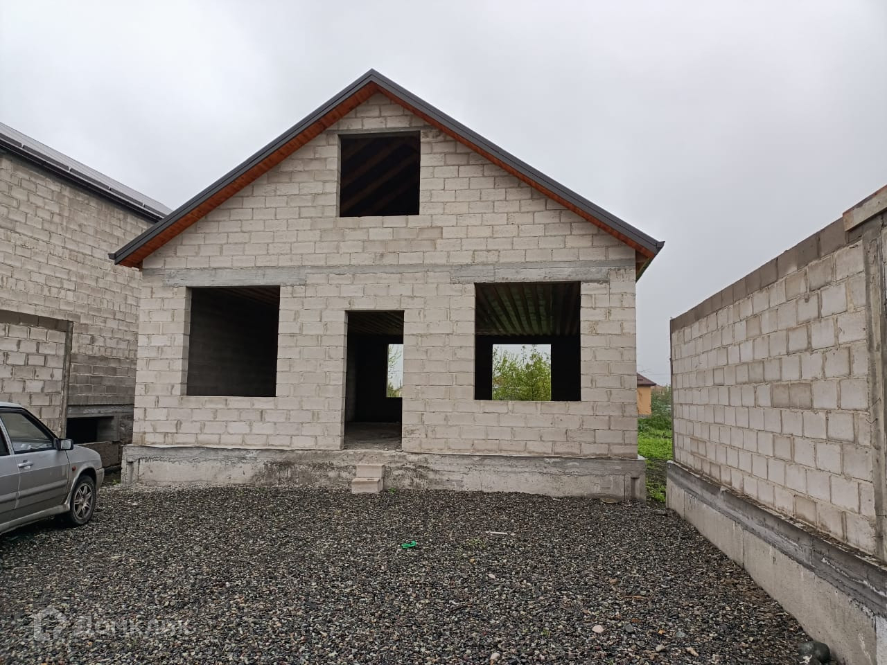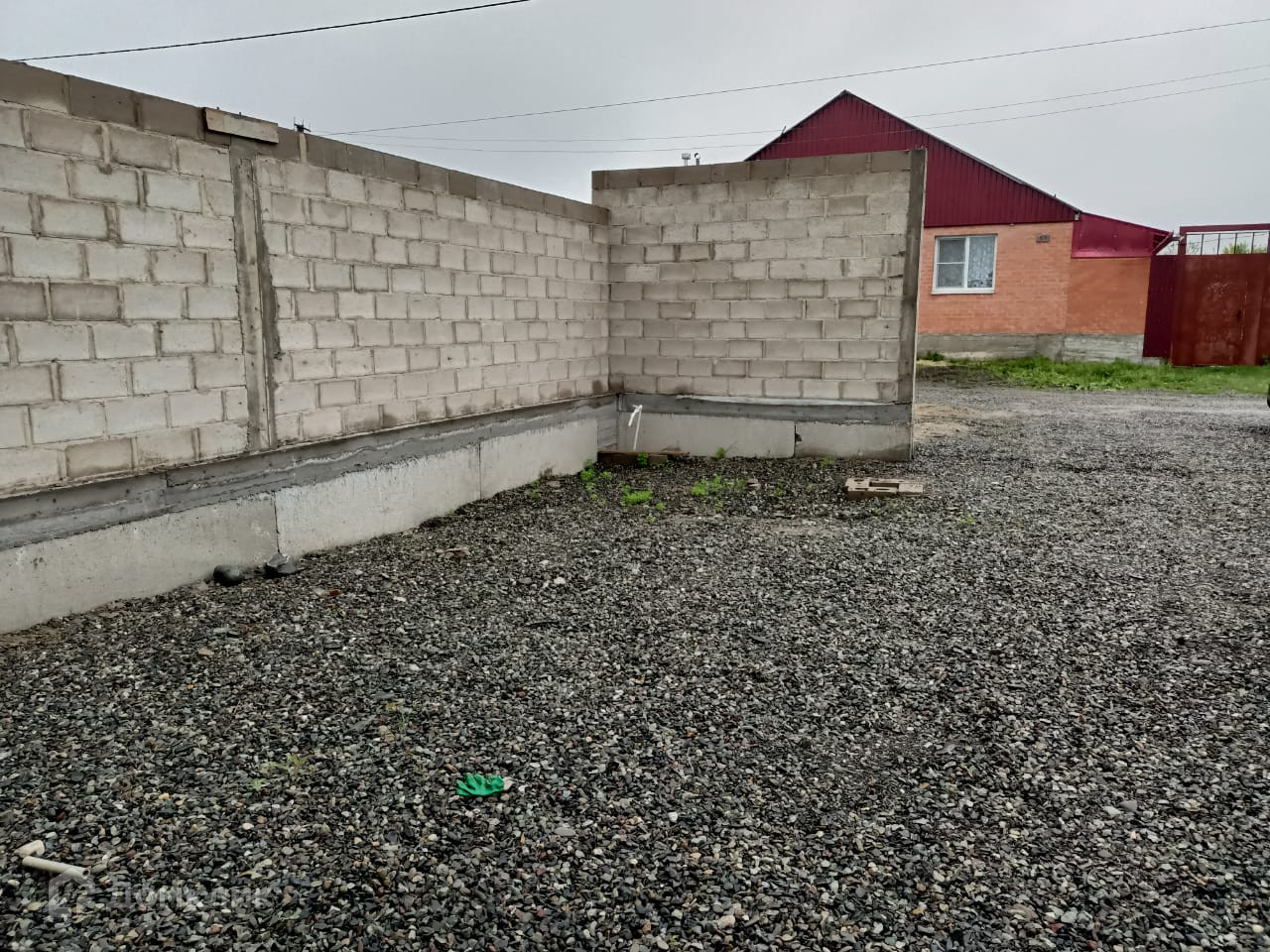 Дом огорожен забором из блоков.