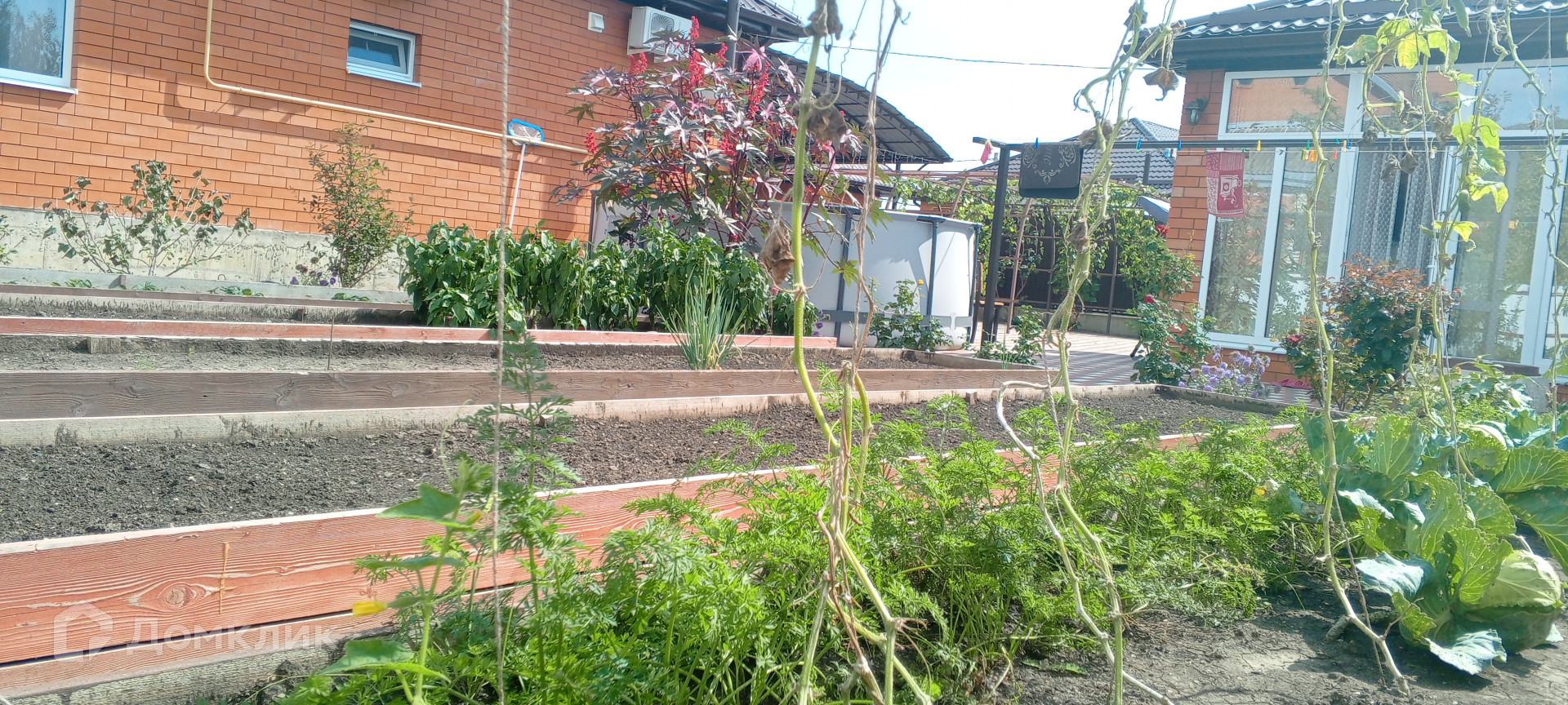 На участке теплица, молодой сад, оформленные грядки, много цветов.