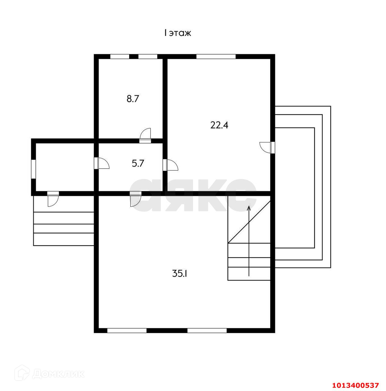 1 этаж - коридор, слева санузел 8,7 м2, спереди кухня-гостиная 22,5 м2, которая имеет выход на терассу 12,39 м2; справа по коридору гостиная комната 35 м2, с лестницей на второй этаж.