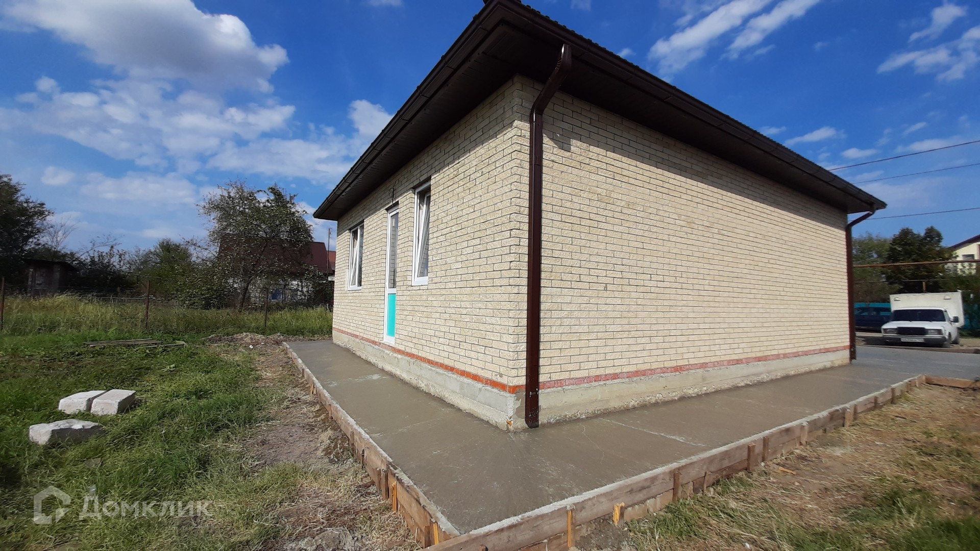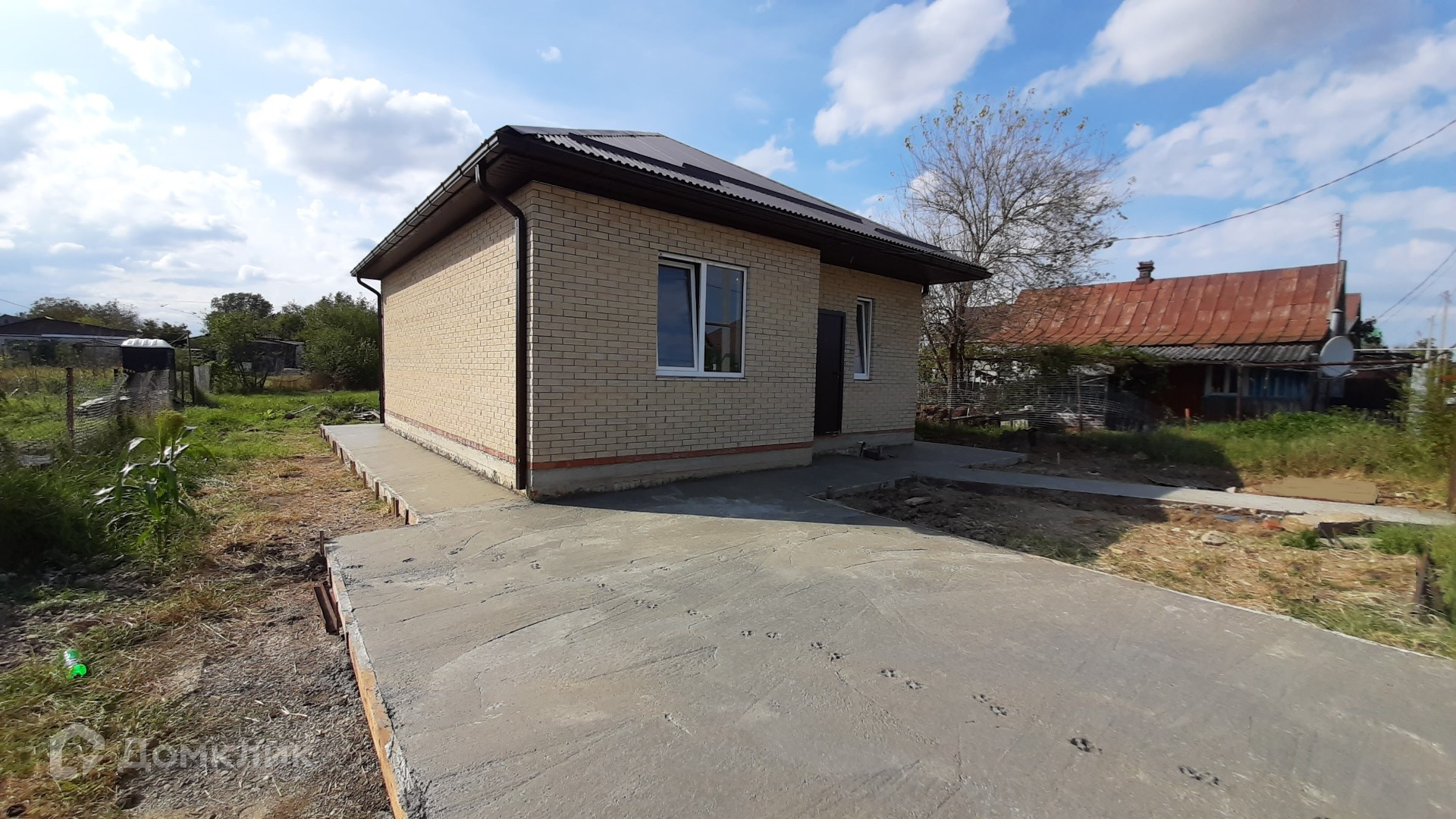 Вокруг дома залита капитальная отмостка, бетонное парковочное место для автомобиля и залита бетонная дорожка к дому.