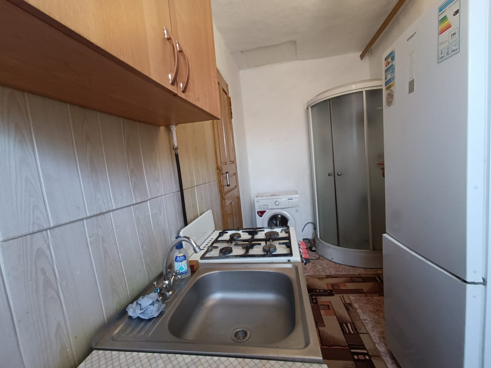 котел. Входная дверь - деревянная.