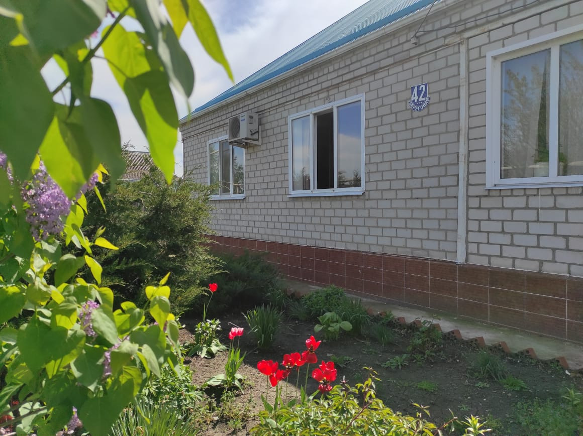 Перед домом большой палисадник с цветами. Расстояние от дороги до забора 50 метров -растут фруктовые деревья, которые загораживают дом от дороги.