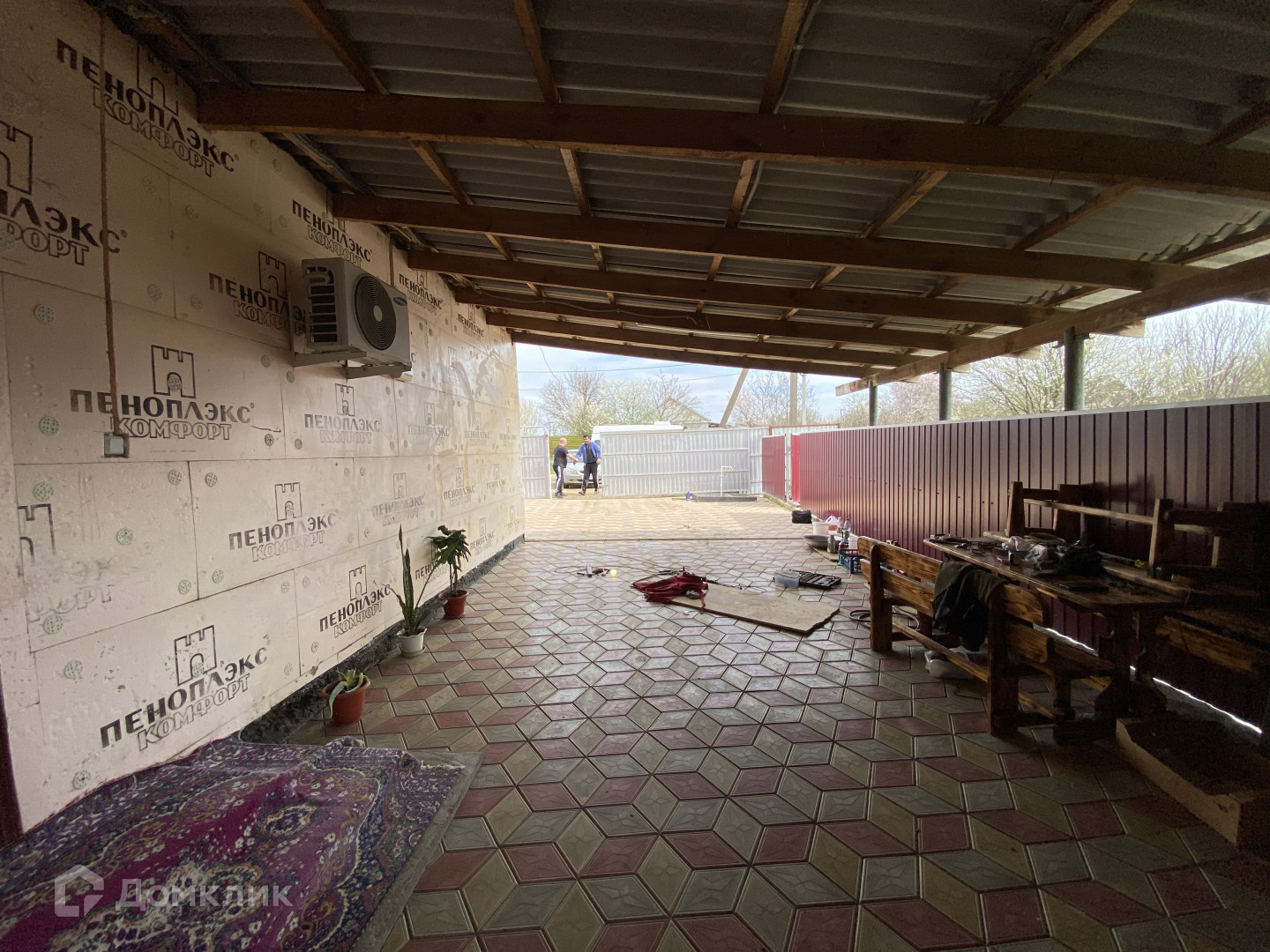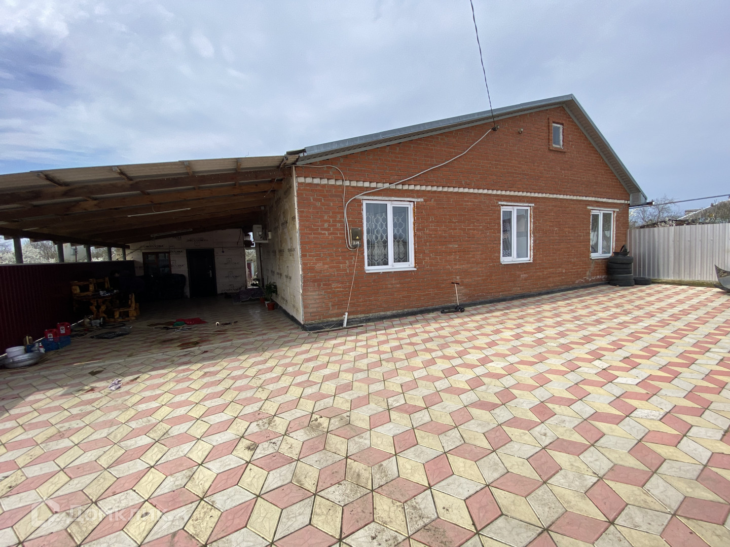 Двор вымощен плиткой, капитальный навес, вмещающий несколько автомобилей и зону отдыха.