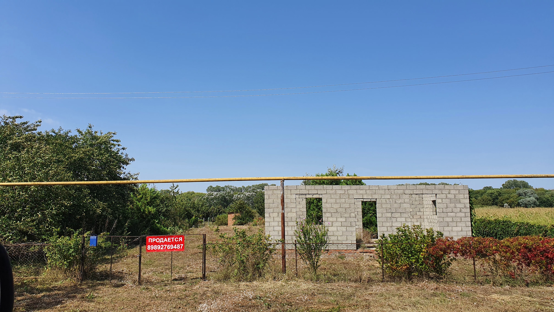 Постройка коробка 6×8 шлакоблок,фундамент залит под постройку 110кв м, построен туалет кирпичная кладка,участок огорожен изгородью.