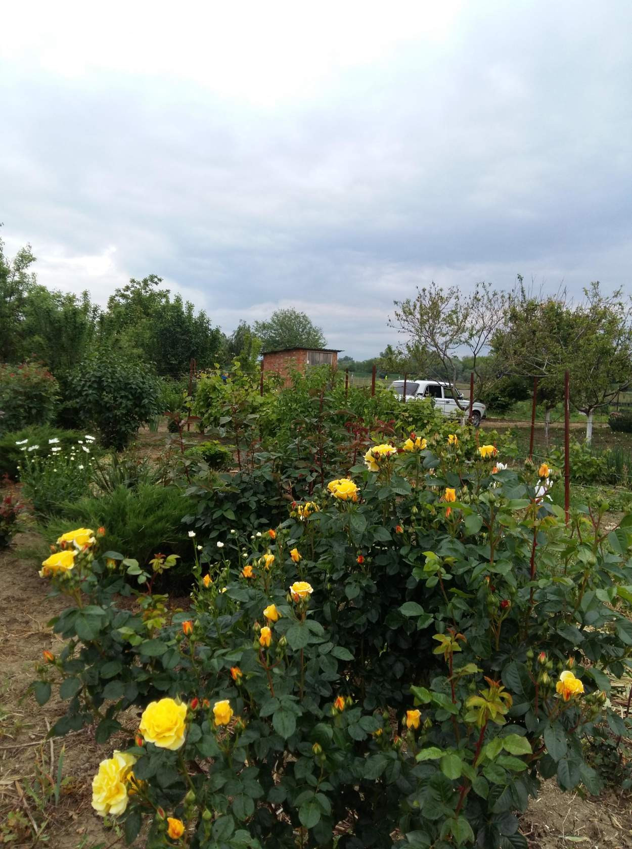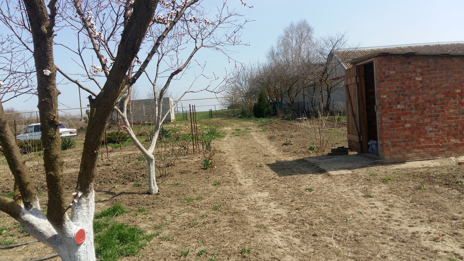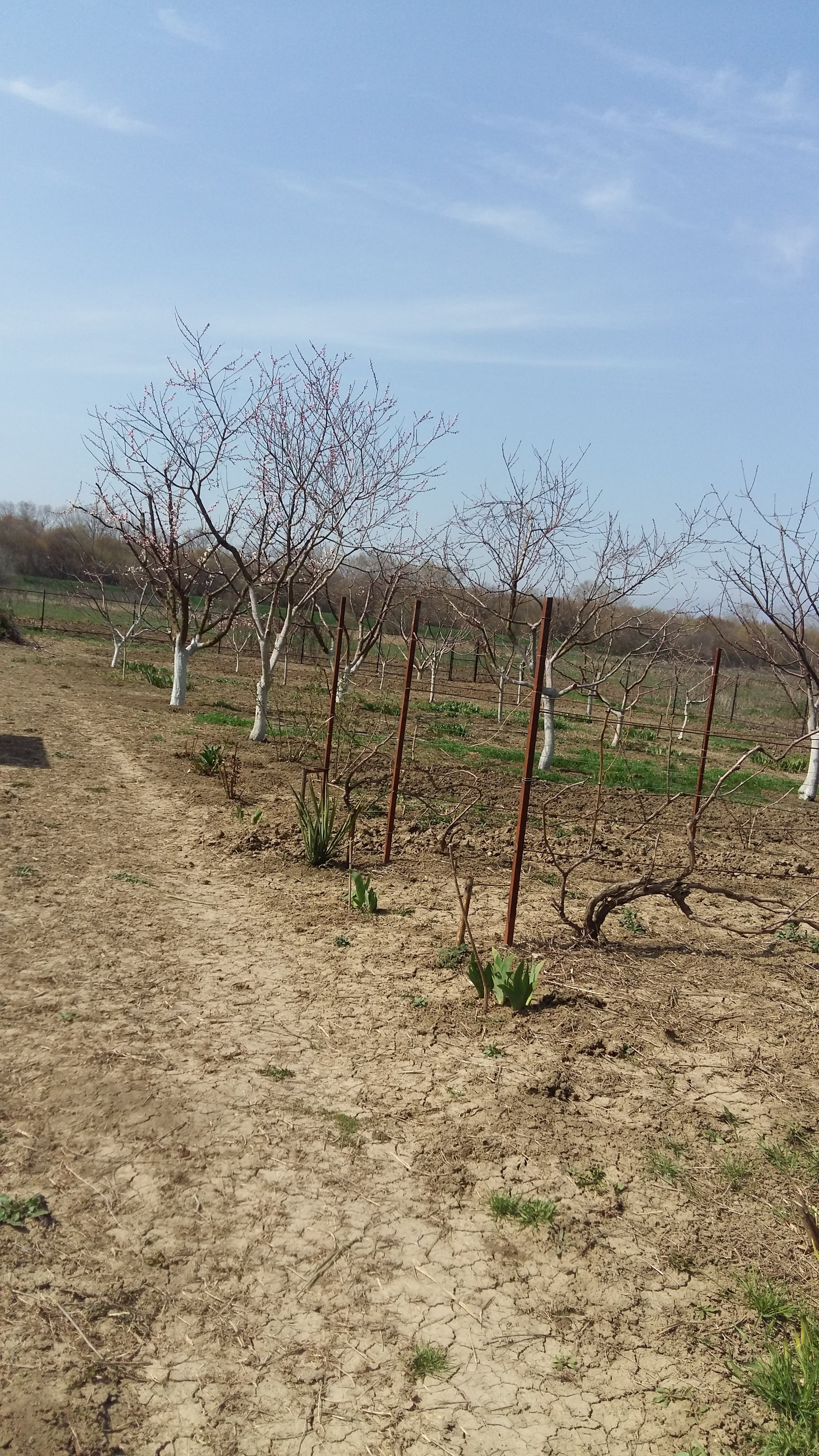 Посажены плодовые деревья яблони,черешни,вишни,персики,слива,груша,орехи,фундук,смородина,виноград.