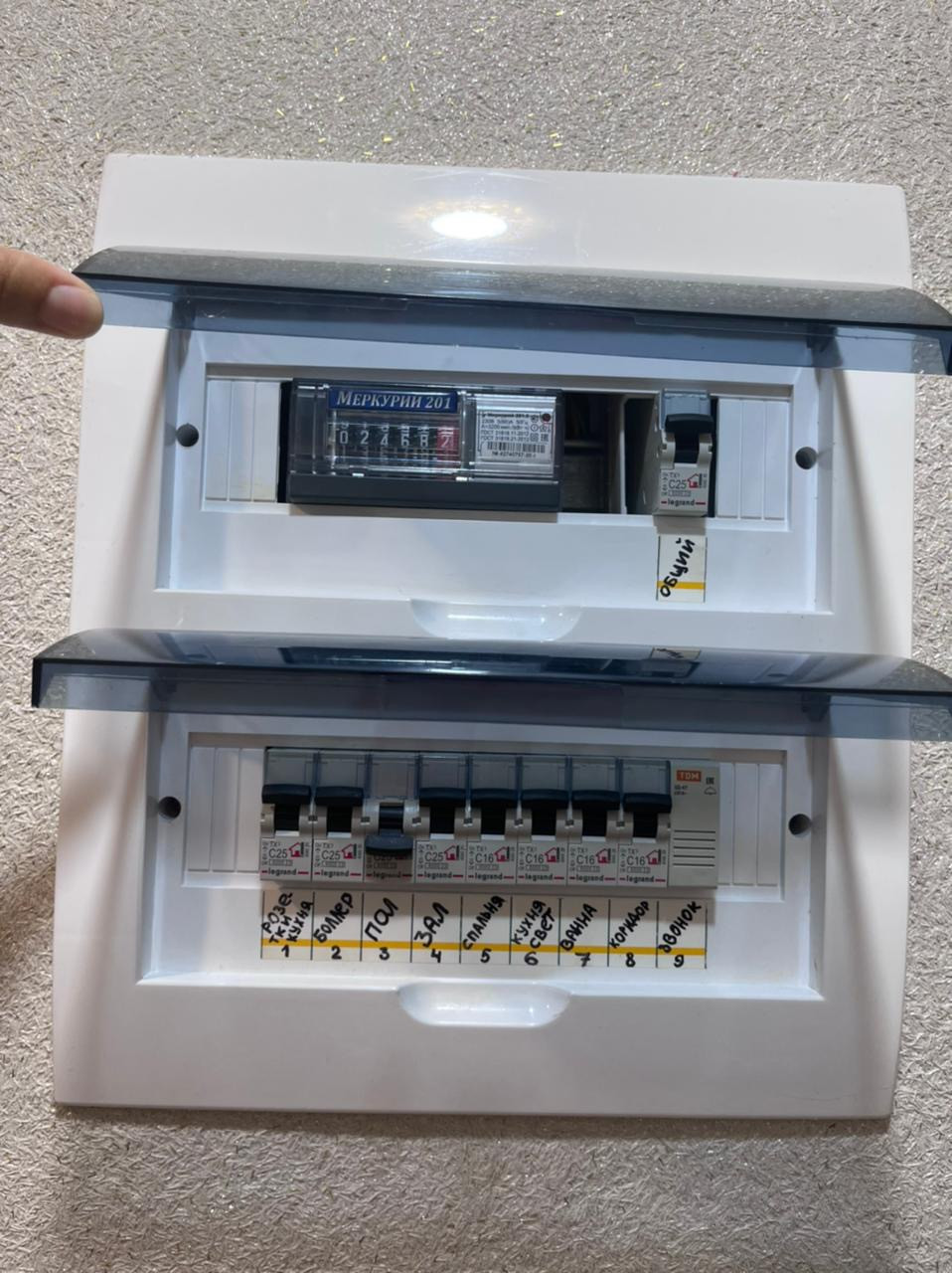 Проведена новая проводка, счётчик новый-на каждую комнату стоит свой автомат!