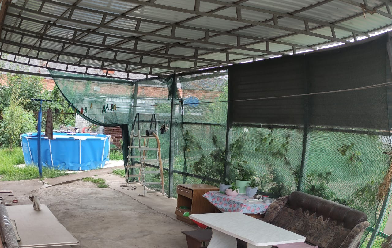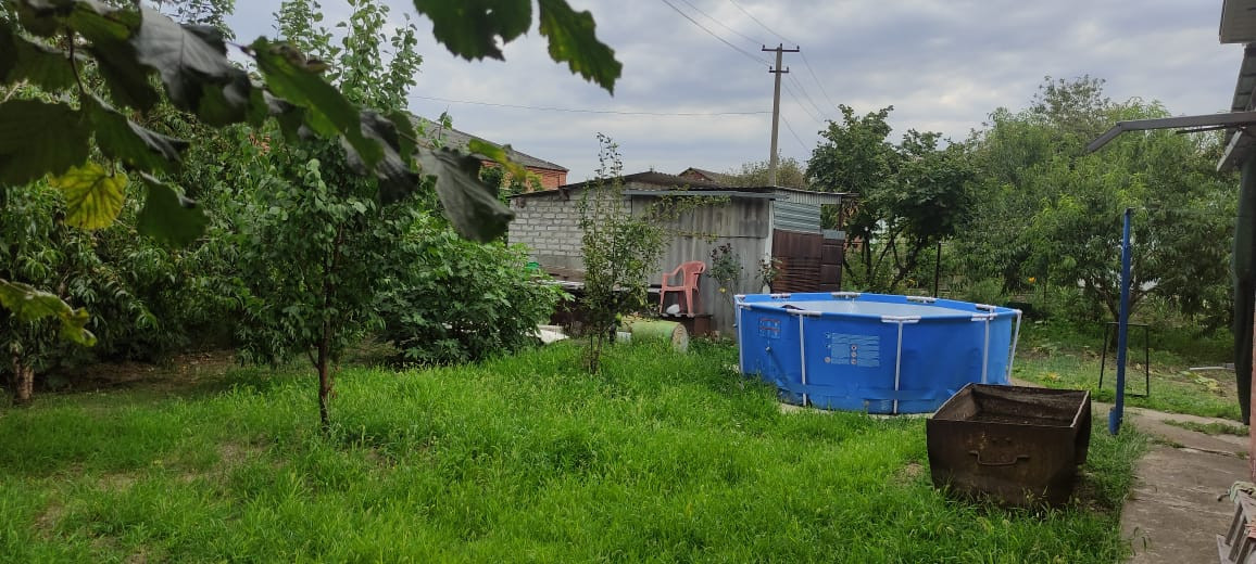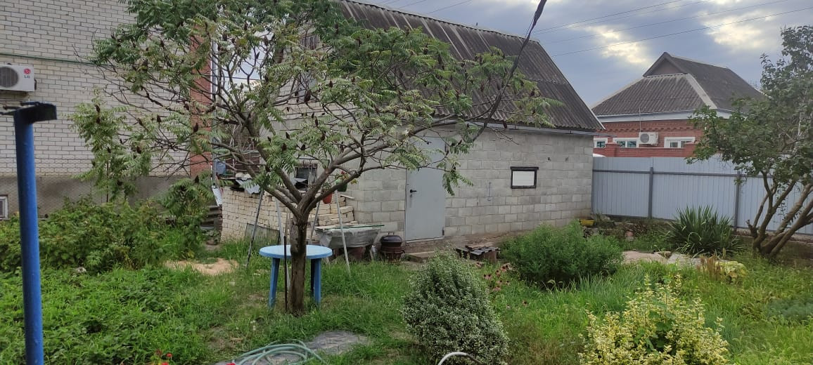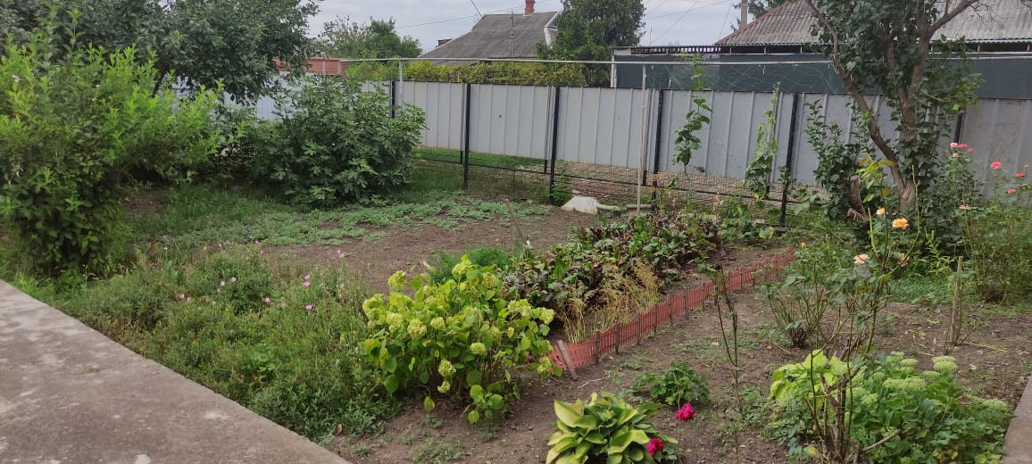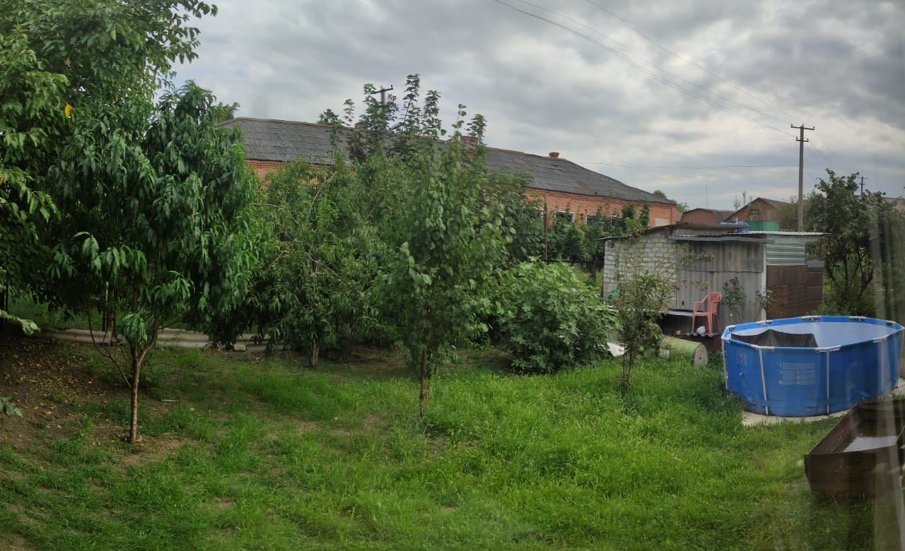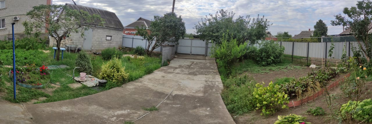 Участок частично забетонирован, вмещает 2 машиноместа. На участке есть гараж, хозпостройка, туалет, новый навес. Вид из окна - ухоженный сад: инжир, персик, груша, вишня, слива, яблоня, цветы.