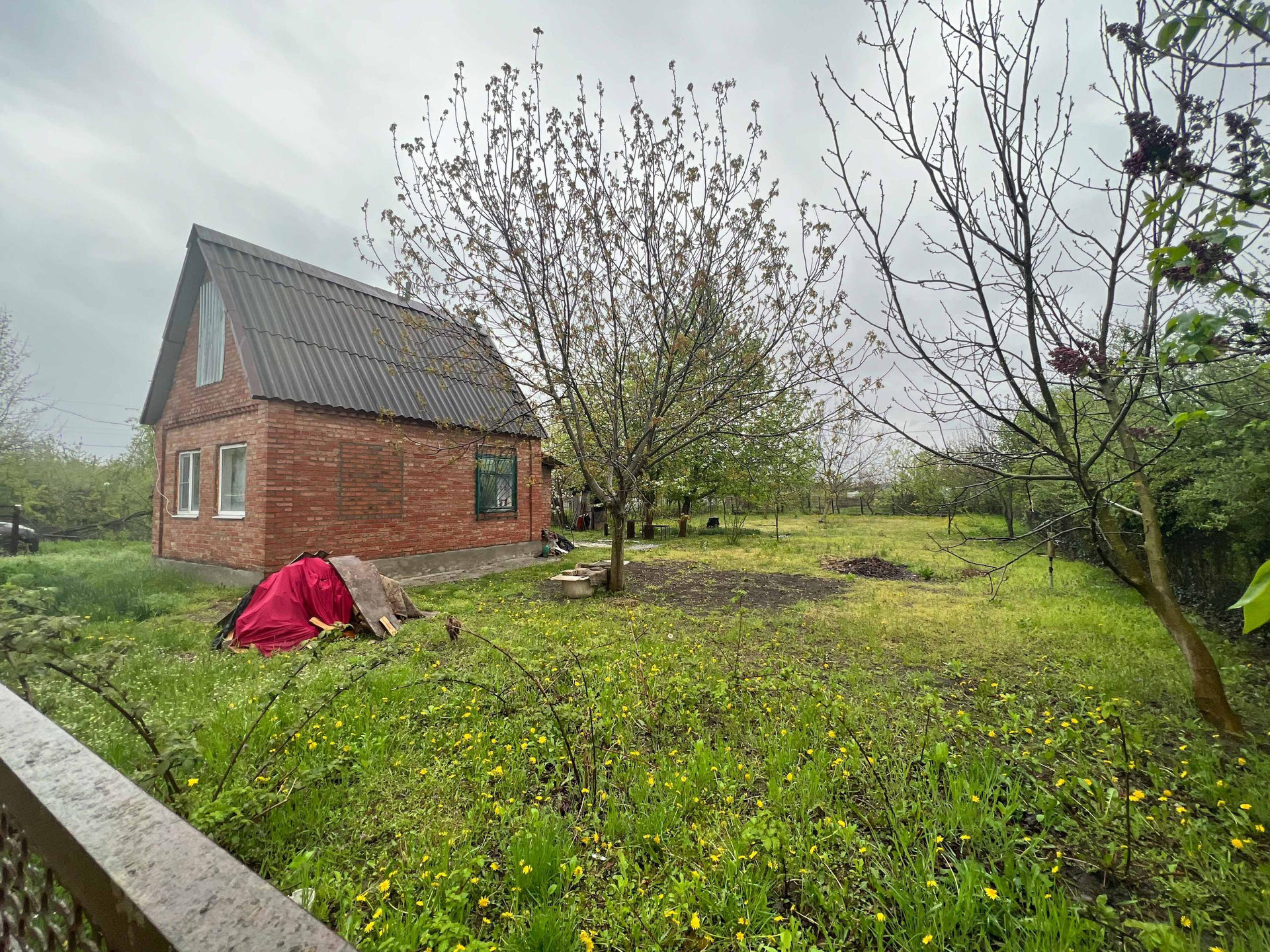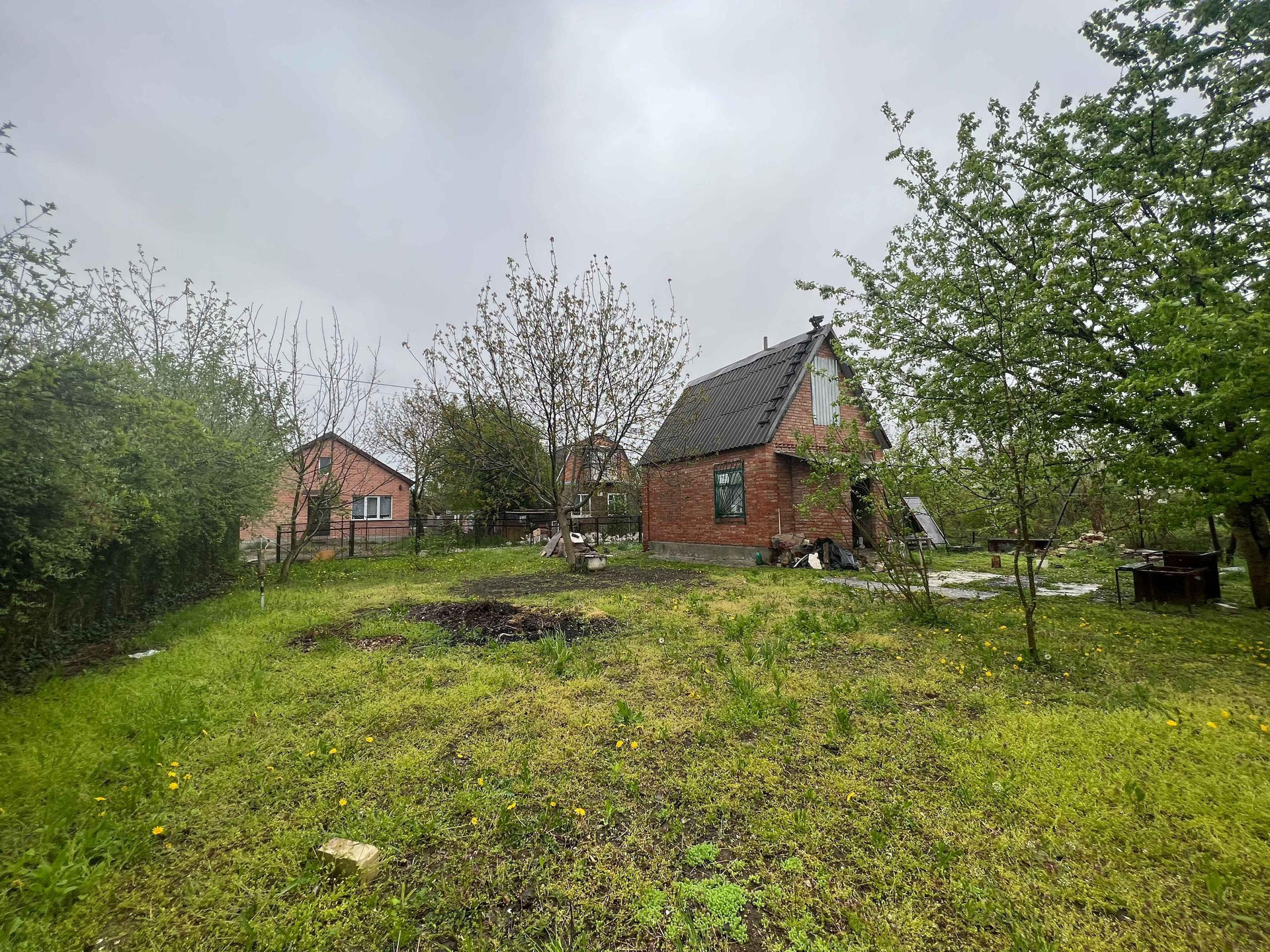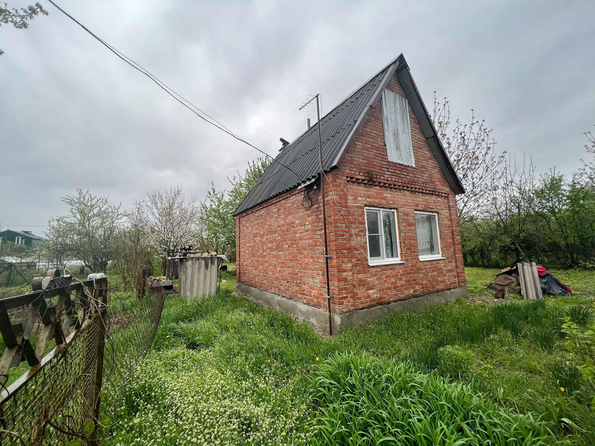 Дачный дом - пригоден для круглогодичного проживания, хозяйственные постройки, плодовый сад и огород. Имеются все необходимые коммуникации для проживания - электричество и центральная вода, печное отопление. Дом не оформлен.