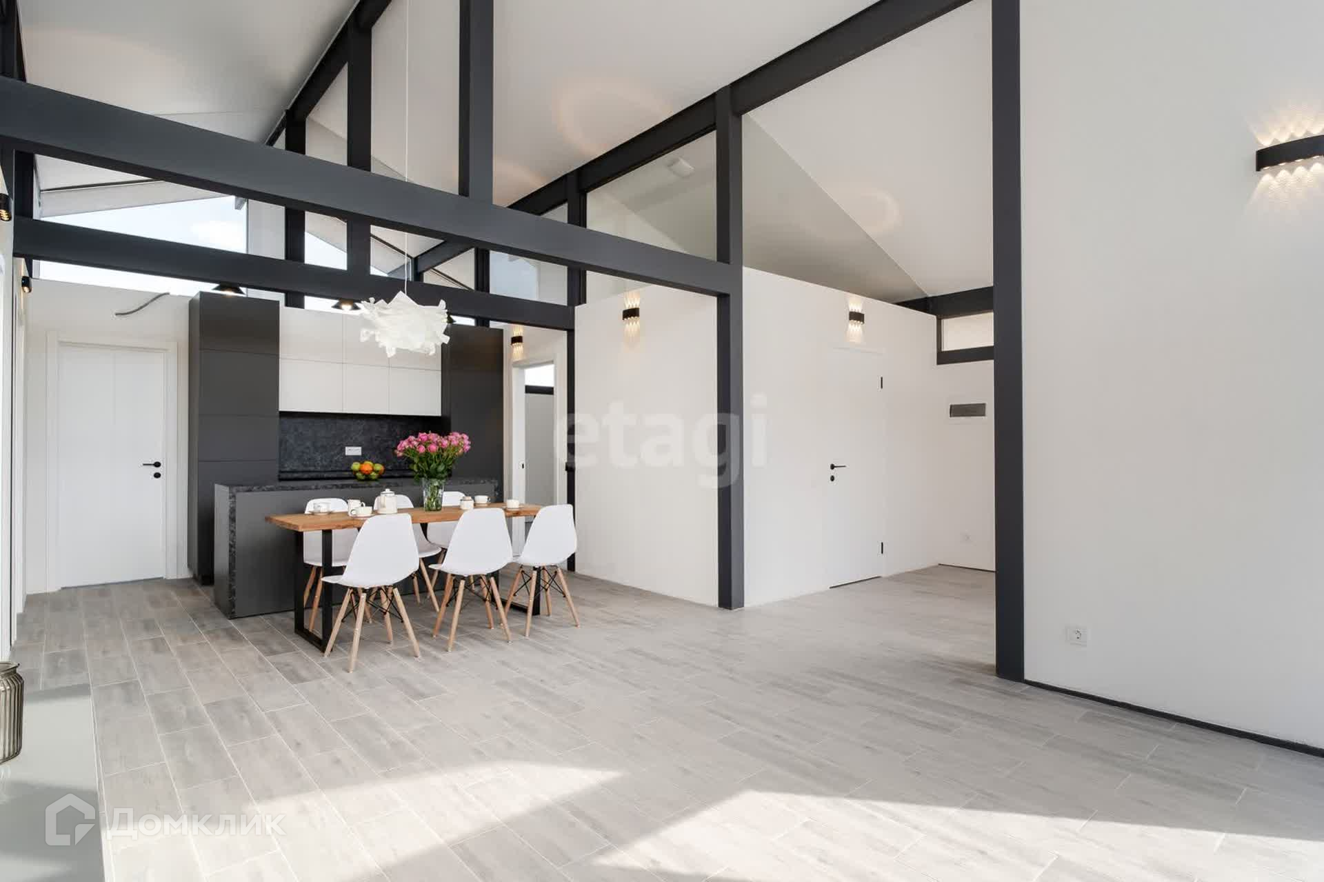 Продается Новый, современный, технологичный, очень красивый дом построенный по технологии фахверк, с дизайнерским ремонтом, в котором будет легко и уютно жить, три отдельные жилые комнаты + просторная кухня гостиная, с потолками пять метров, частично меблированный!