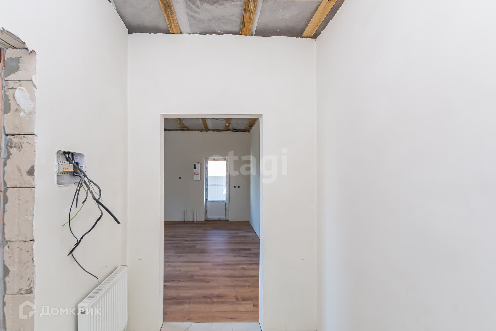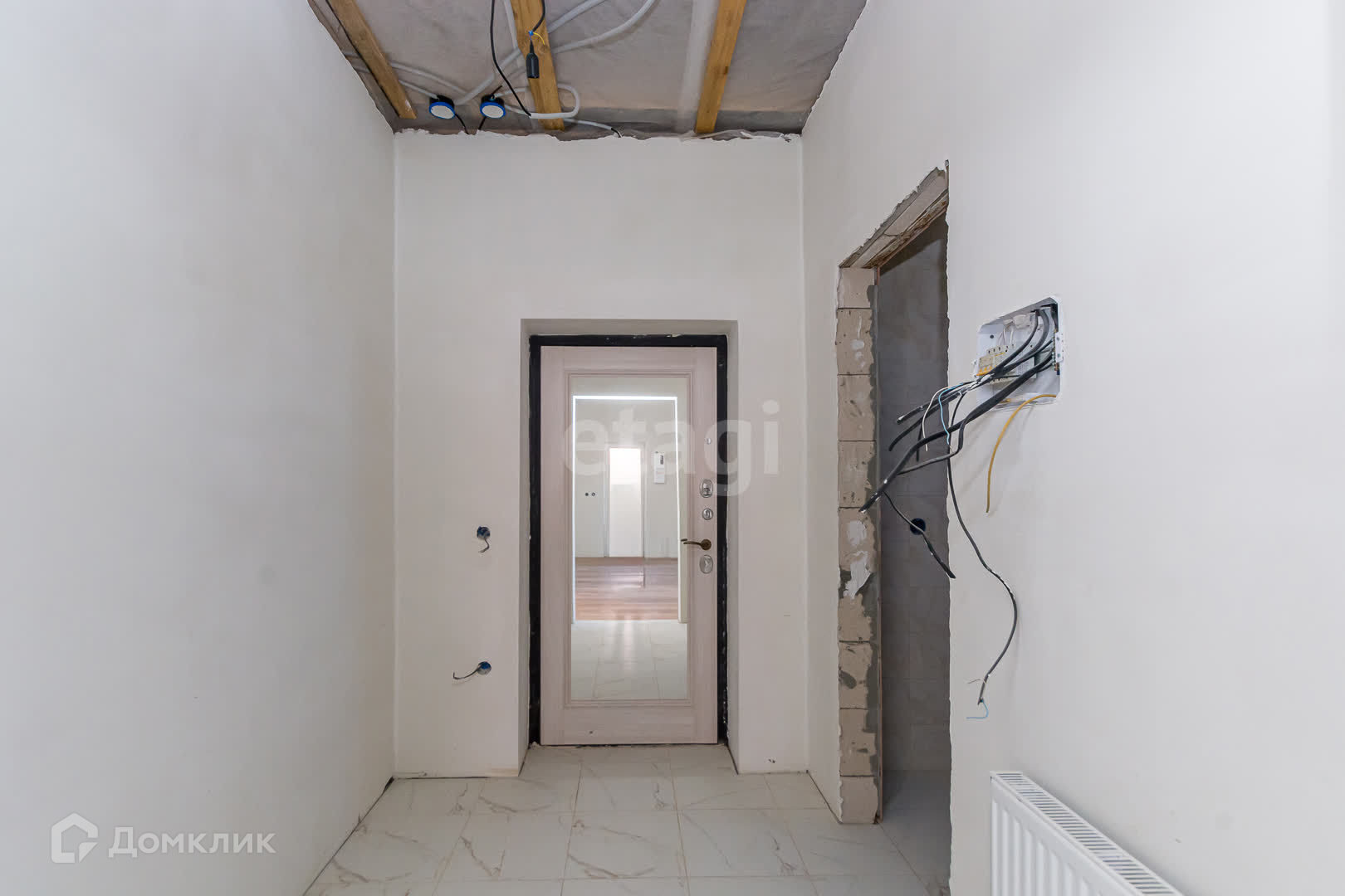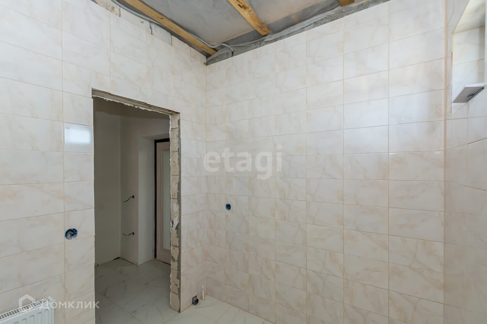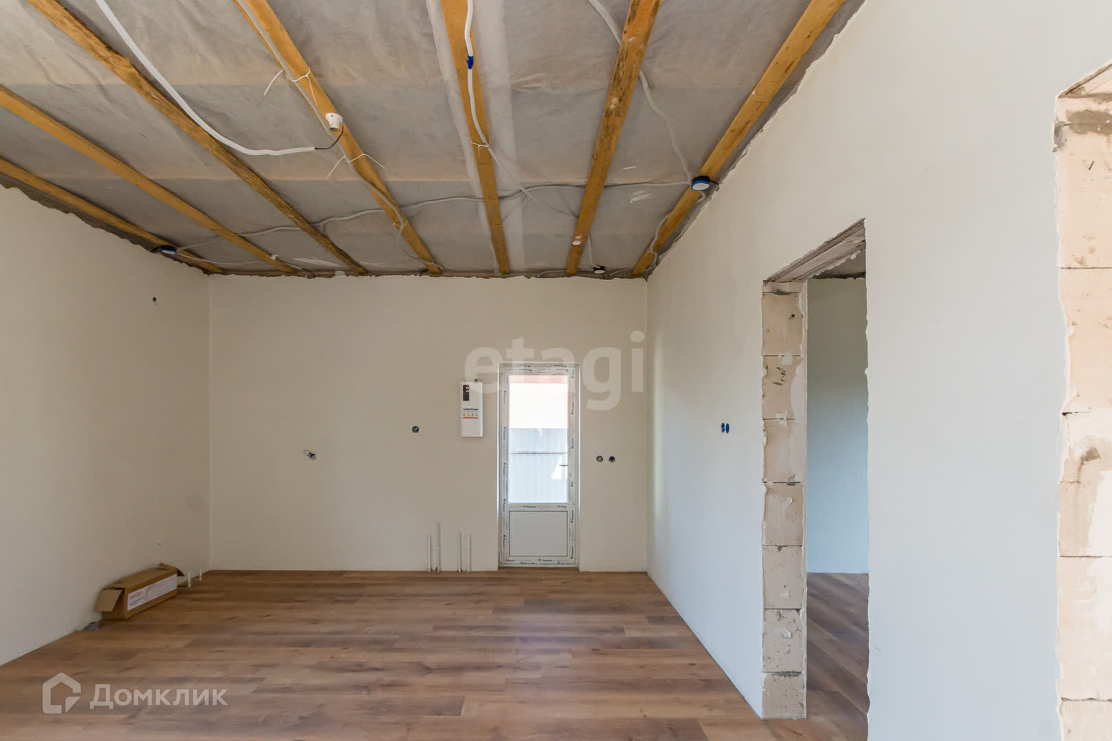 Электрика выведена, плитка выложена, на полу лежит ламинат.