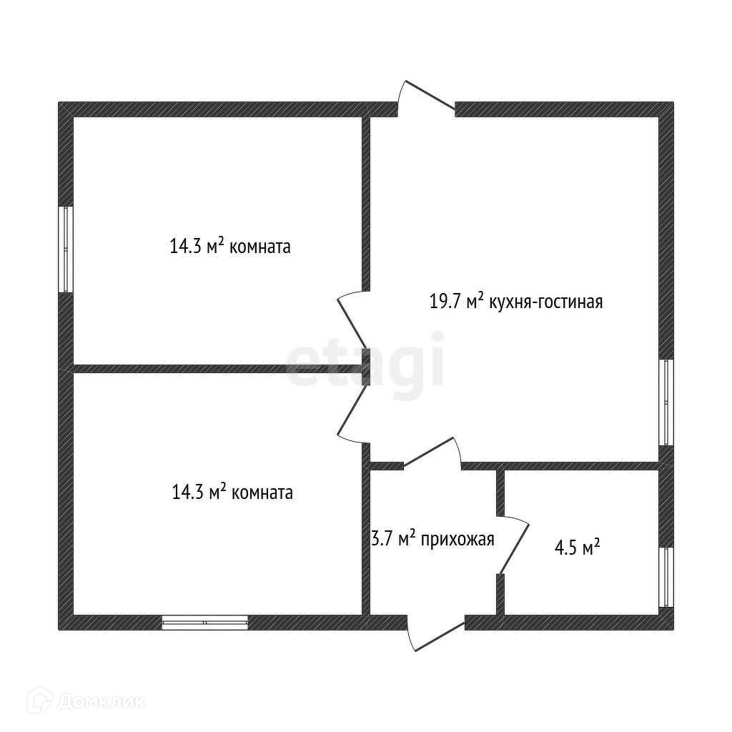 - Комнаты: 2 жилые 14,3, кухня-гостиная 19.7кв.м., вспомогательные помещения
