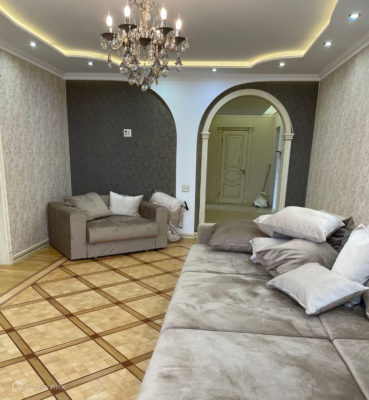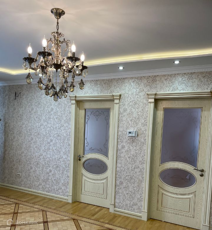Качественный ремонт в классическом стиле в светлых тонах: двухуровневые потолки из гипсокартона, на полу керамическая плитка и натуральный паркет, при отделке стен использовали влагостойкие обои и декоративную штукатурку, пилястры из гипса.