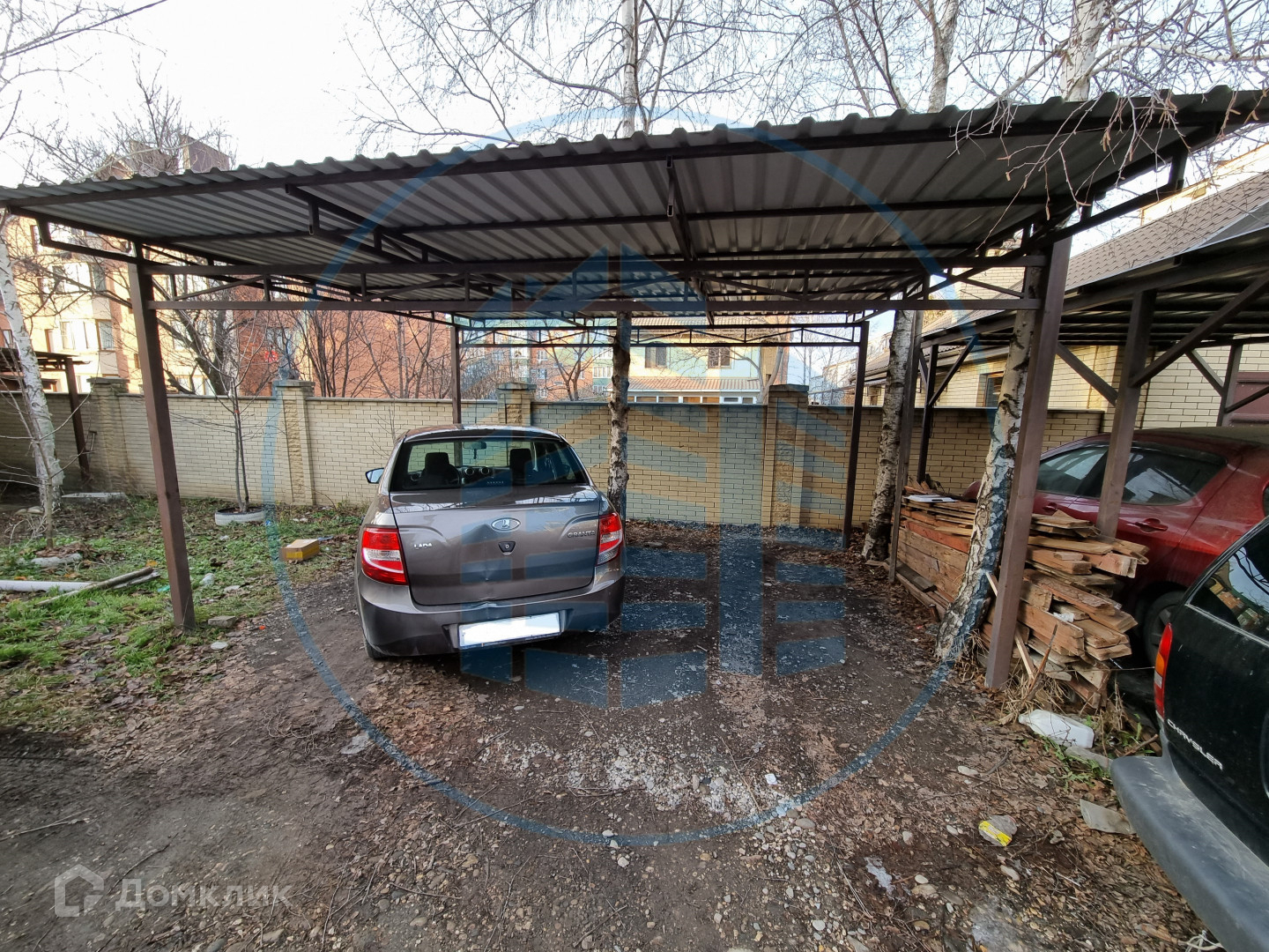 Во дворе место для парковки двух автомобилей с навесом.