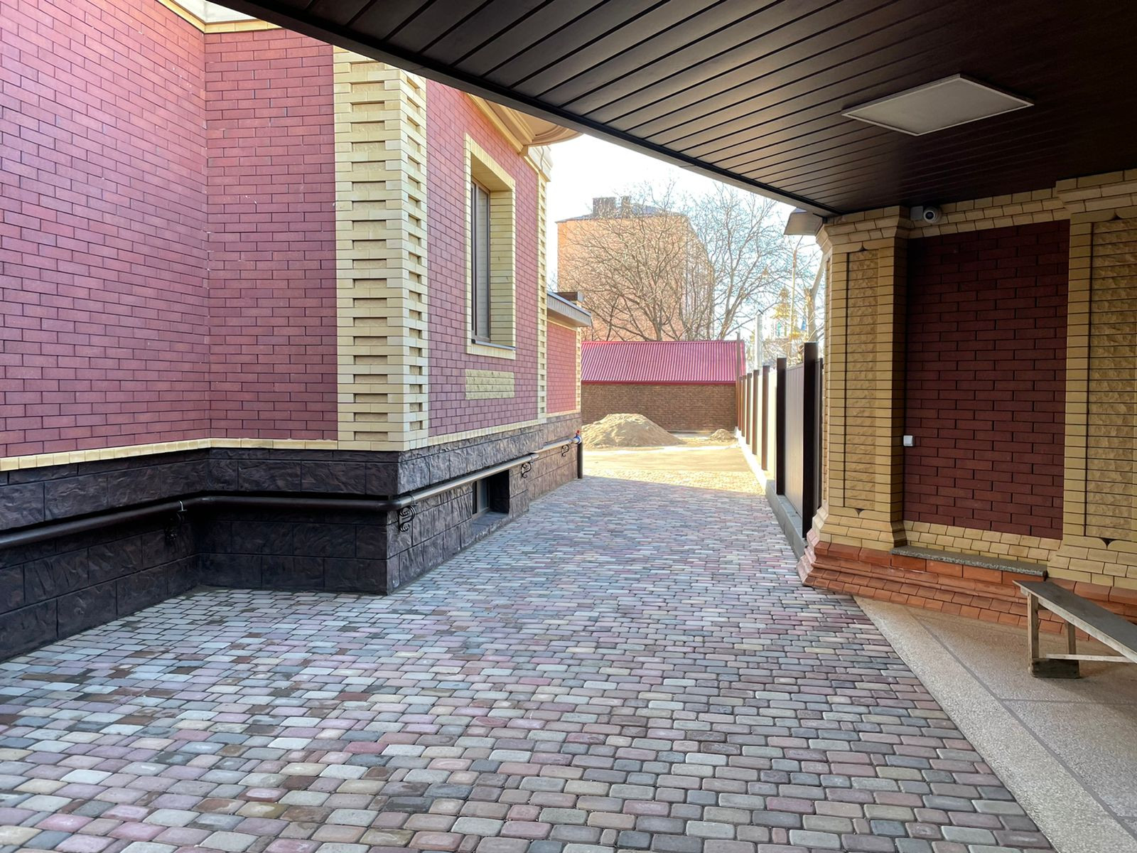Индивидуальная дворовая территория с зоной барбекю. Въезд во двор через шлагбаум.