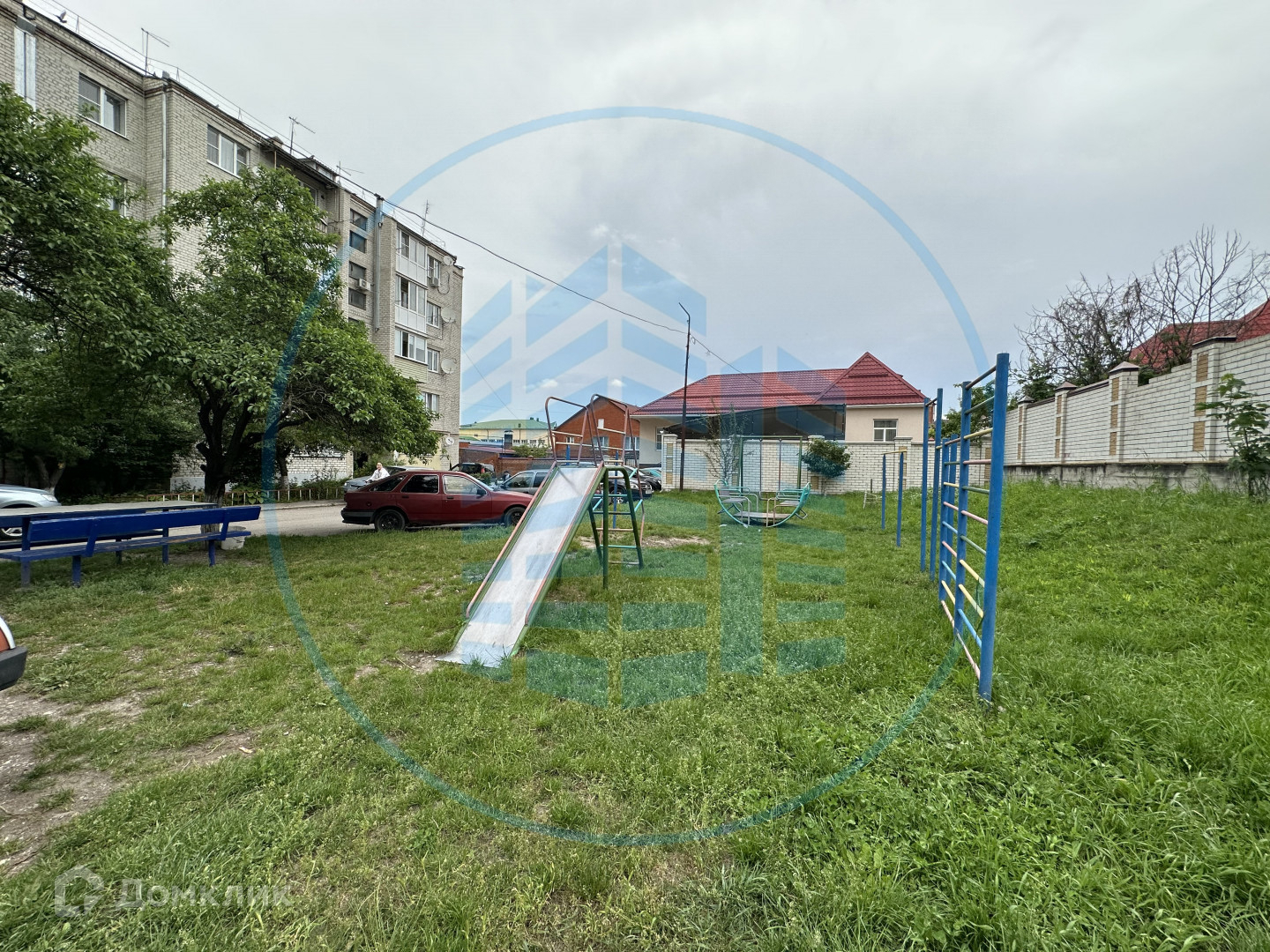 Озелененная территория двора с детской площадкой, парковка.