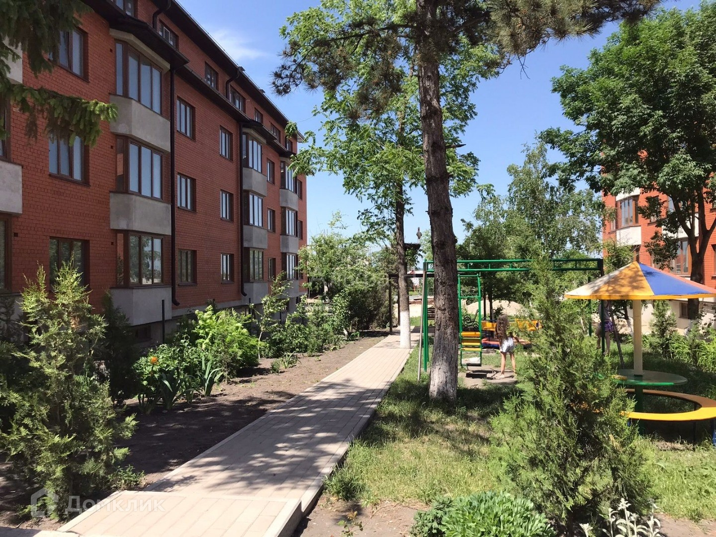 Территория дома огорожена, есть детские площадки, места для отдыха и прогулок.