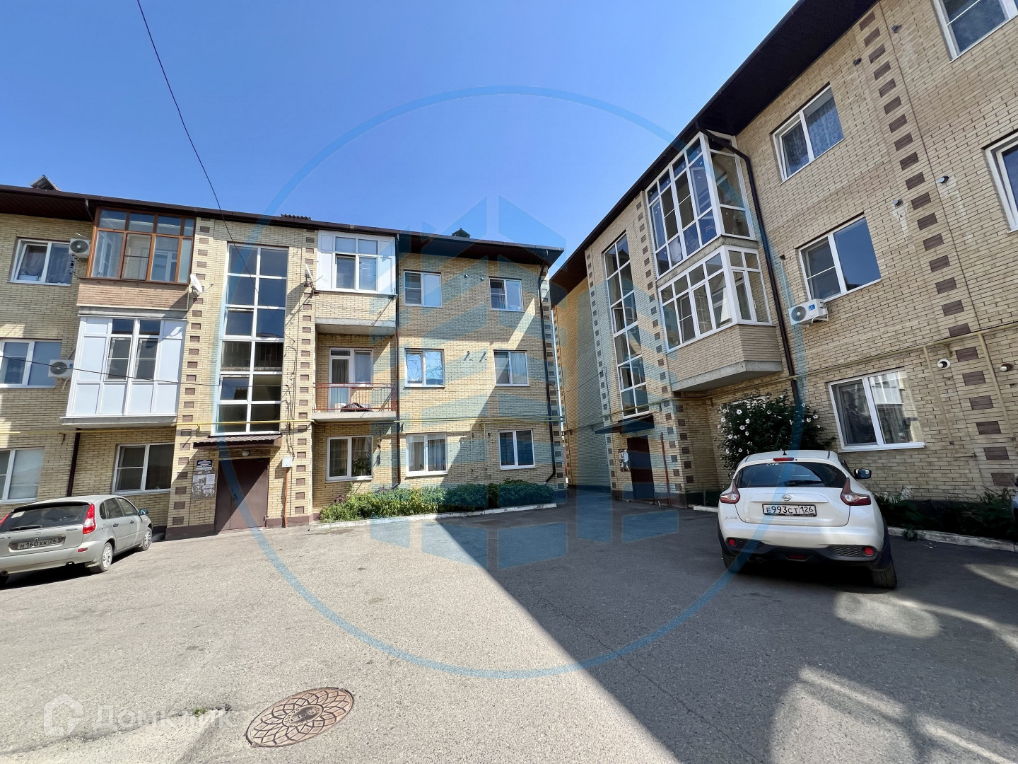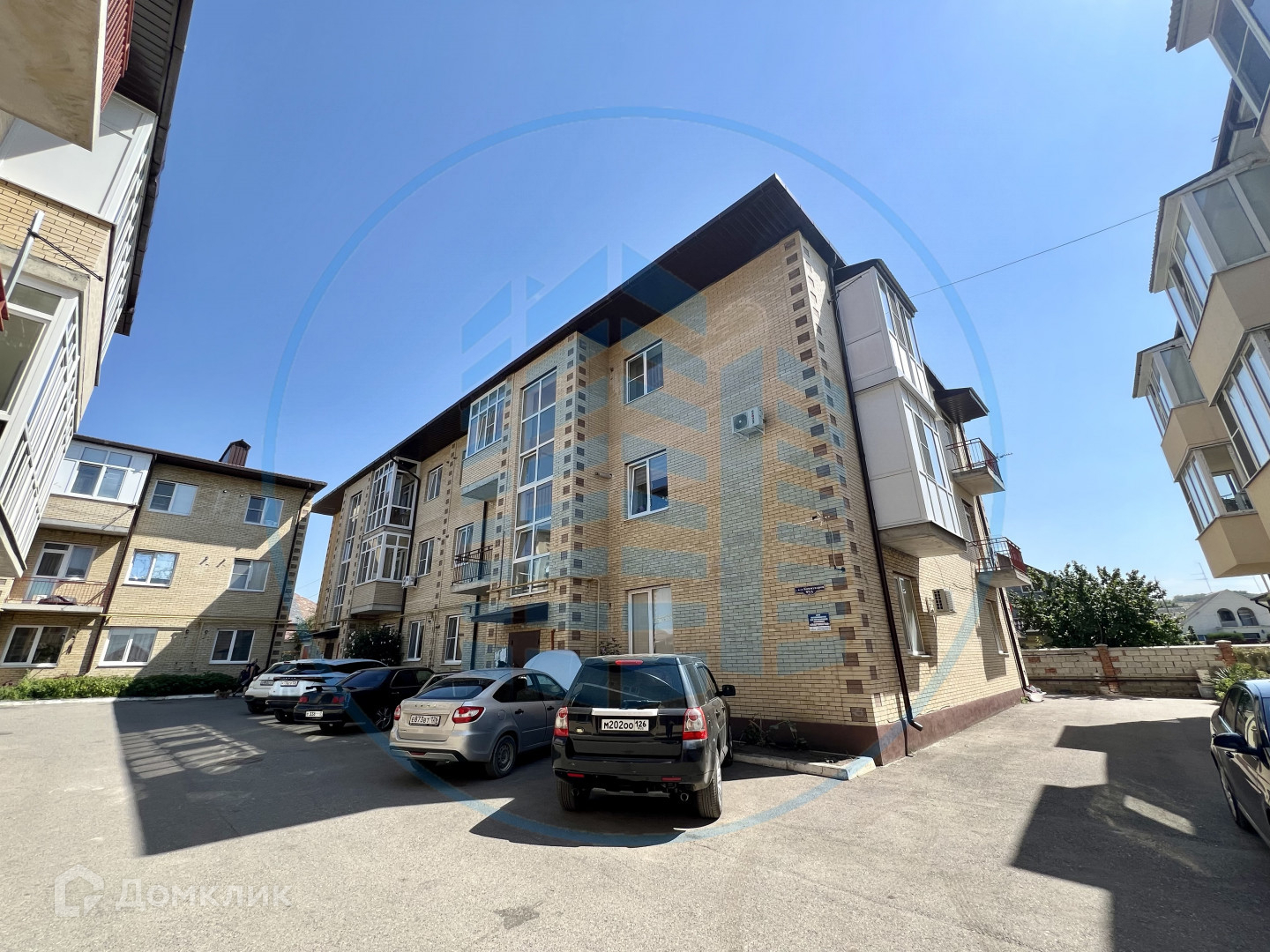 Детская площадка во дворе дома и места для парковки.