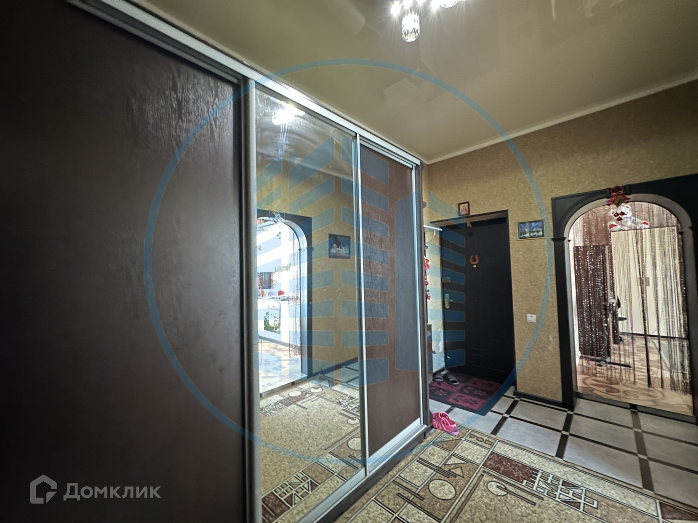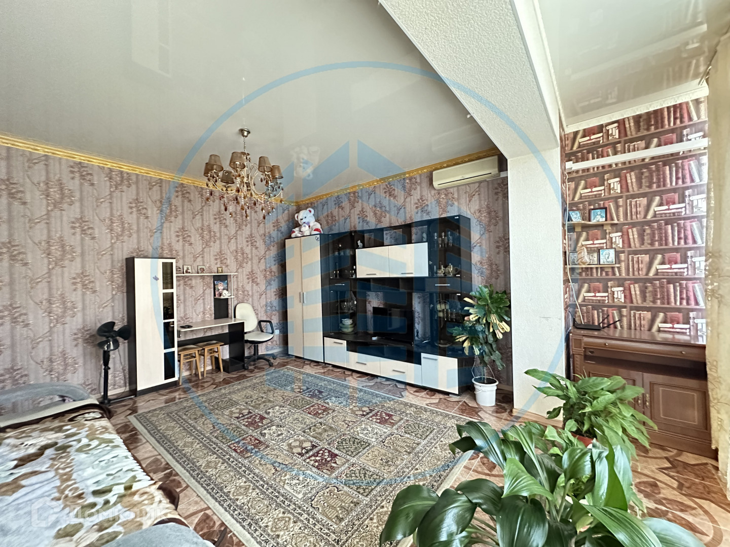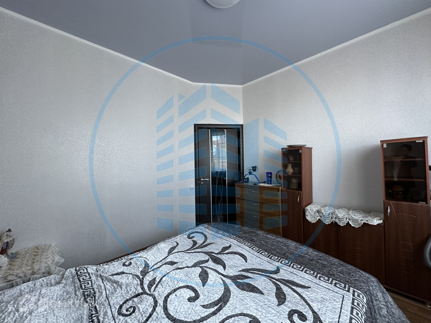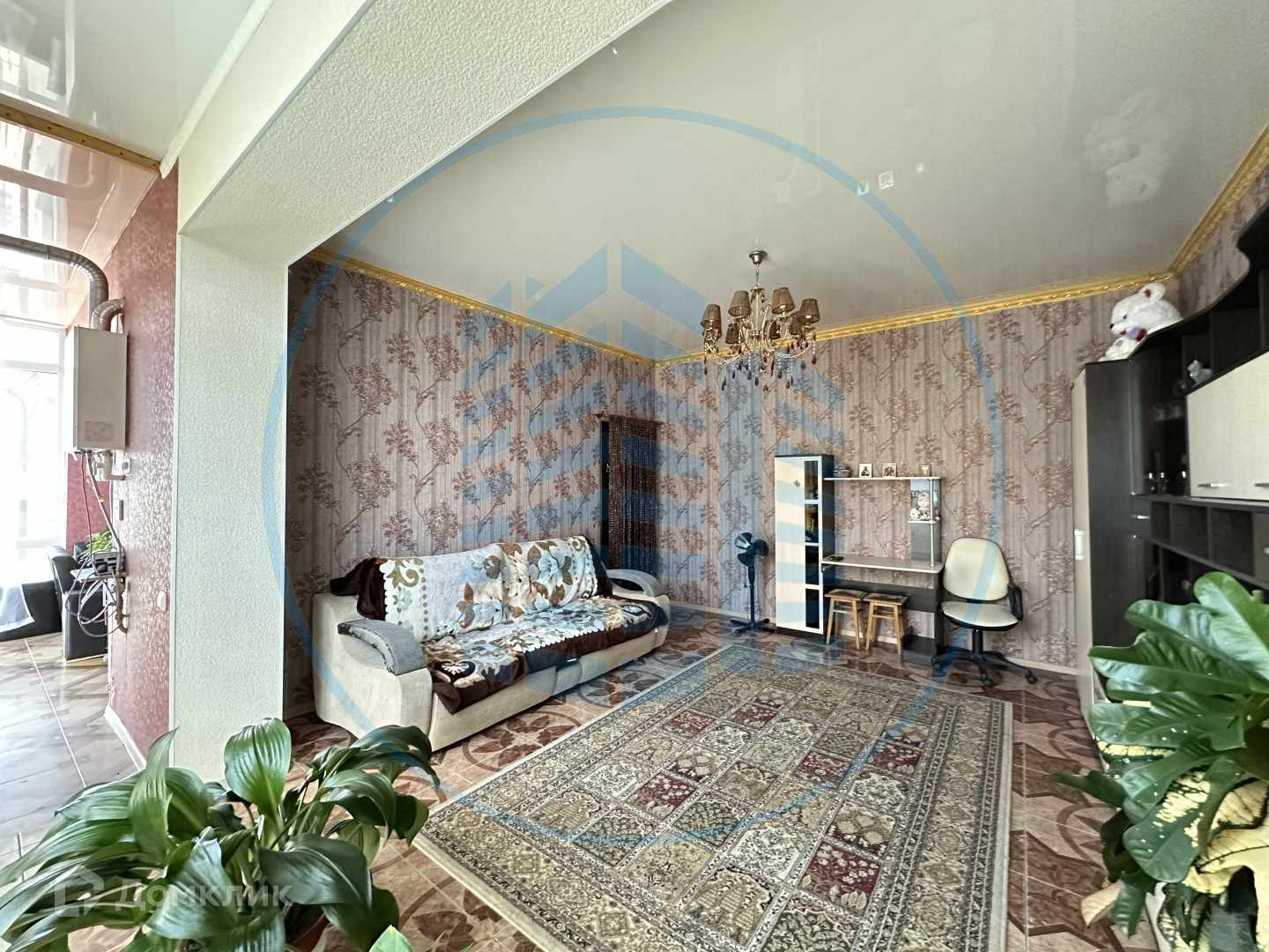В кухне, сан/узле и прихожей теплый пол, покрытие- керамическая плитка, в спальне и гостиной- ламинат; натяжной потолок; на стенах-обои.
