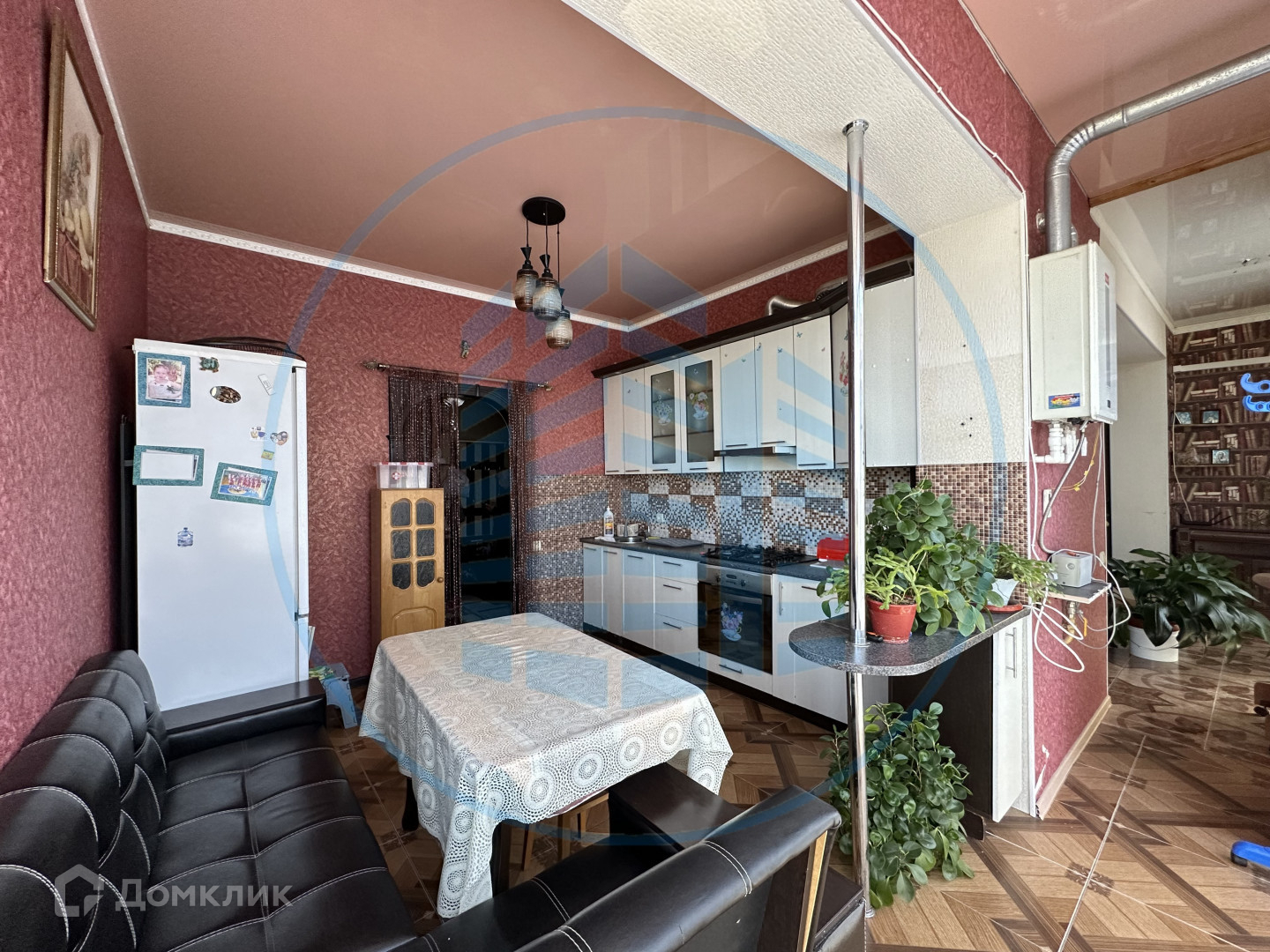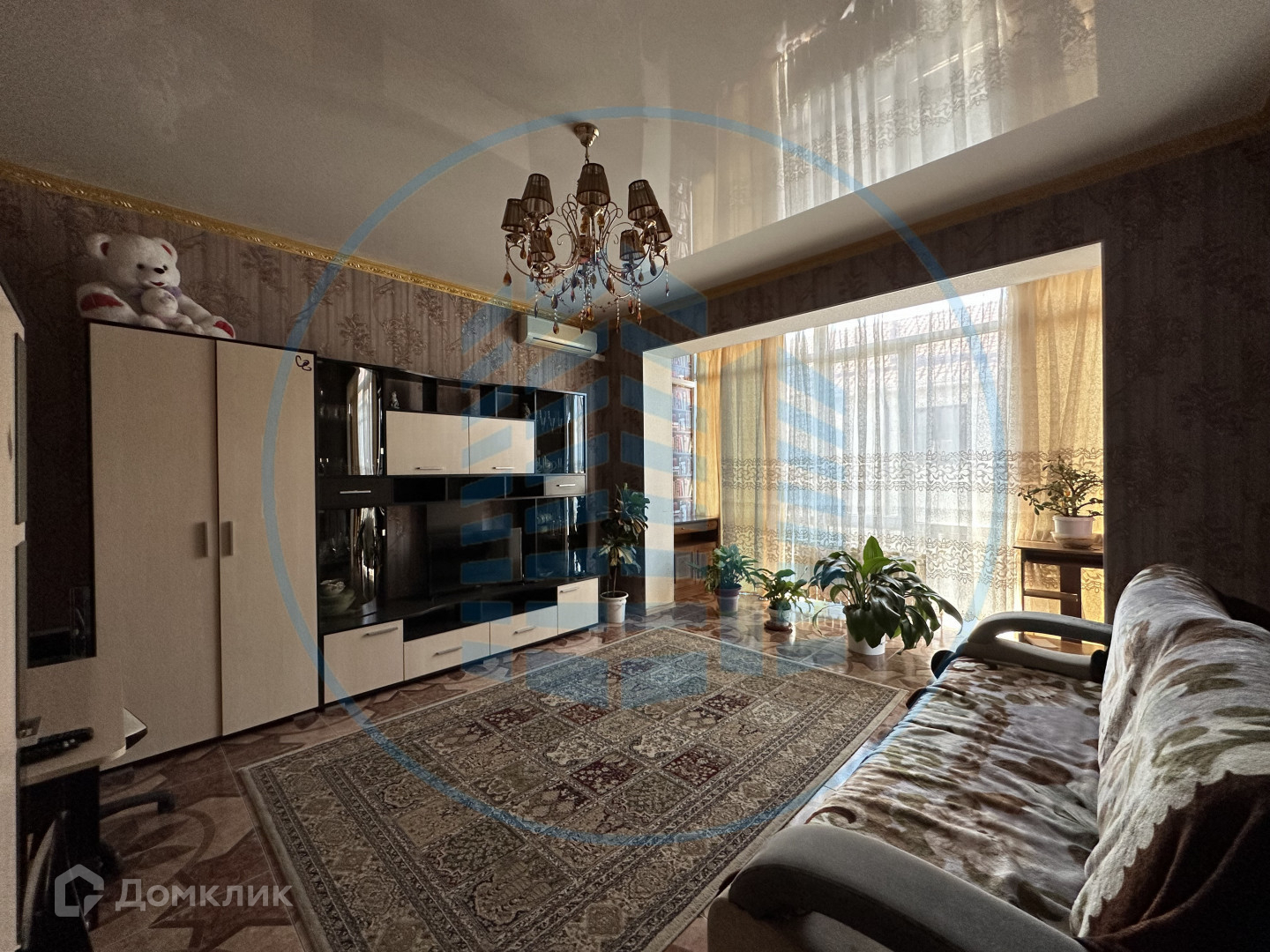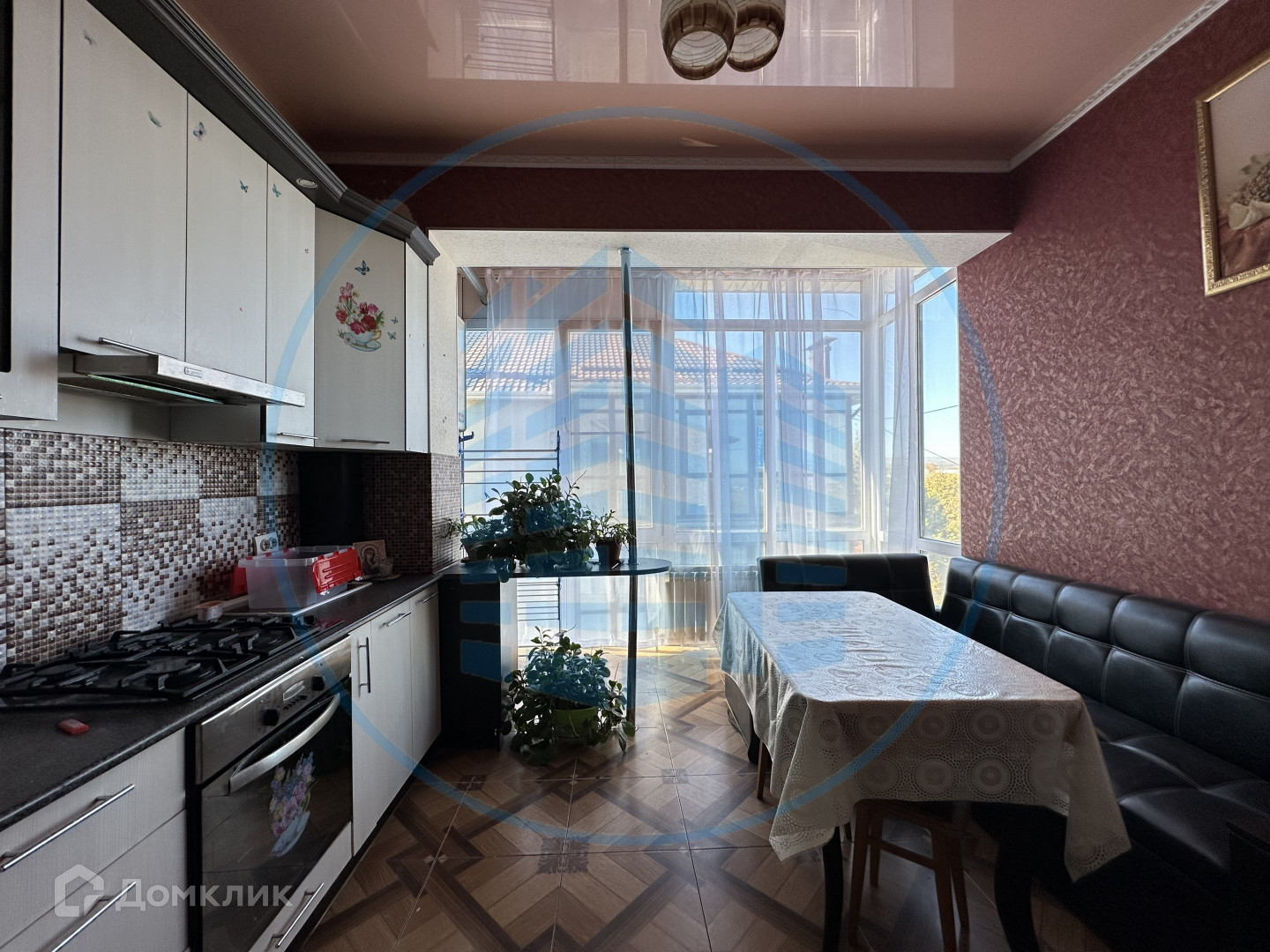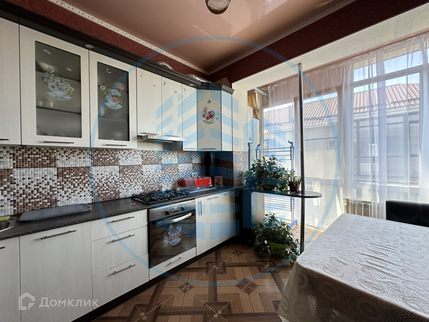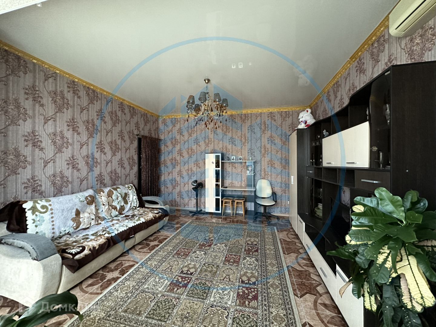 В кухне, сан/узле и прихожей теплый пол, покрытие- керамическая плитка, в спальне и гостиной- ламинат; натяжной потолок; на стенах-обои.