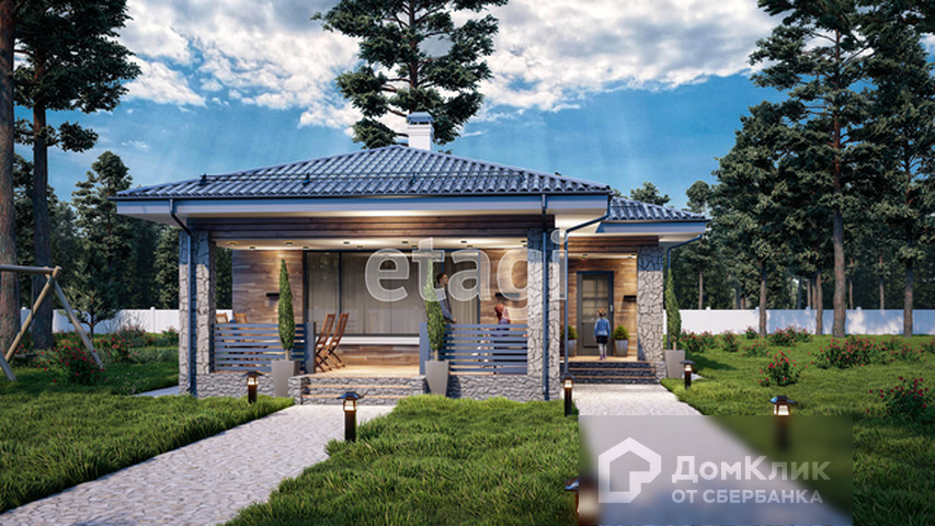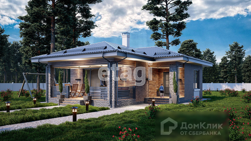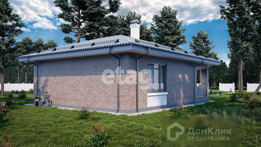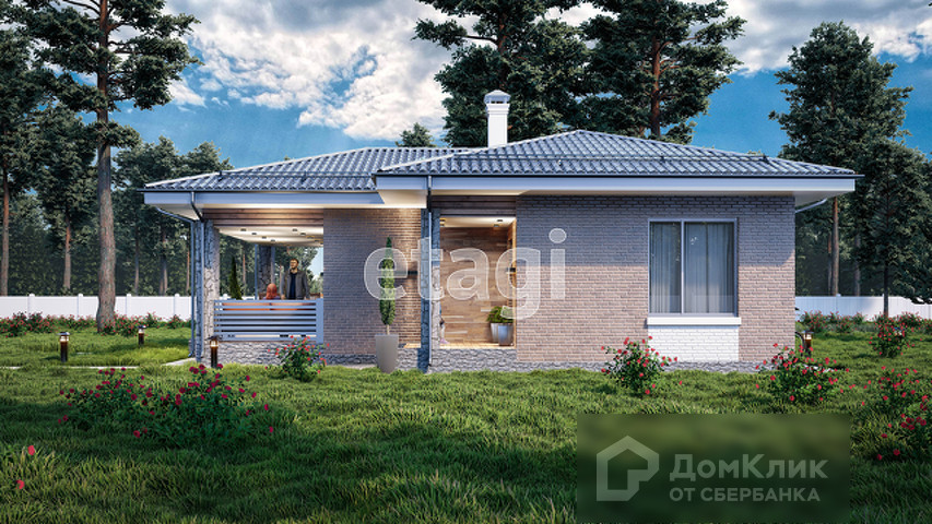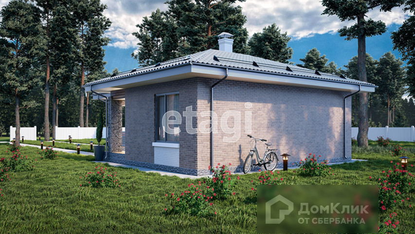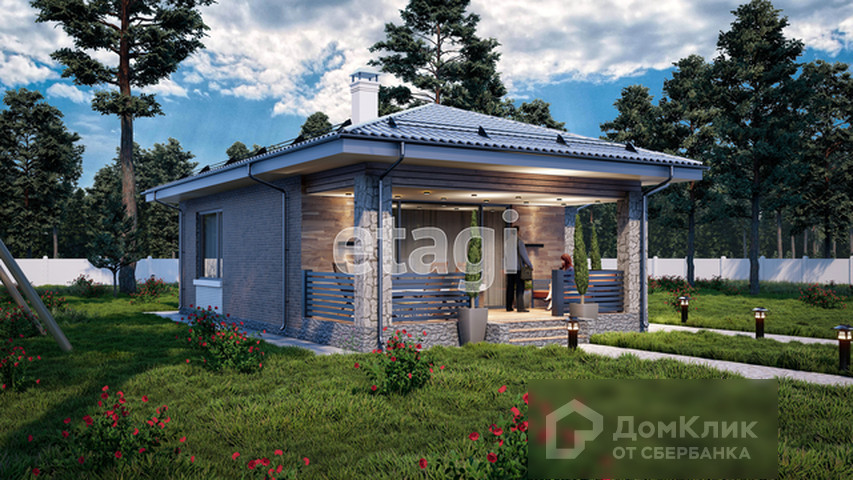 Одноэтажный дом с террасой площадью 60 кв. м. с земельным участком в 4 сотки. В доме 2 комнаты площадью - 10 и 14 кв. м., просторная кухня-гостиная 23 кв. м. с выходом на террасу (18,6 кв. м.), санузел совмещенный - 5 кв. м. и холл 7 кв. м.