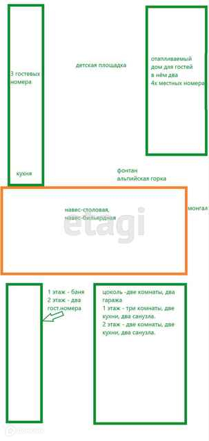 Дополнительно на территории имеются капитальные постройки: дом для гостей (отапливаемый, два 4х местных номера с санузлами и сплитами), дом для гостей (4 номера), баня (баня и 2 номера), дополнительные два туалета и два душа, кухня на территории, навес-столовая, навес-бильярдная, детская площадка, мангал, альпийская горка.