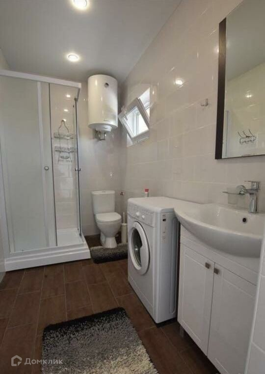 На первом этаже просторный холл, совмещённый санузел с душевой кабиной, стиральной машиной и новым электрическим водонагревателем. Дом располагается чуть выше уровня улицы, поэтому во время дождей остаётся СУХИМ!