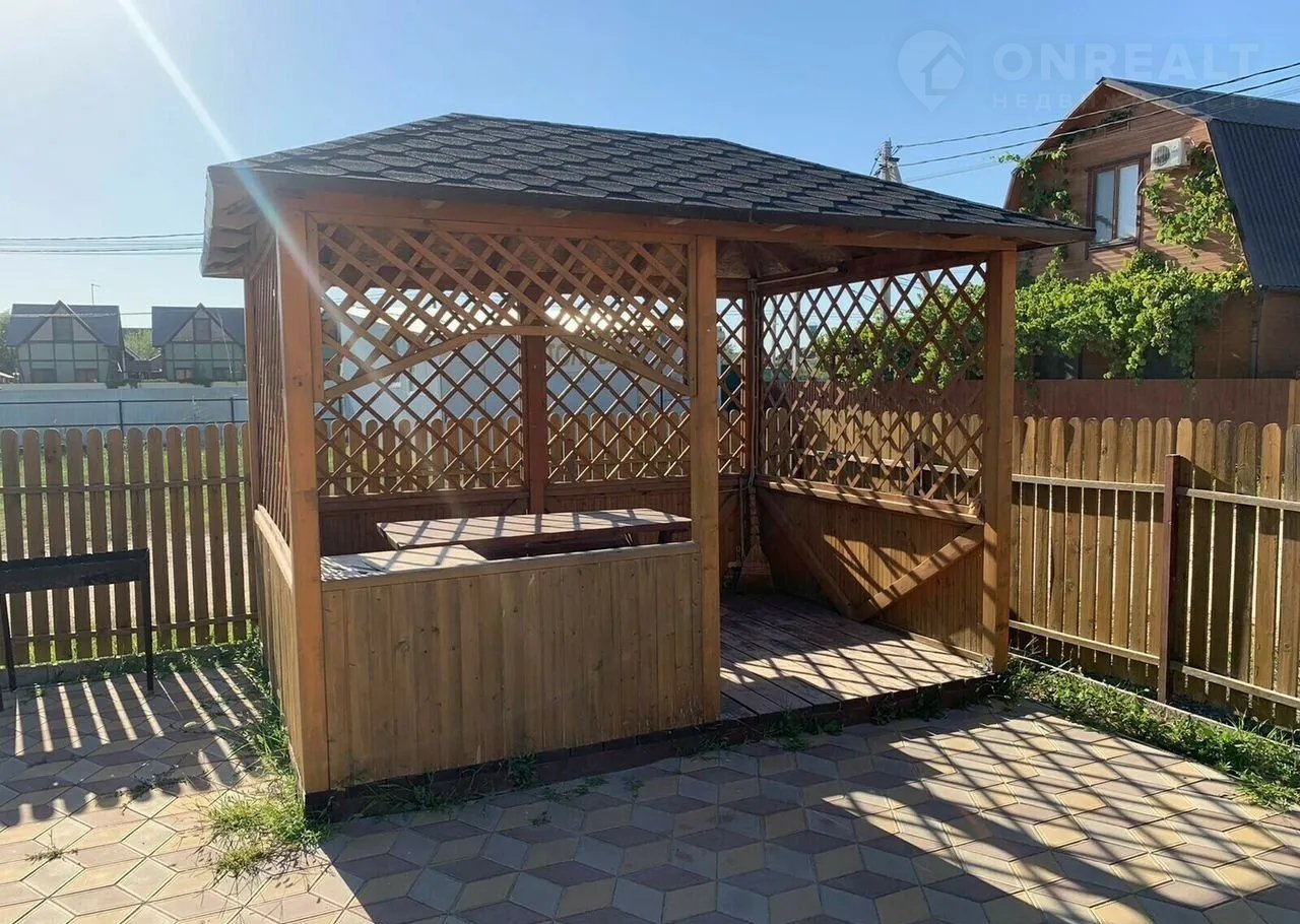Во дворе есть зона для отдыха: беседка, мангал, детская площадка. Перед домом площадка выложенная тротуарной плиткой.
