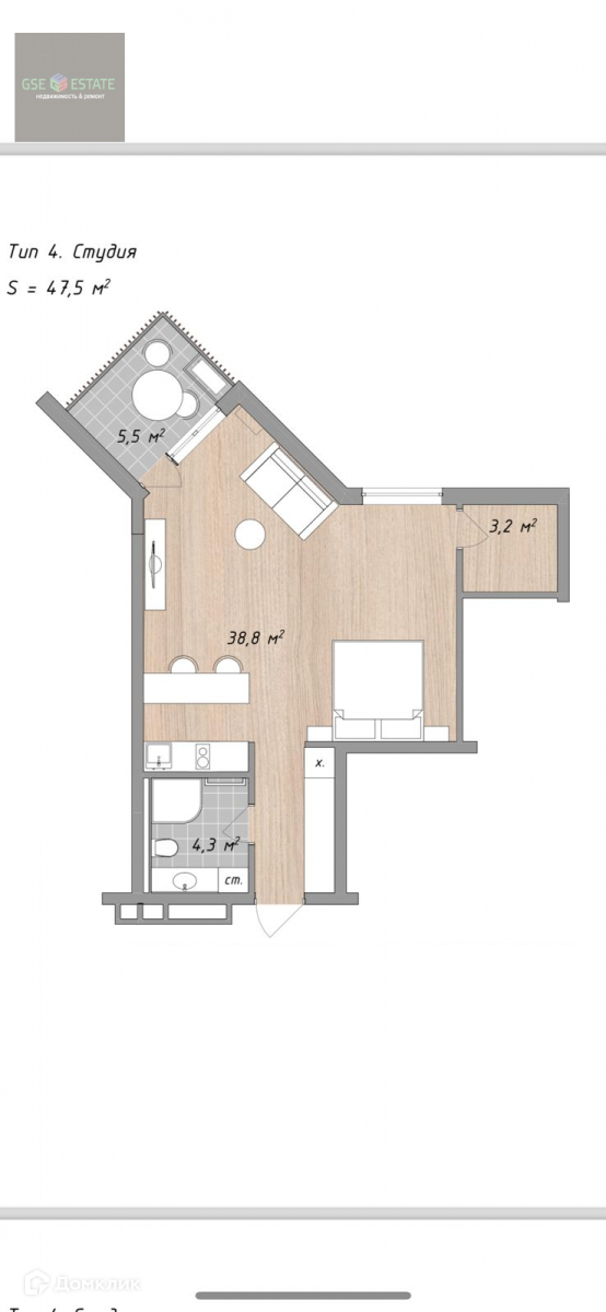 Общая площадь 47.5 м2