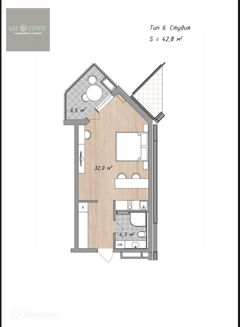 Общая площадь 42.8 м2