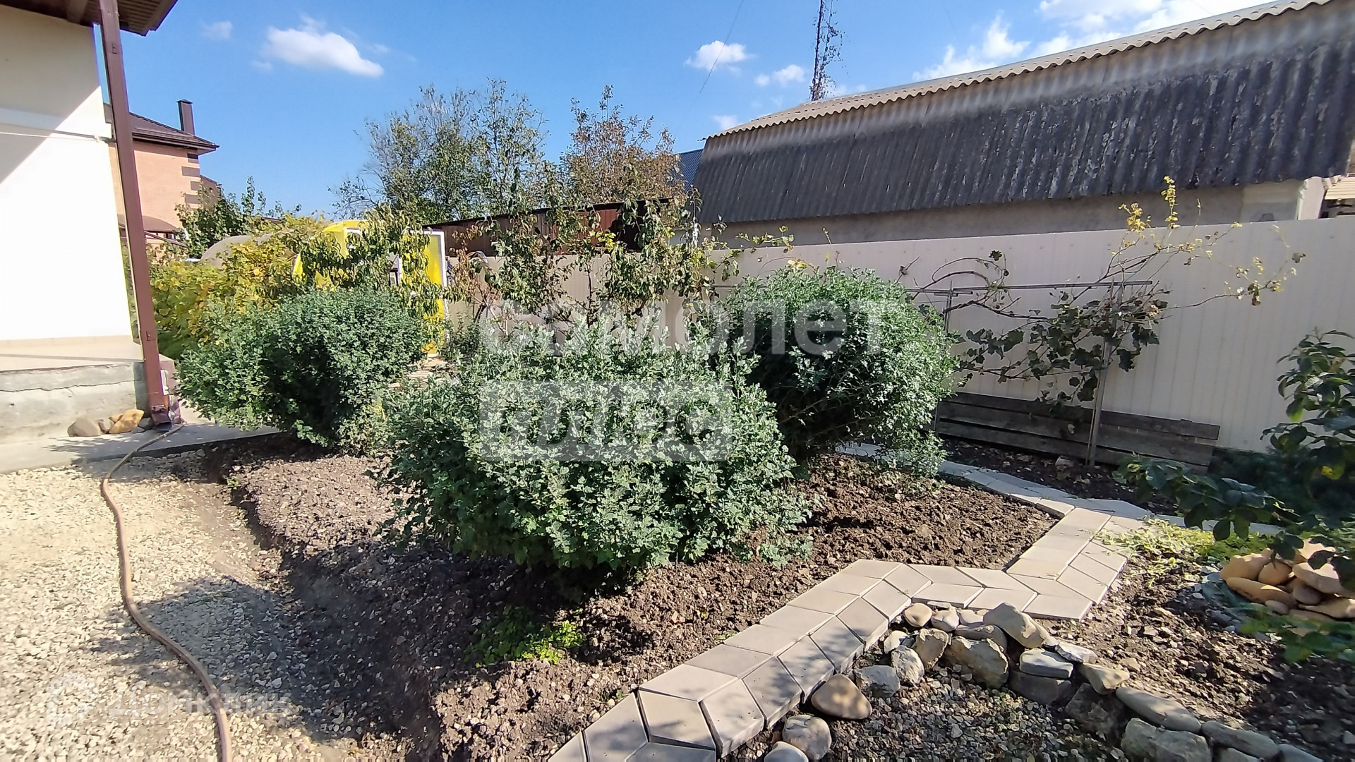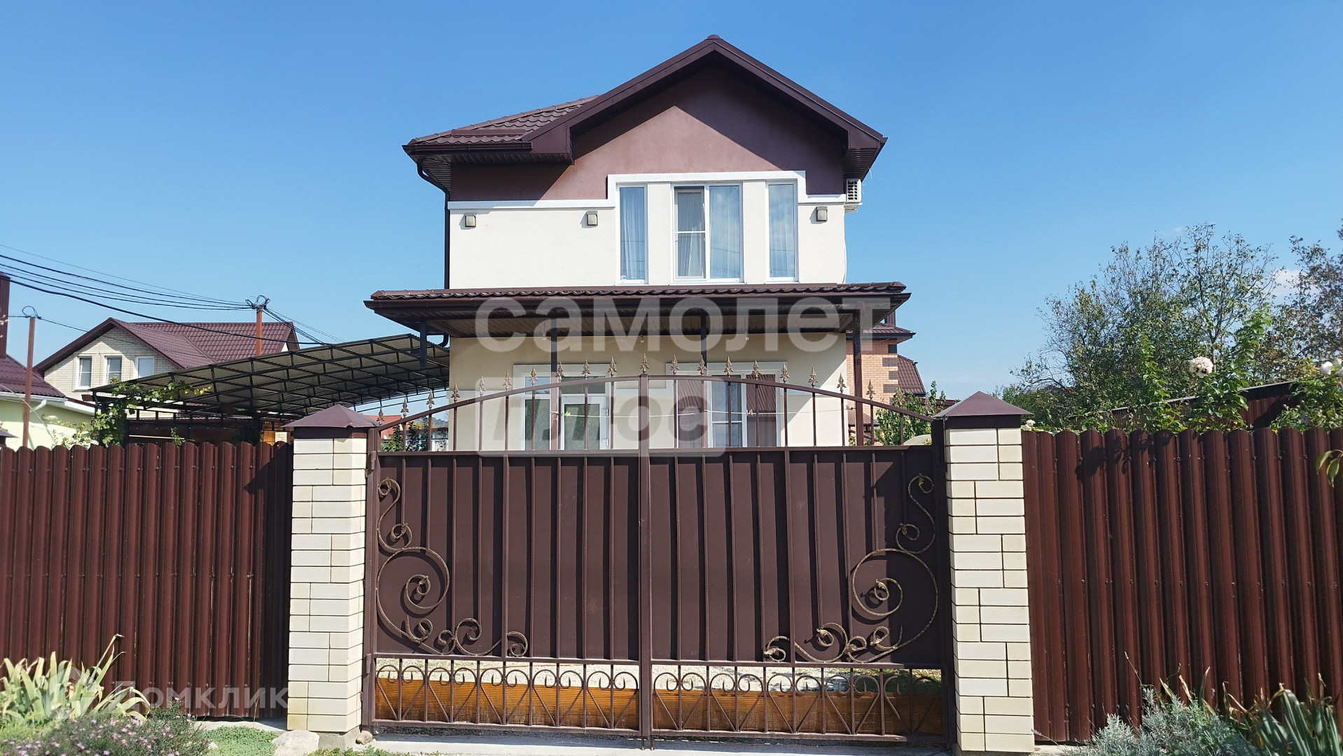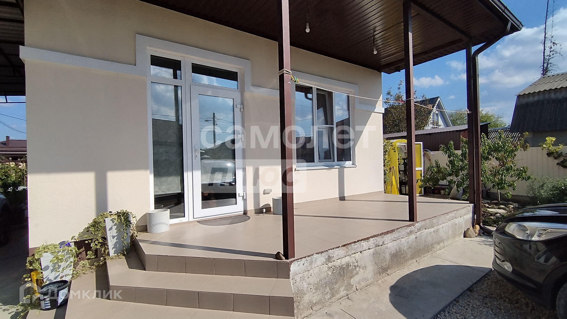 Он окружен участком в 4,7 соток, на котором расположен навес для двух автомобилей.